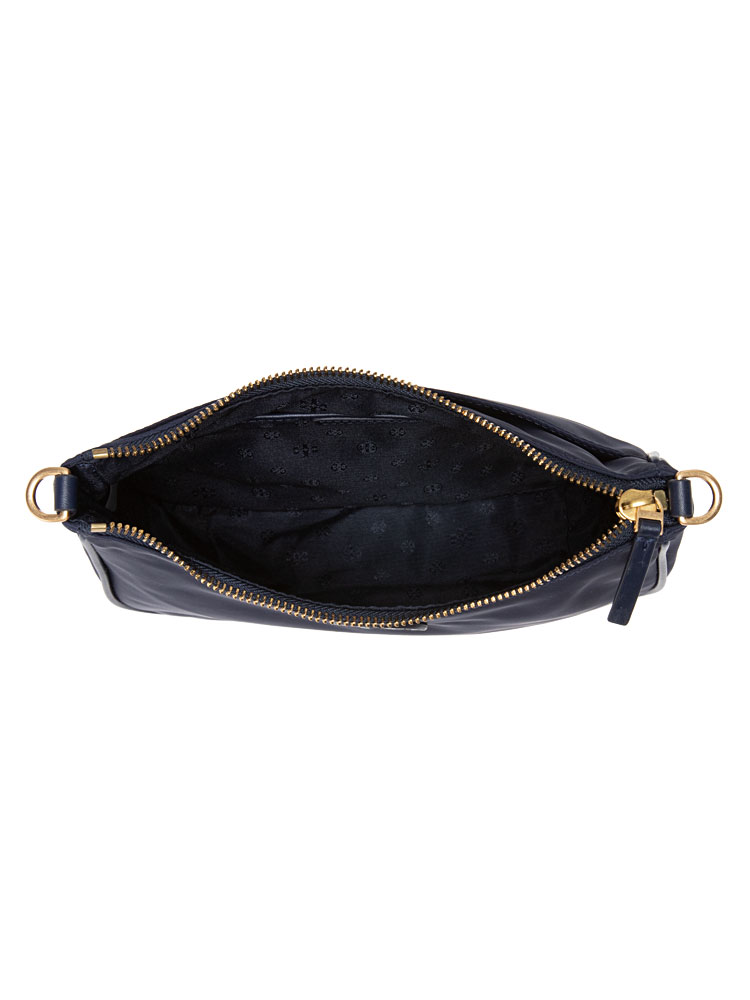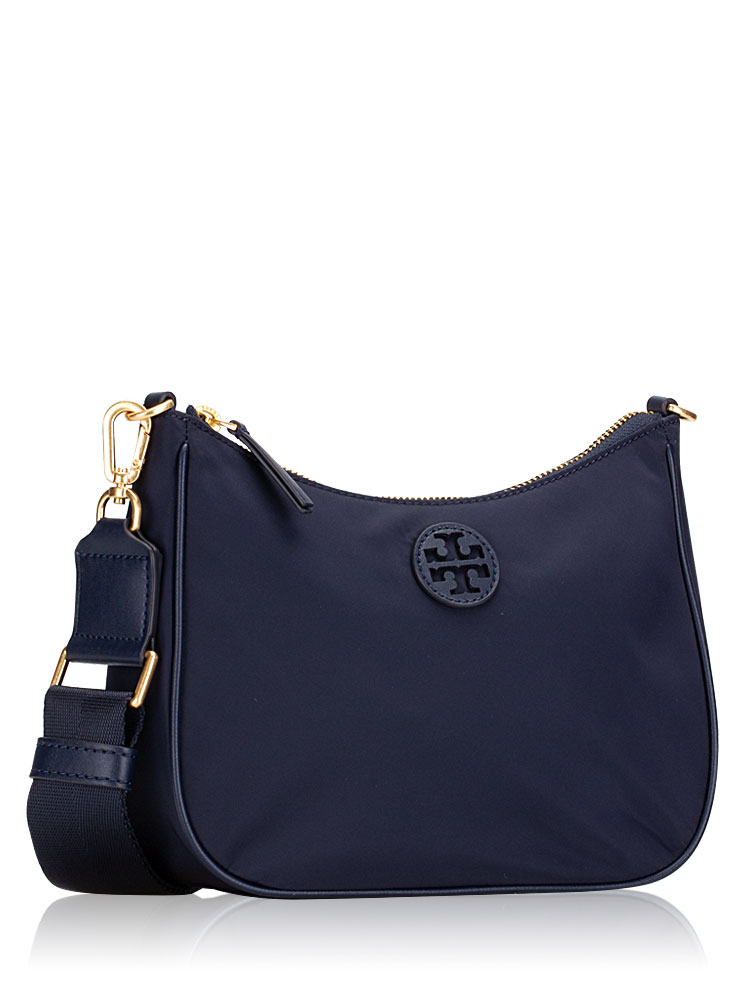 Crafted from durable nylon, the bag features an optional nylon webbing shoulder strap. The top zipper opens to signature fabric lining in matching color, and a slip pocket. Decorated by Tory Burch leather logo at front side.