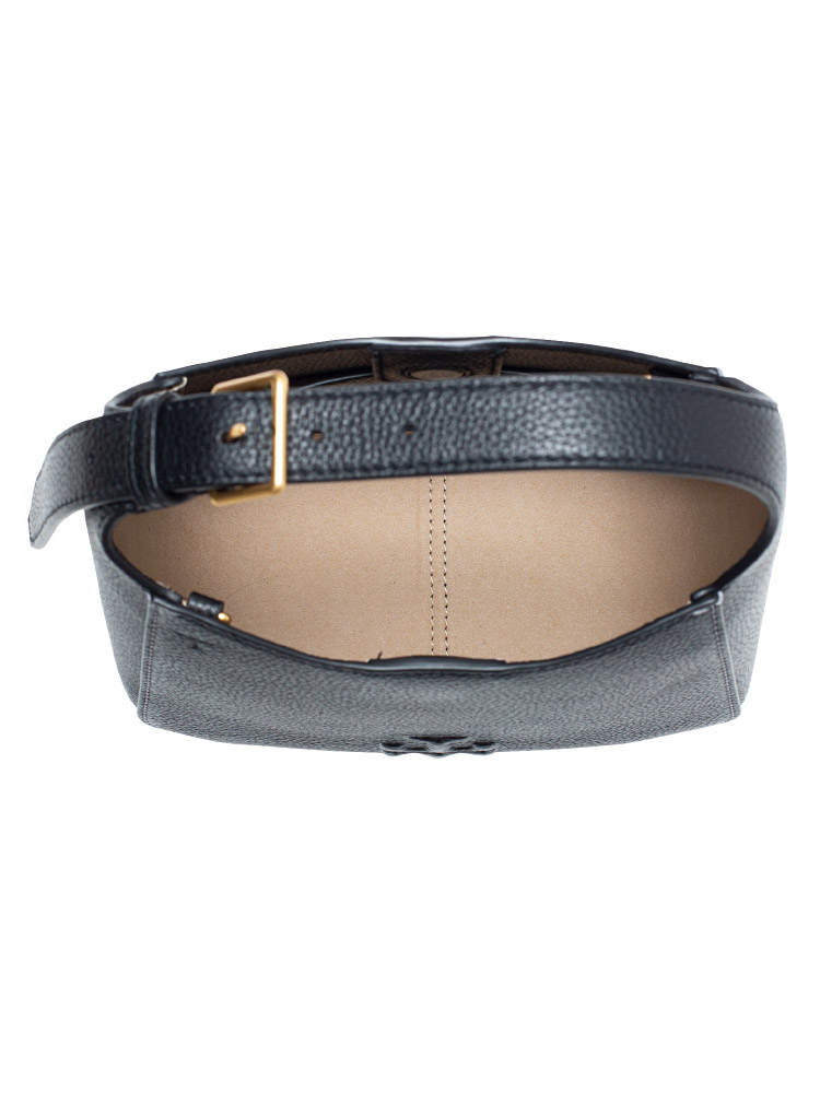 Made of leather. The bag features a snap closure that opens to suede lining with one slip pocket, adjustable and removable strap, adjustable handle strap.