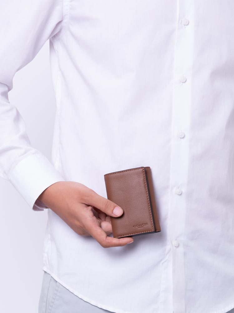 Made of calf leather, this trifold wallet is perfectly sized for cards and cash. It features a bill compartment, 9 card slots, and 2 side card slots.