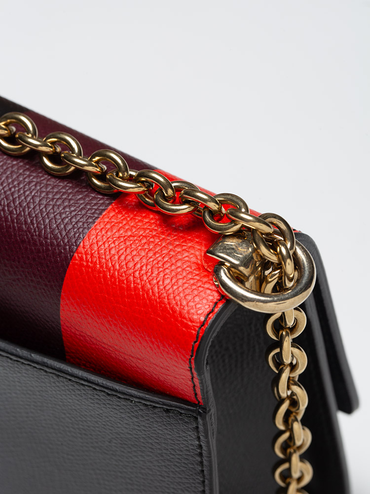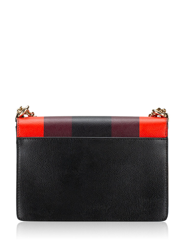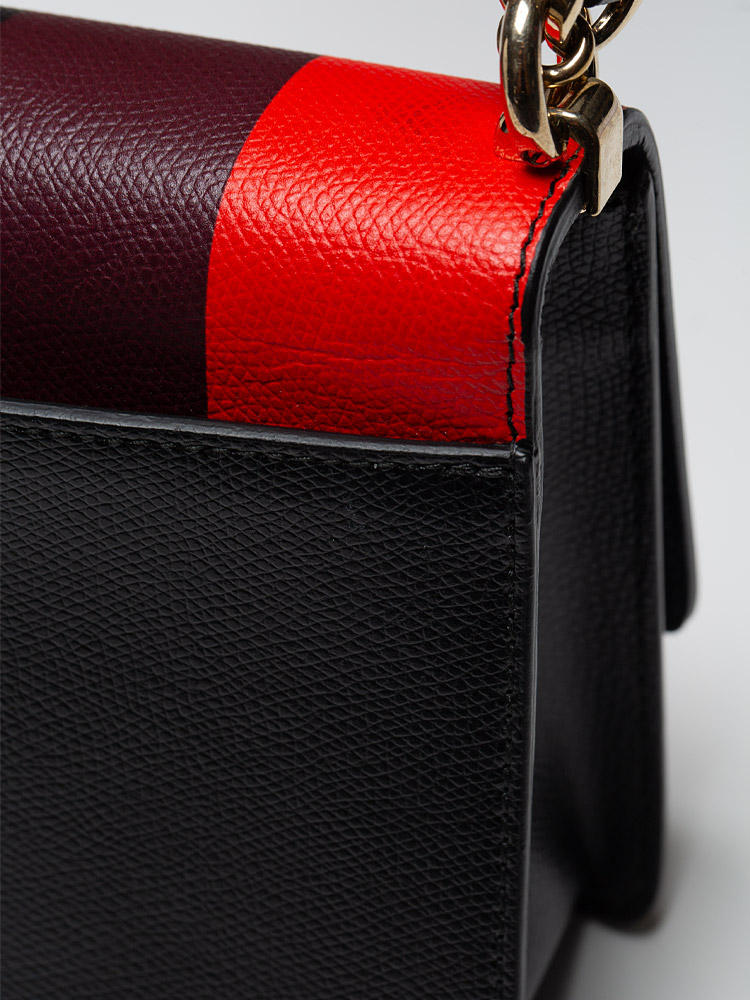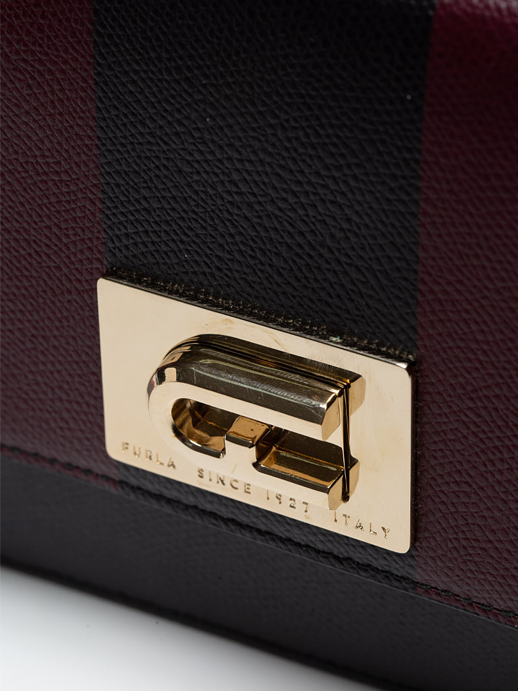 This shoulder bag from Furla's "1927" series features a striped print on high-quality embossed leather. It comes with a chain and leather combination strap, allowing it to be worn over the shoulder or across the body.