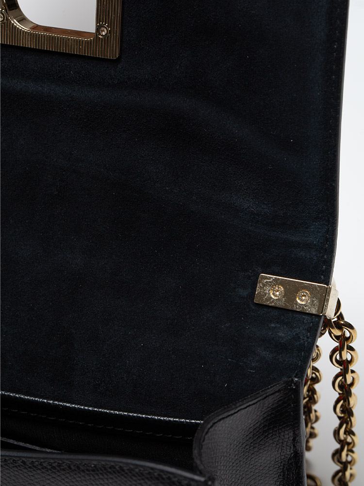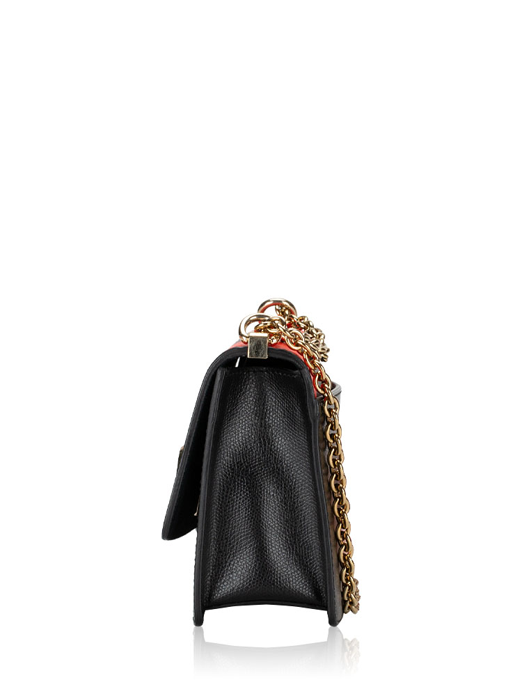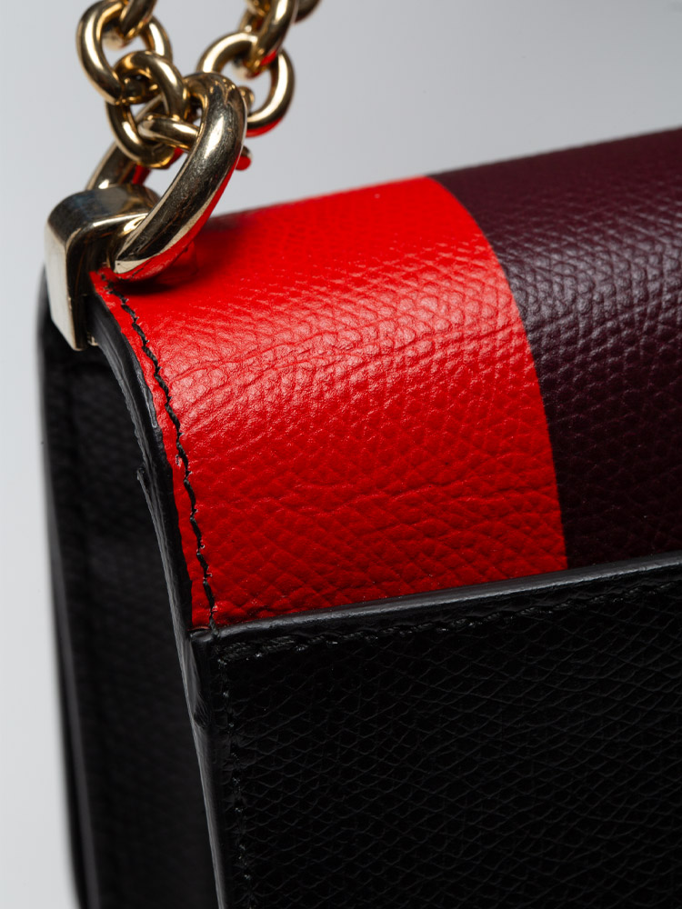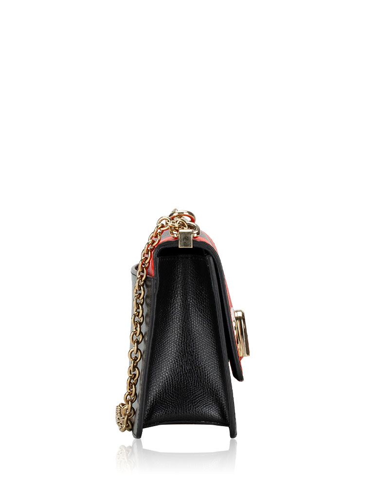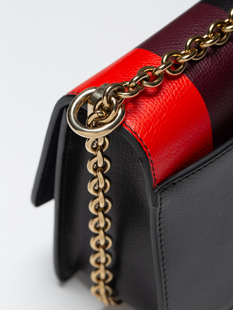 This shoulder bag from Furla's "1927" series features a striped print on high-quality embossed leather. It comes with a chain and leather combination strap, allowing it to be worn over the shoulder or across the body.