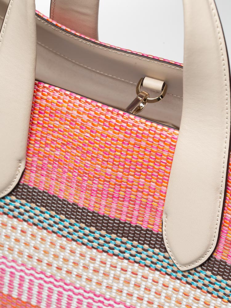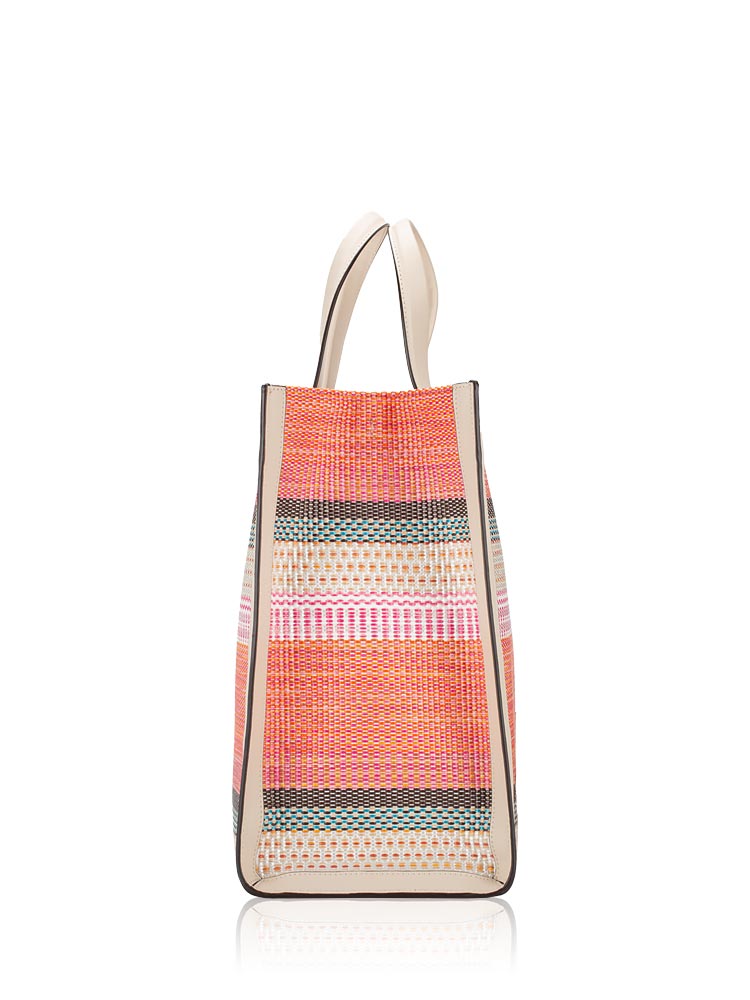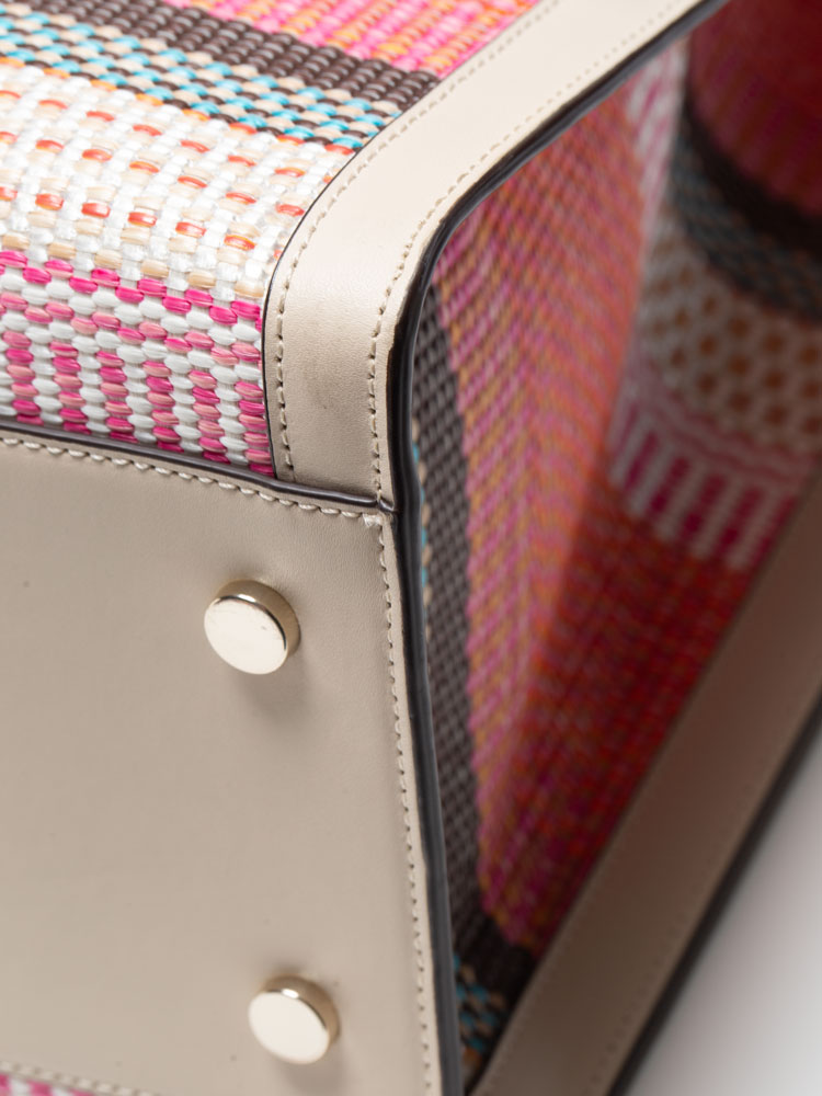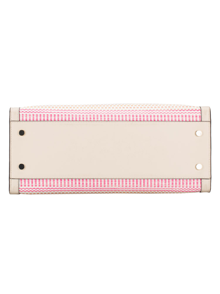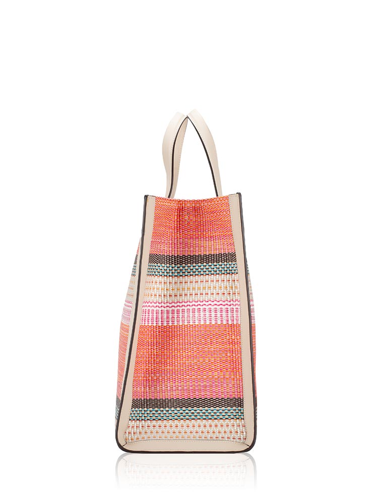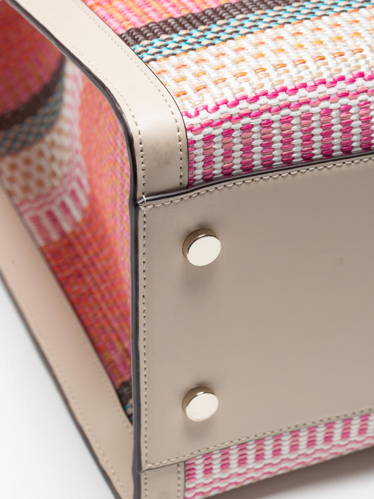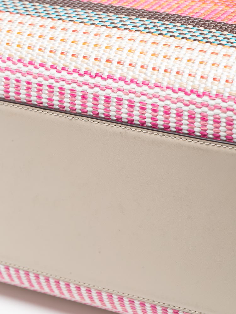 Made of woven striped fabric with smooth leather trim. The bag features an open top and dog-clip closure, one zip pocket, four slip pockets, one slip pocket with button snap closure.