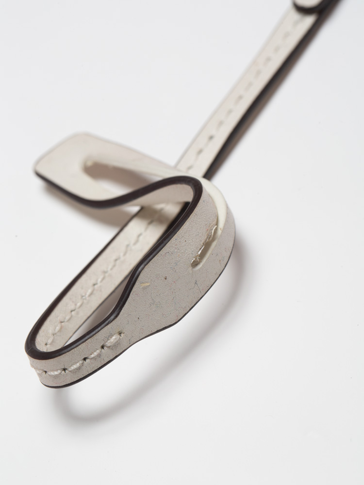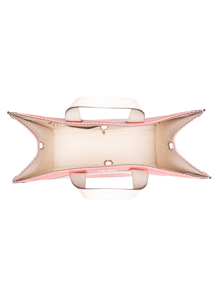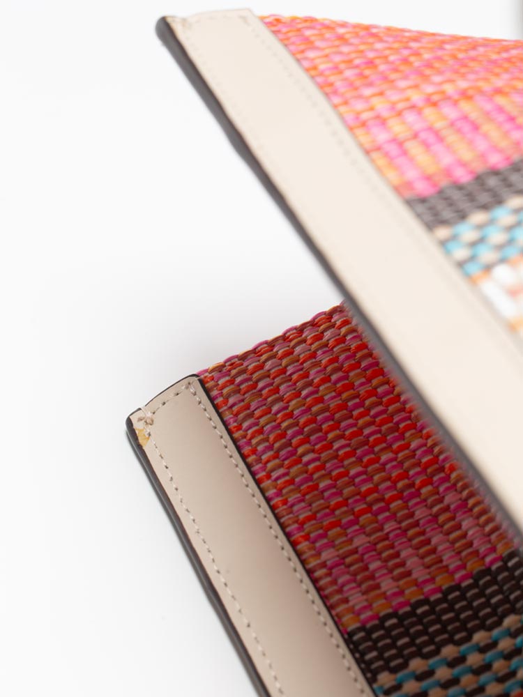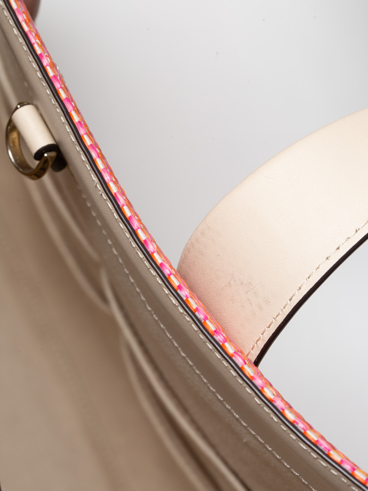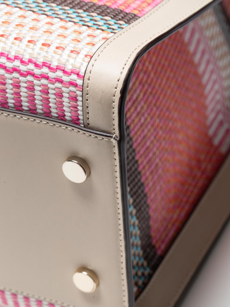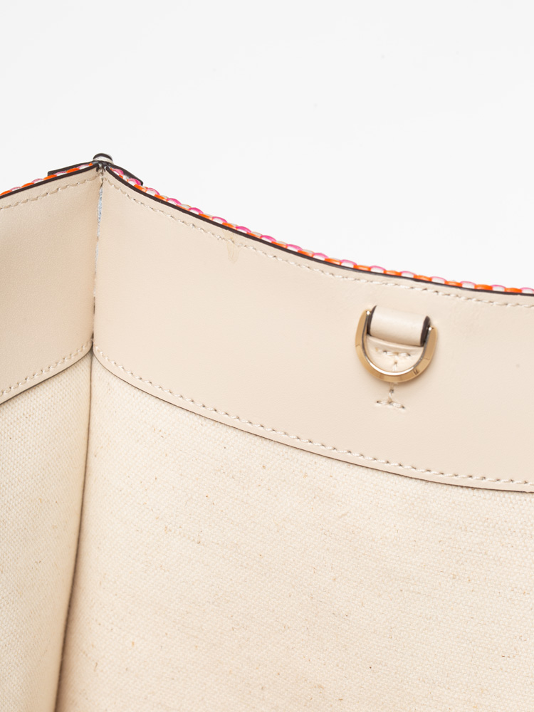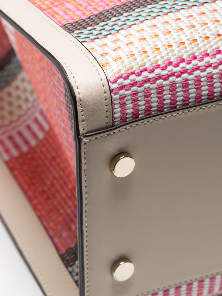 Made of woven striped fabric with smooth leather trim. The bag features an open top and dog-clip closure, one zip pocket, four slip pockets, one slip pocket with button snap closure.