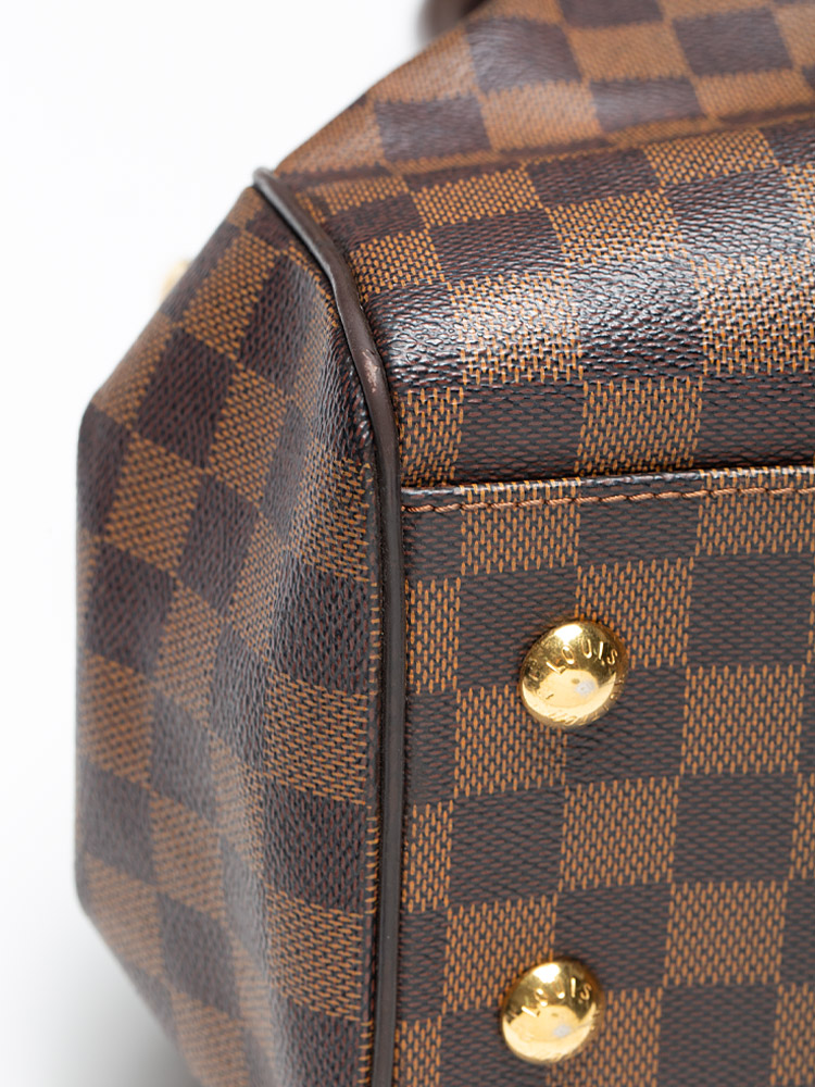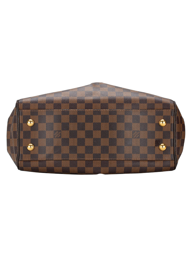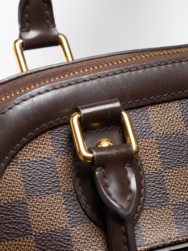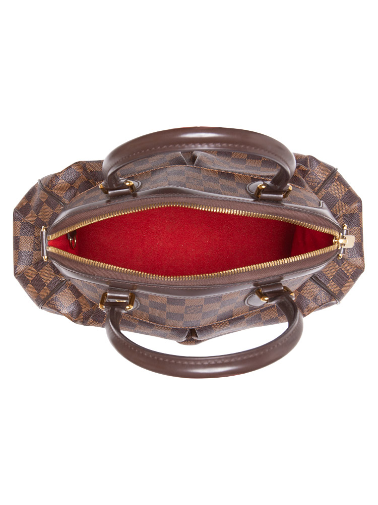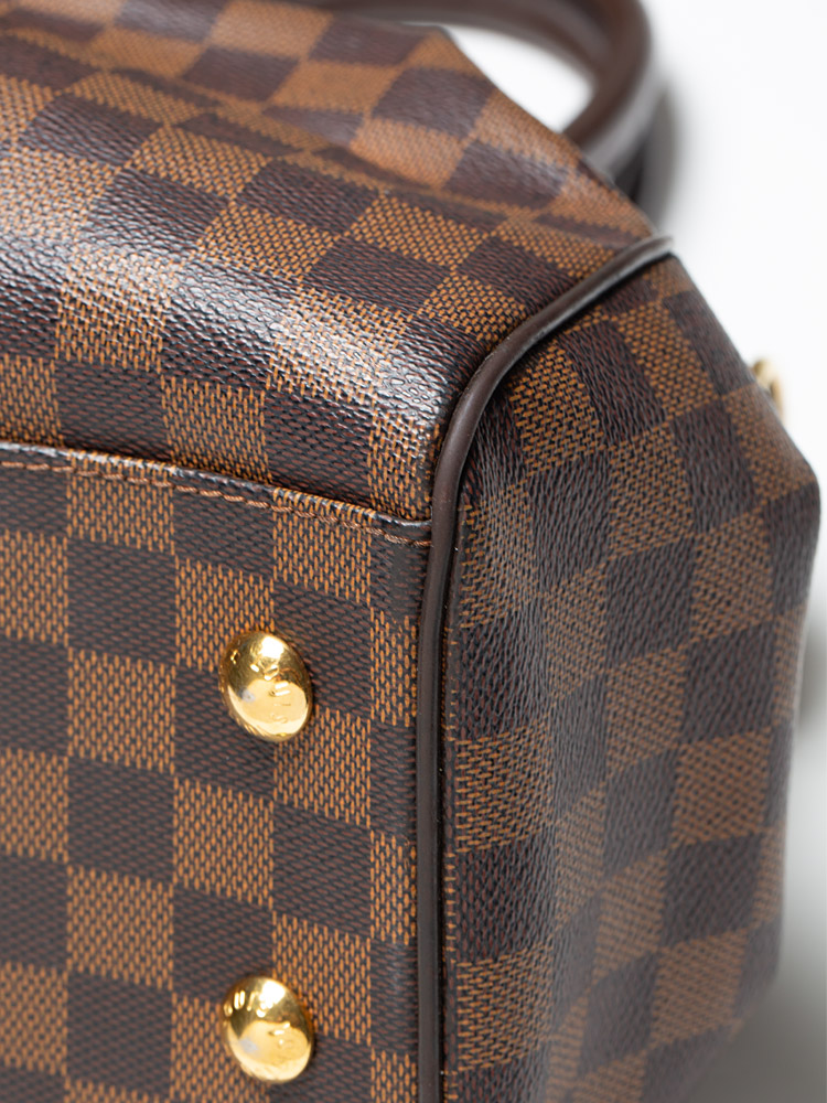 The bag is crafted of Louis Vuitton damier ebene coated canvas. Features with cowhide rolled leather handles, trim, detachable shoulder strap, and polished brass hardware. The top opens to a microfiber interior with patch pockets.
