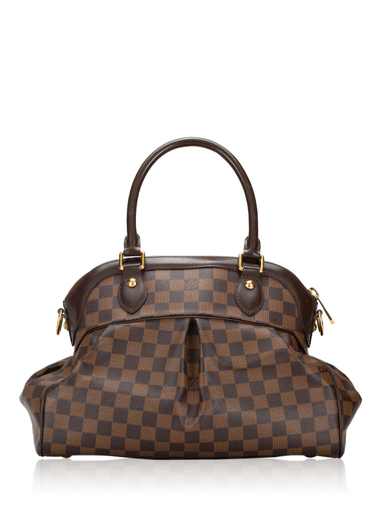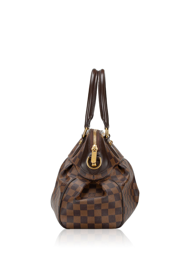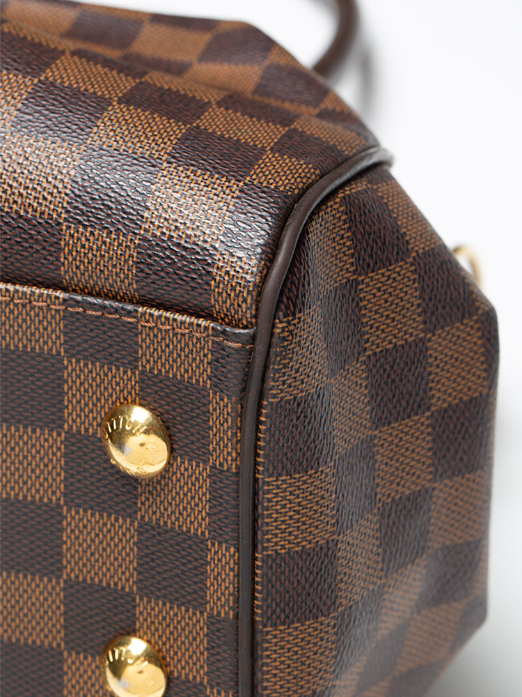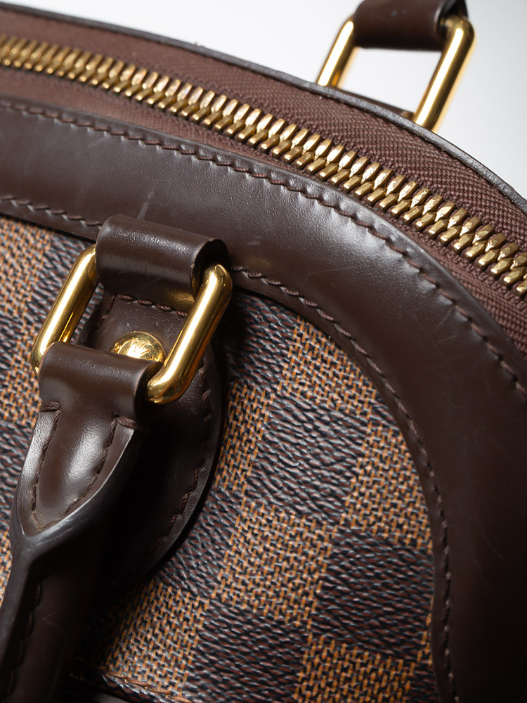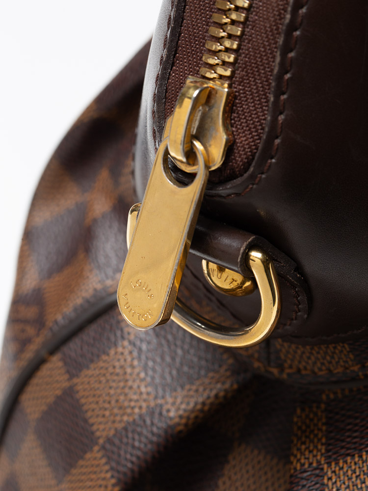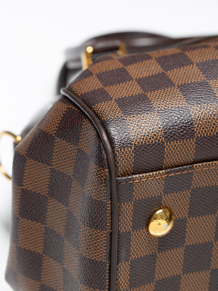 The bag is crafted of Louis Vuitton damier ebene coated canvas. Features with cowhide rolled leather handles, trim, detachable shoulder strap, and polished brass hardware. The top opens to a microfiber interior with patch pockets.