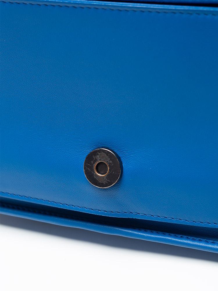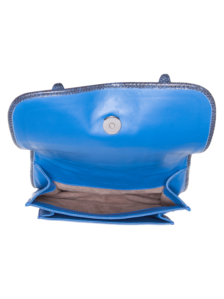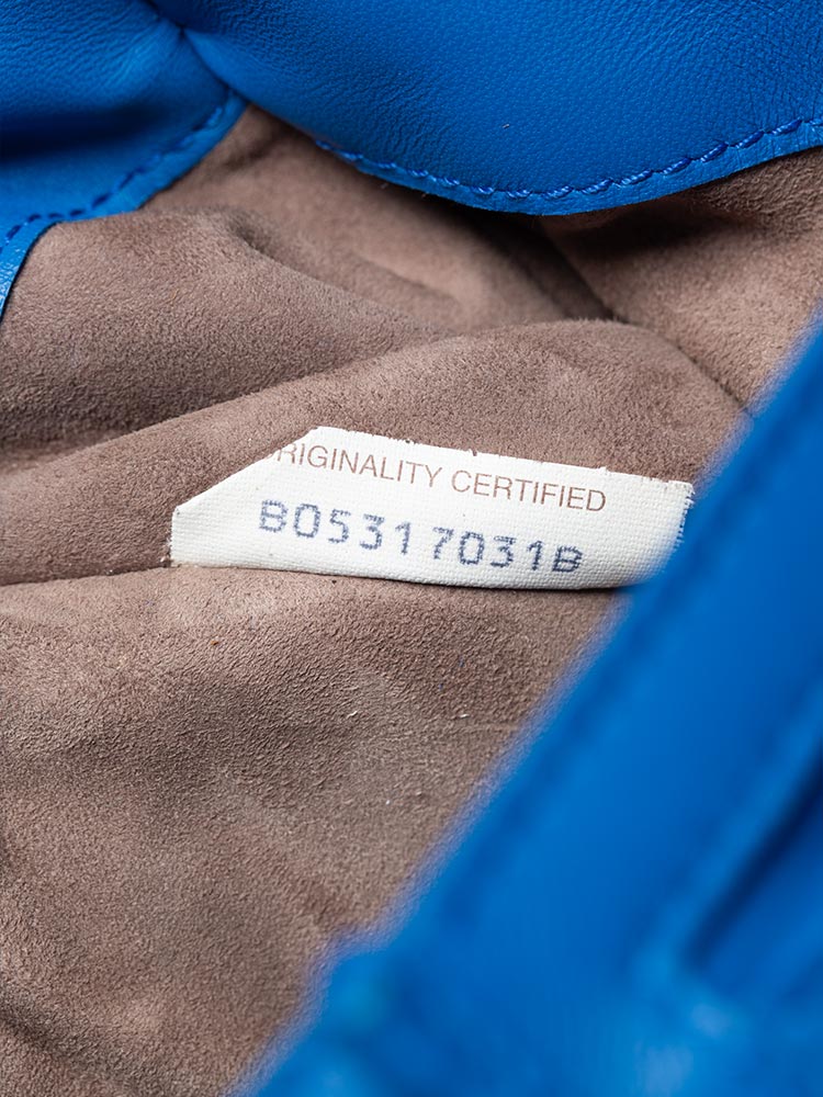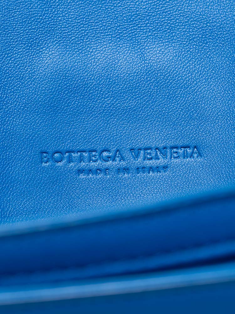 Crafted of blue intrecciato woven nappa soft leather. The bag features a front flap that opens to a suede interior, a front compartment, and a cross-body shoulder strap.