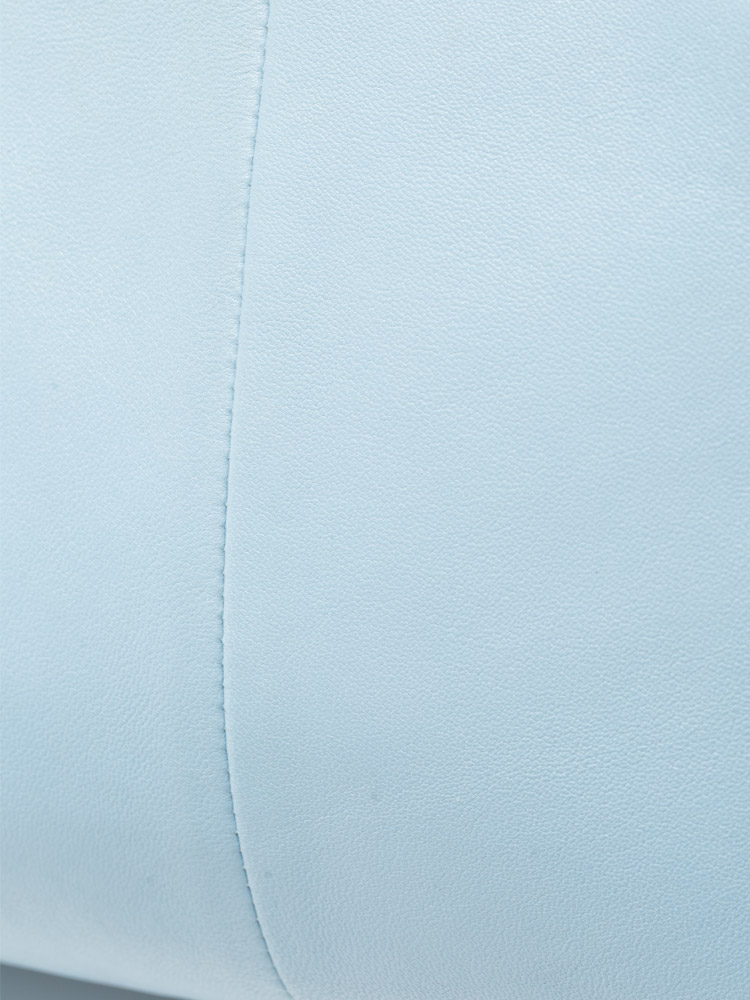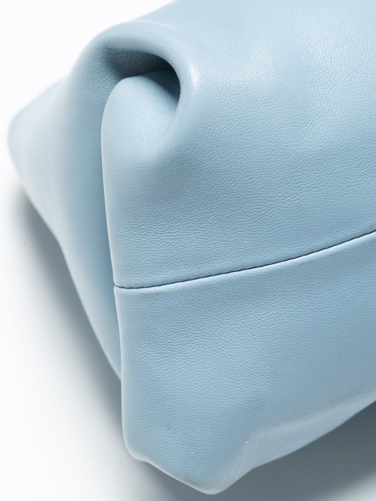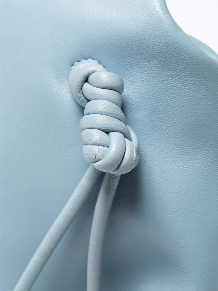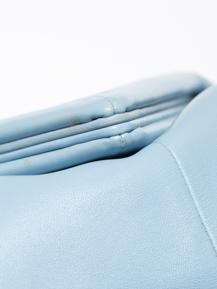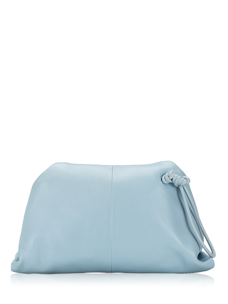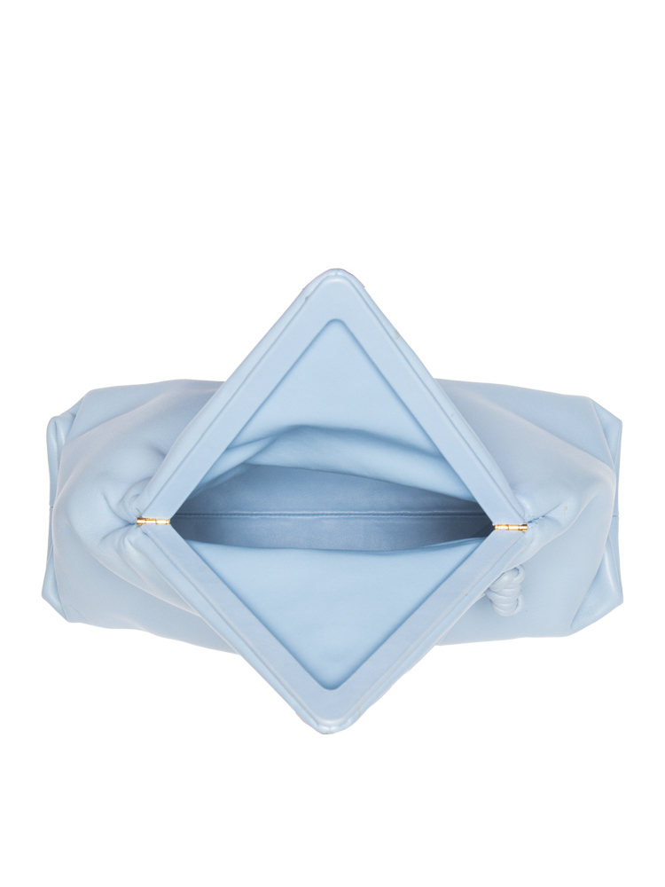 Crafted of lambskin leather. The bag features a wristlet and triangle flap that opens with a magnetic to a matching leather interior.