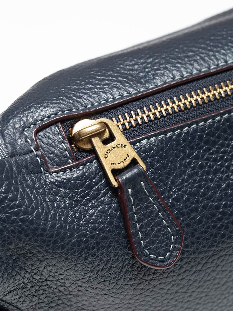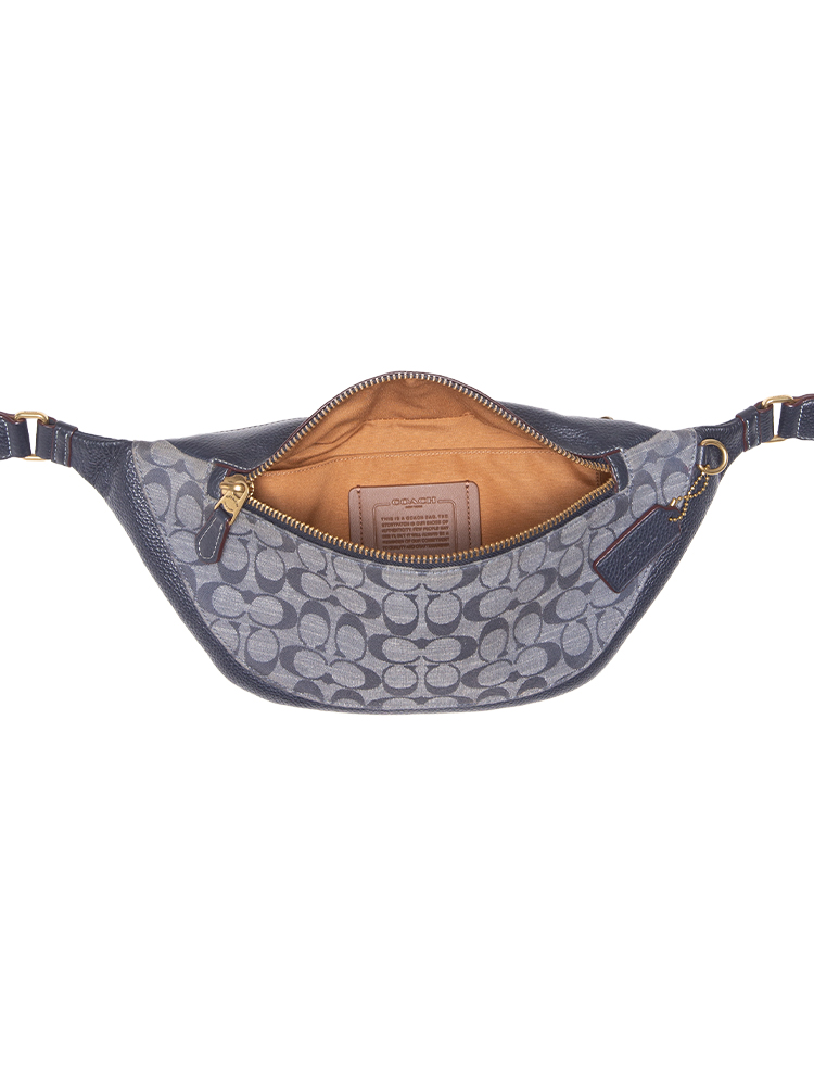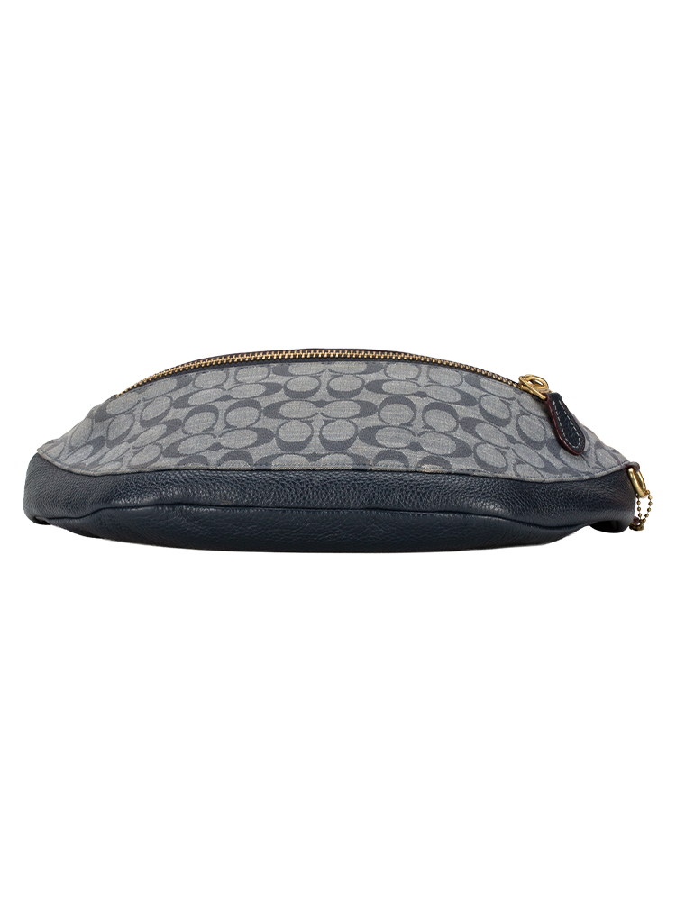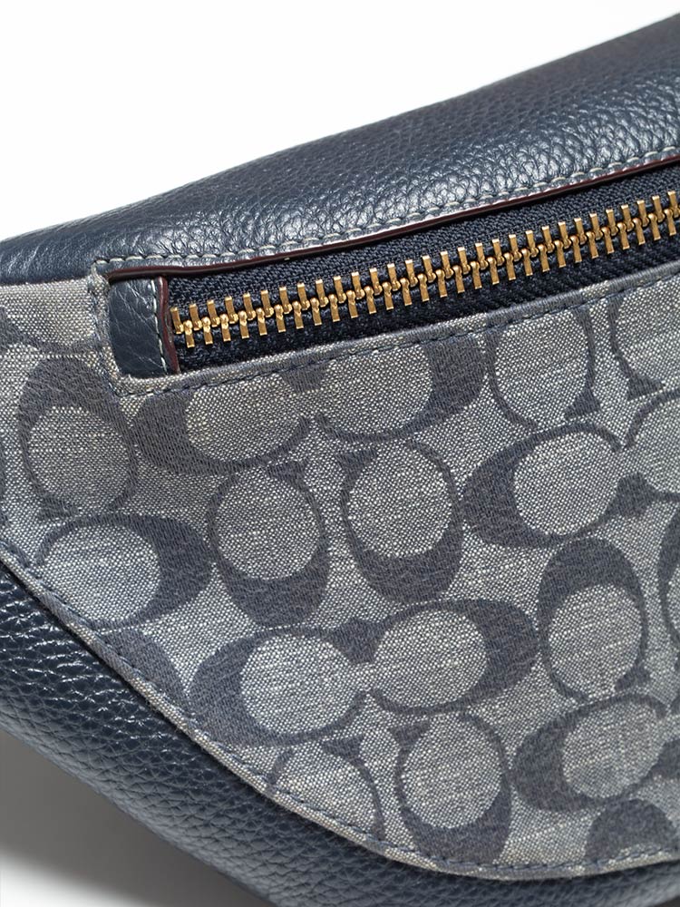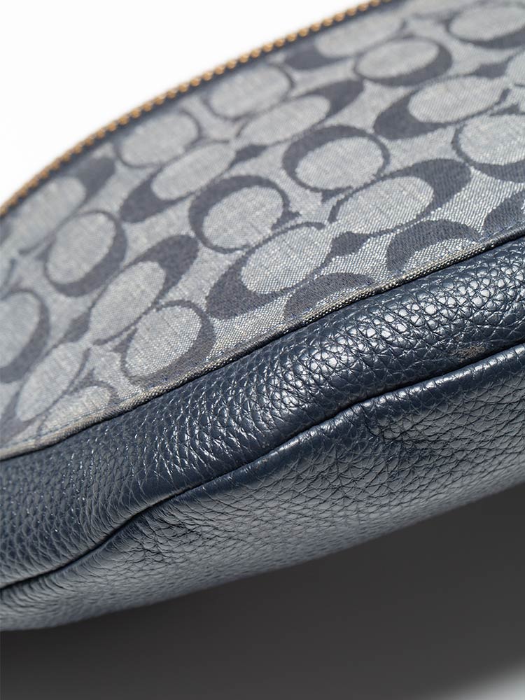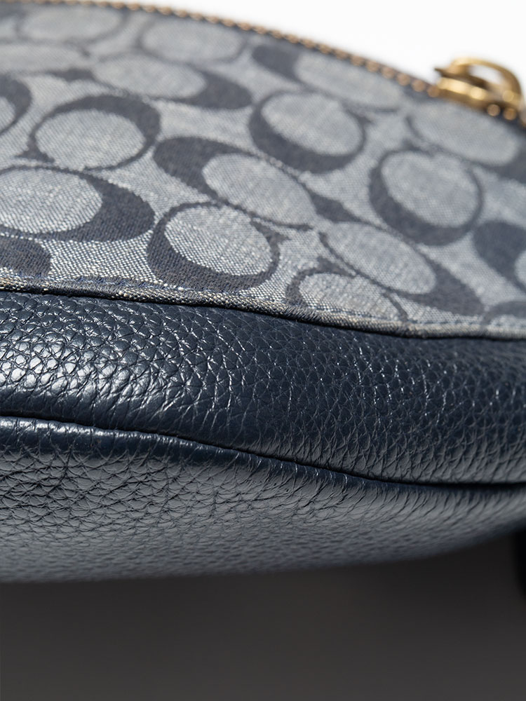 Made of signature chambray and pebble leather. The bag features a zip closure that opens to fabric lining with one slip pocket, exterior one zip compartment at back.