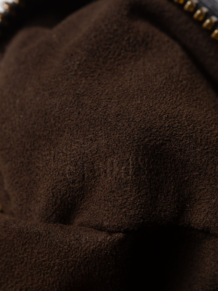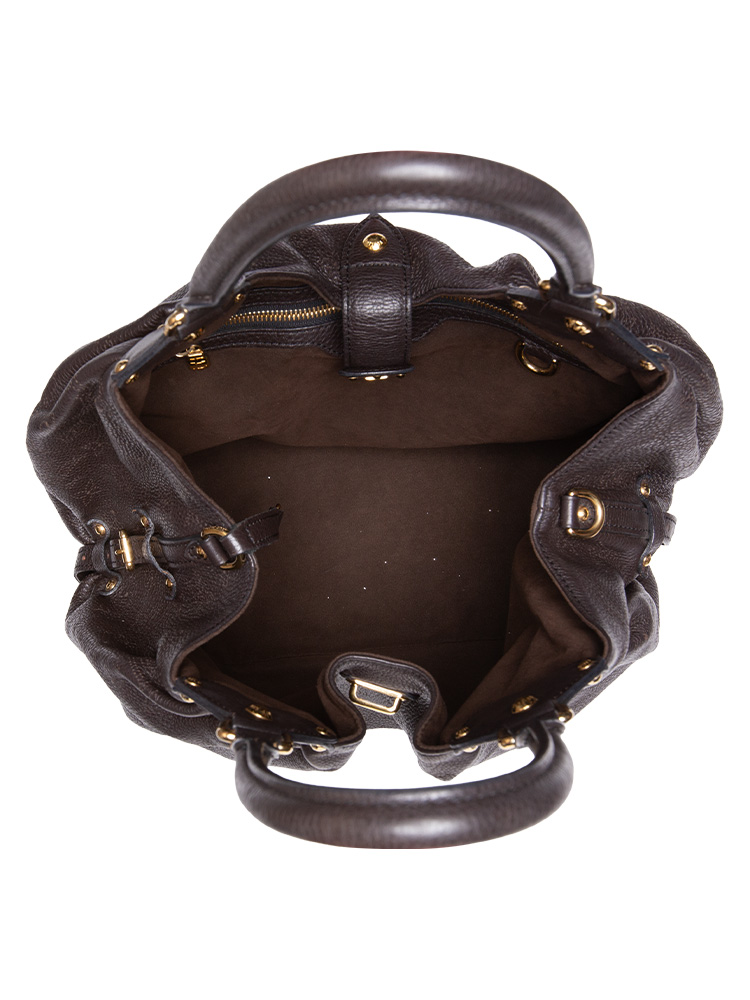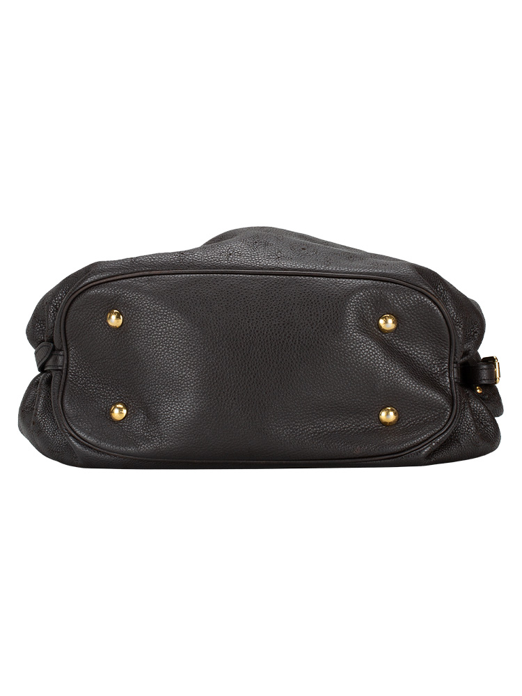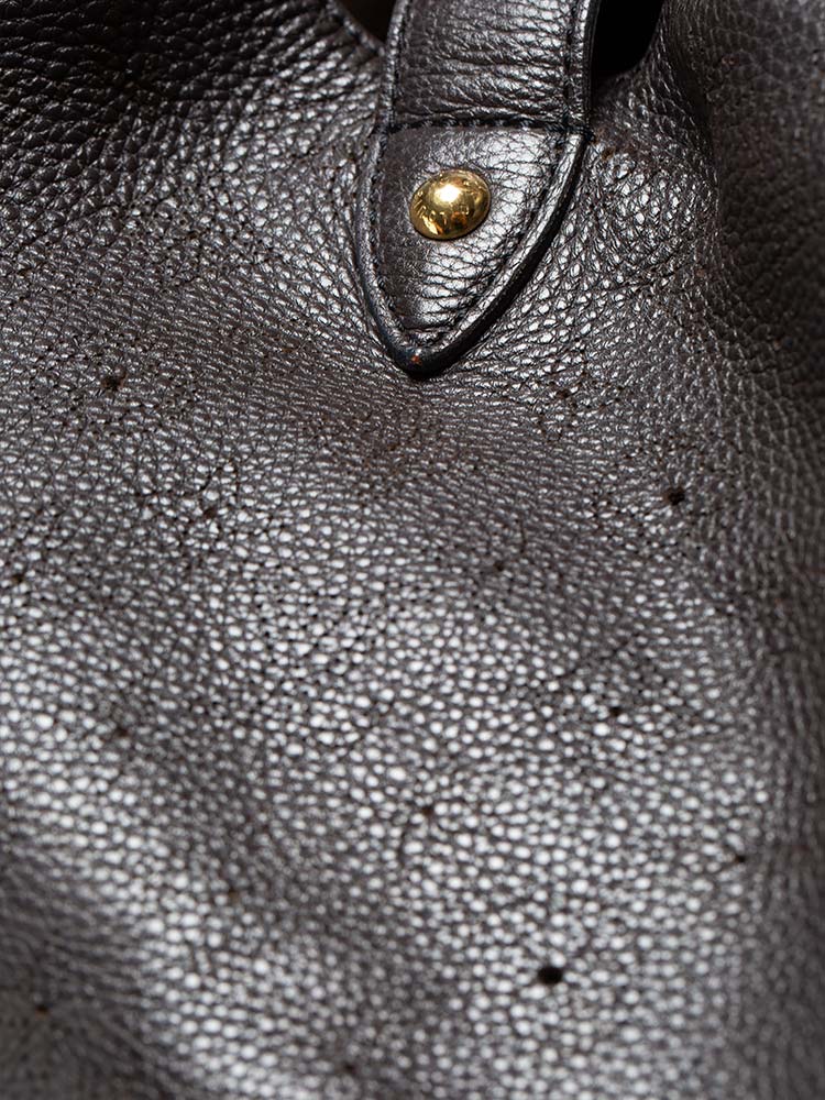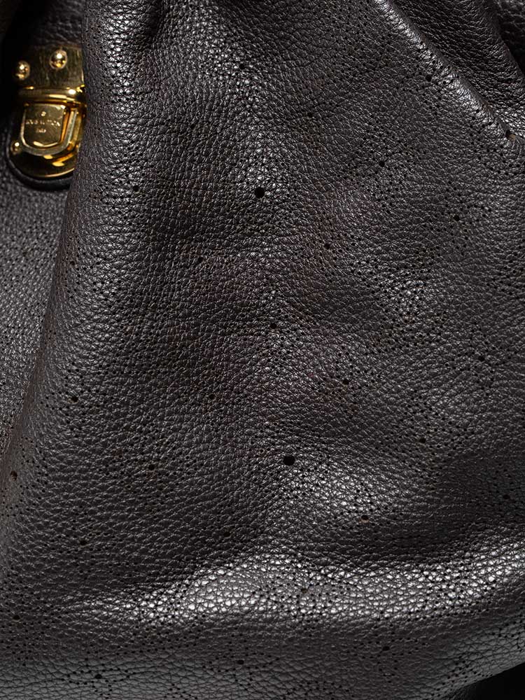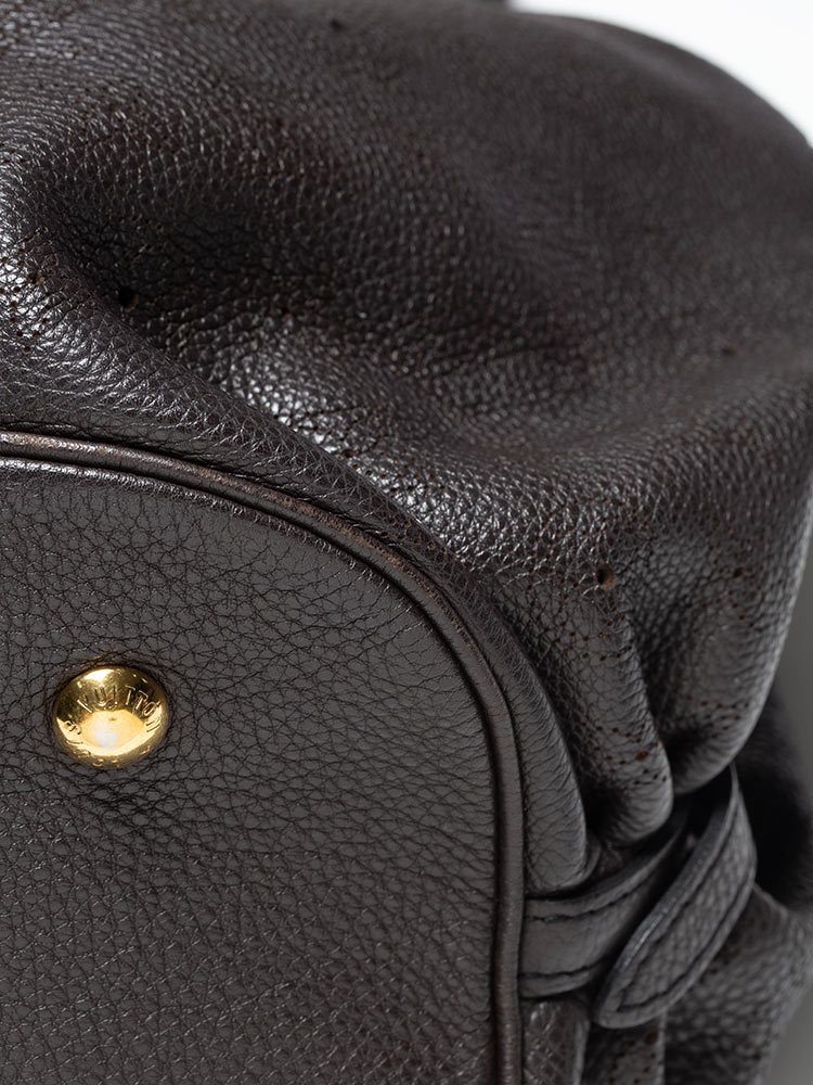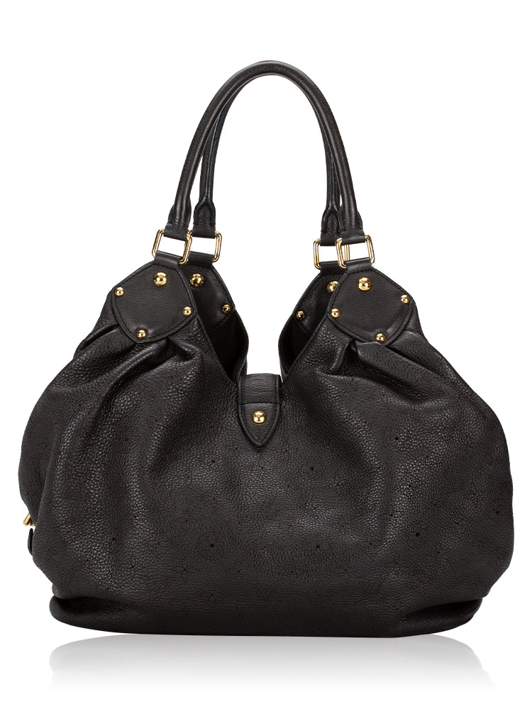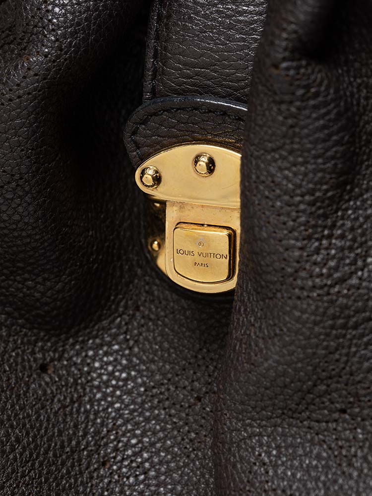 This bag is crafted of perforated monogram leather. Features rolled leather top handles and a central polished gold clasp closure that opens to a suede interior with a zipper pocket.
