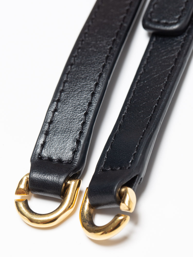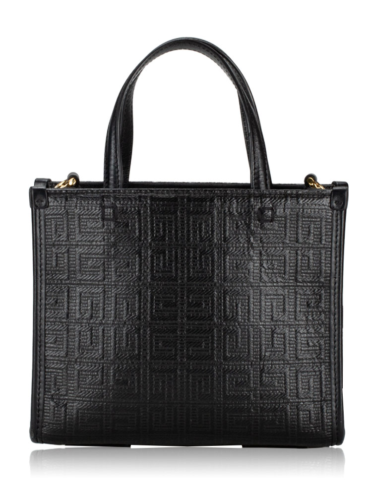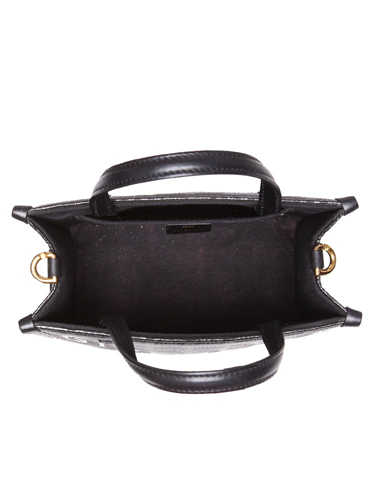 This bag is crafted of coated canvas material. Features strap handles, an optional adjustable shoulder strap, and gold hardware. The top opens to a fabric interior with a patch pocket.