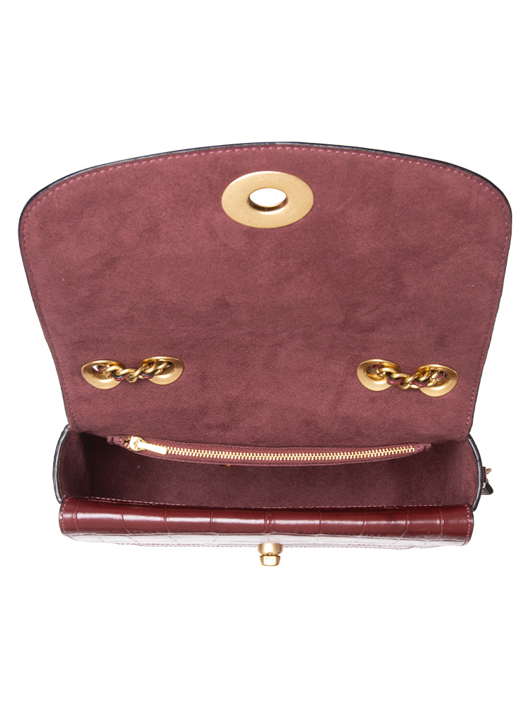 Made of embossed croco leather. The bag faetures a turn lock closure that opens to suede lining with interior one zip pocket, two slip pocket at front with magnetic closure and exterior one slip pocket.
