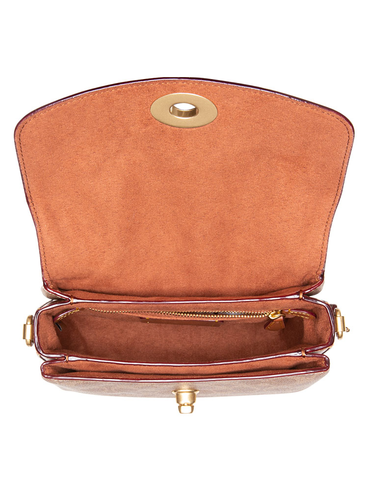 Made of coated canvas and leather. The bag features a flap with turn-lock closure that opens to suede lining with two slip pockets, one zip pocket, exterior one slip pocket at back, removable handle strap, removable chain strap.