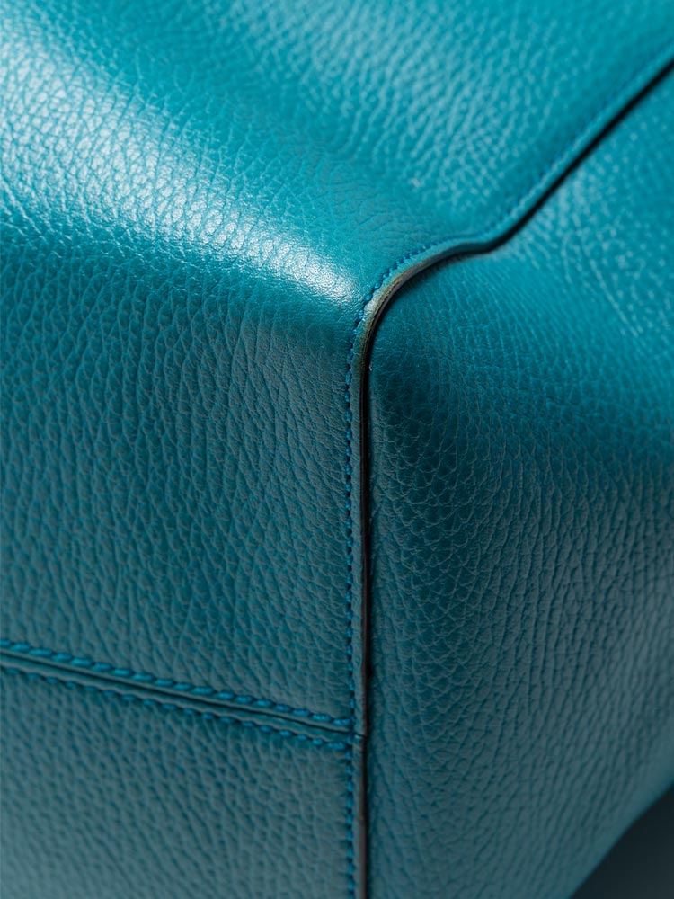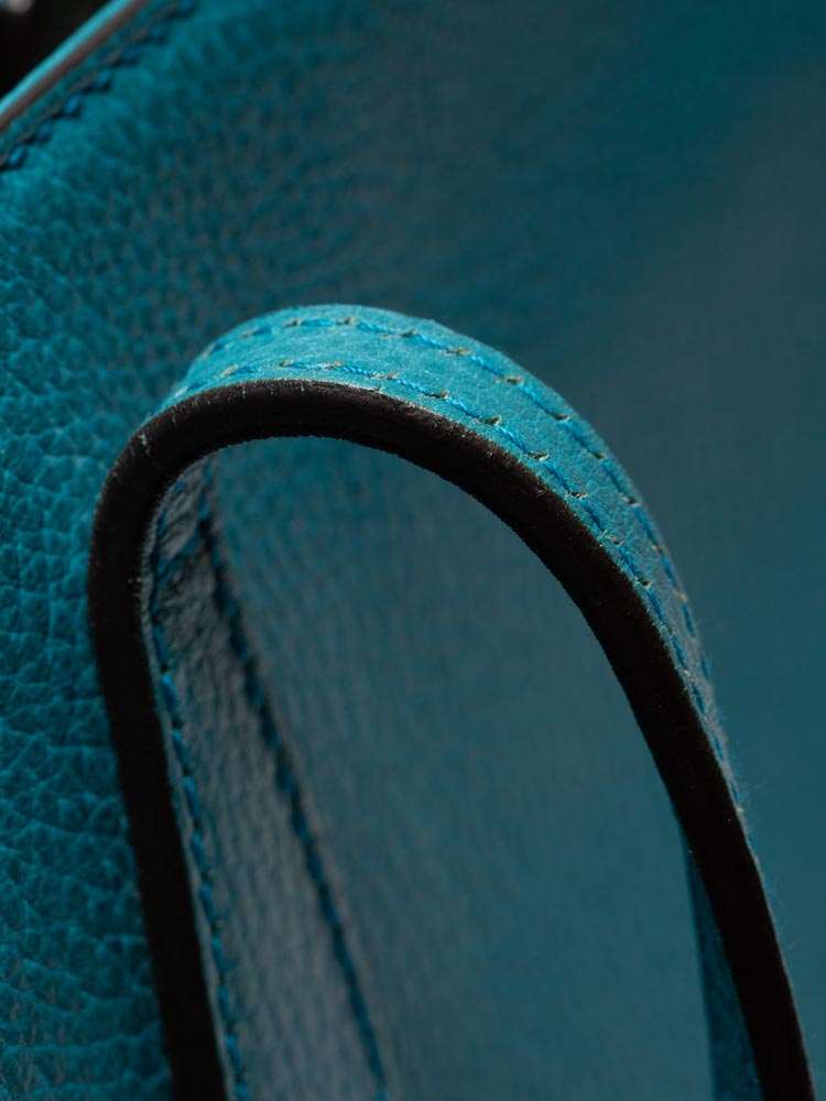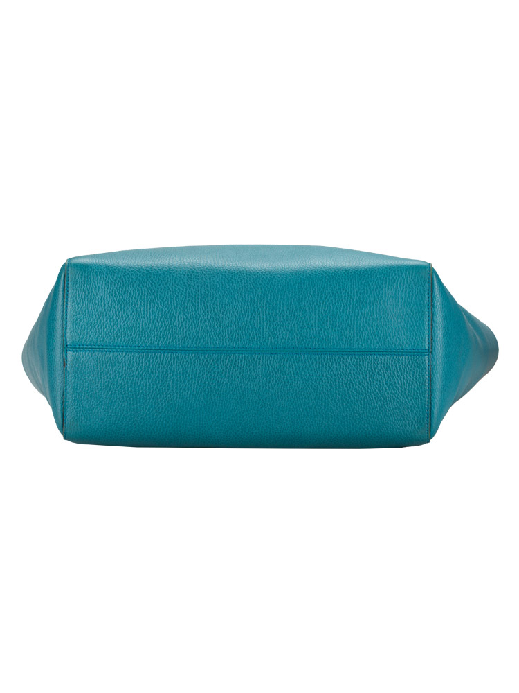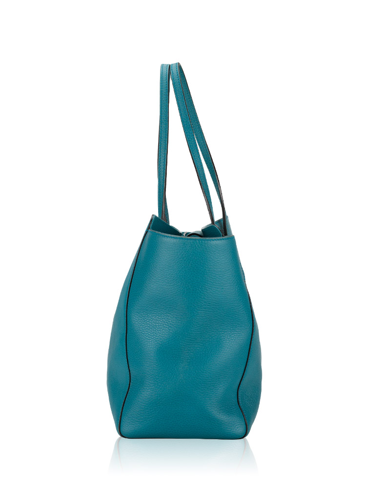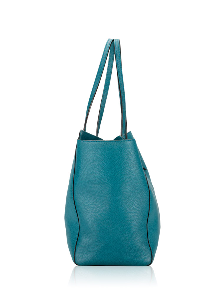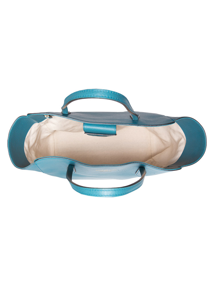 Crafted of richly textured calfskin leather. It features tall leather strap handles with expanded sides, and light gold hardware. It magnetic closure opens to a fine textile interior with zipper and patch pockets.