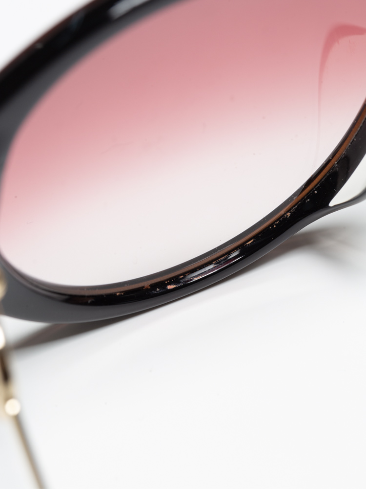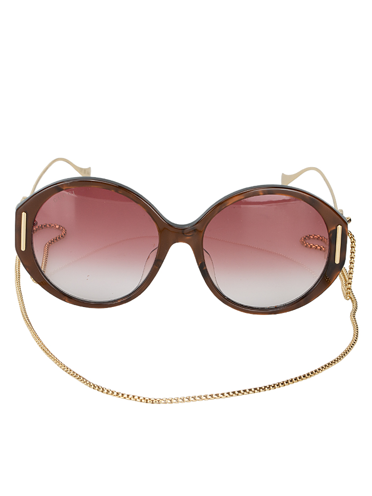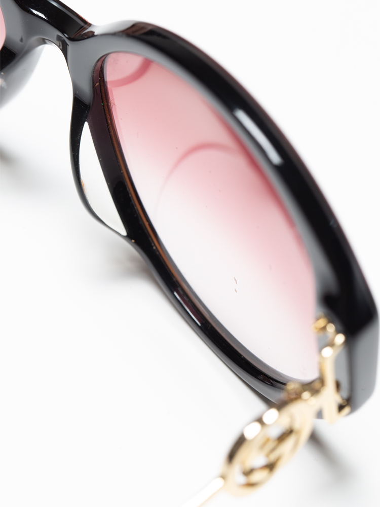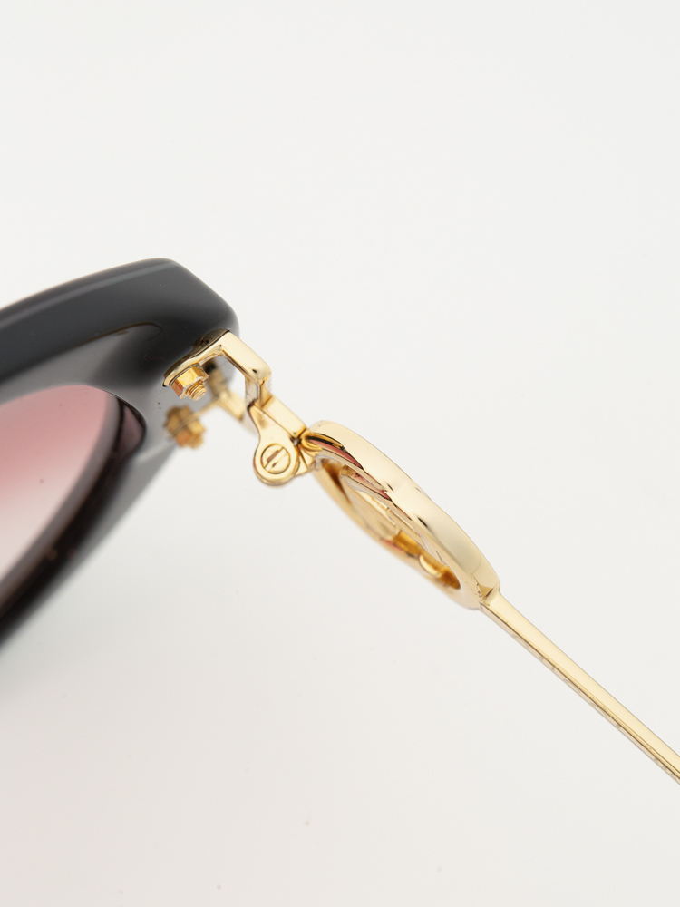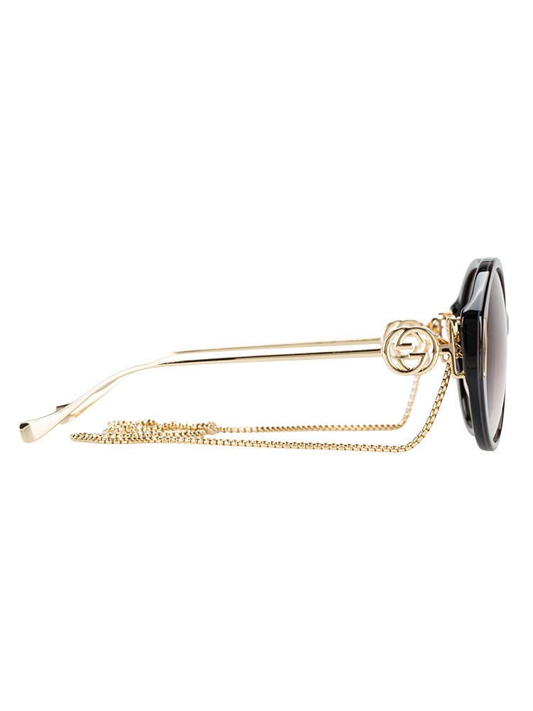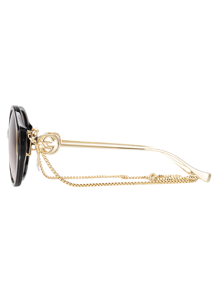 Crafted of metal ans acetate material. Features a vintage style frame with oversized square rims with lenses in a gradient and have a polished brass GG at the hinge.