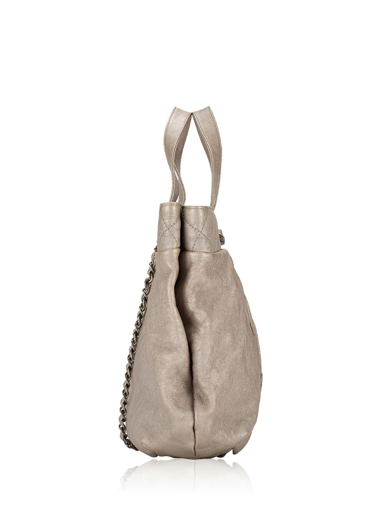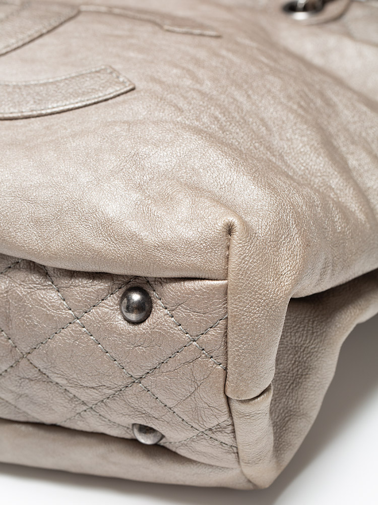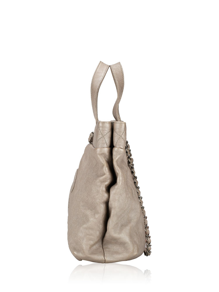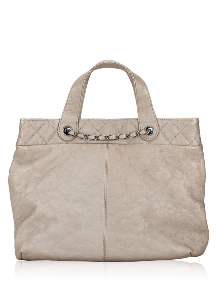 This bag is crafted of calfskin material. It features double top handles, chain shoulder strap, Chanel CC logo at front, and ruthenium hardware. The bag opens to a partitioned fabric lining with patch and zipper pockets.