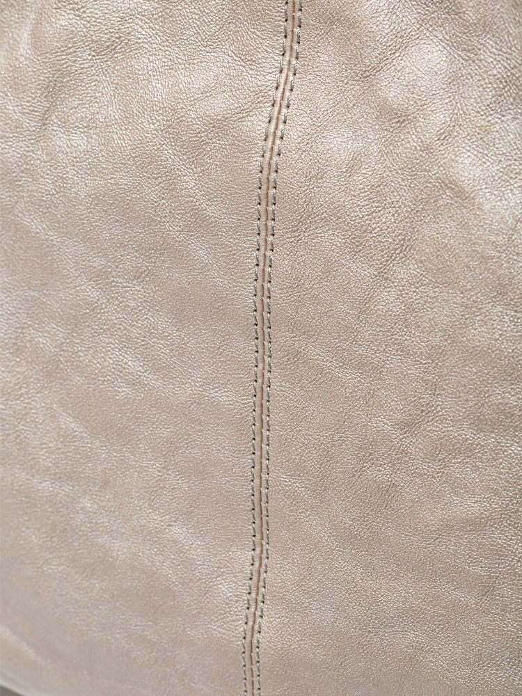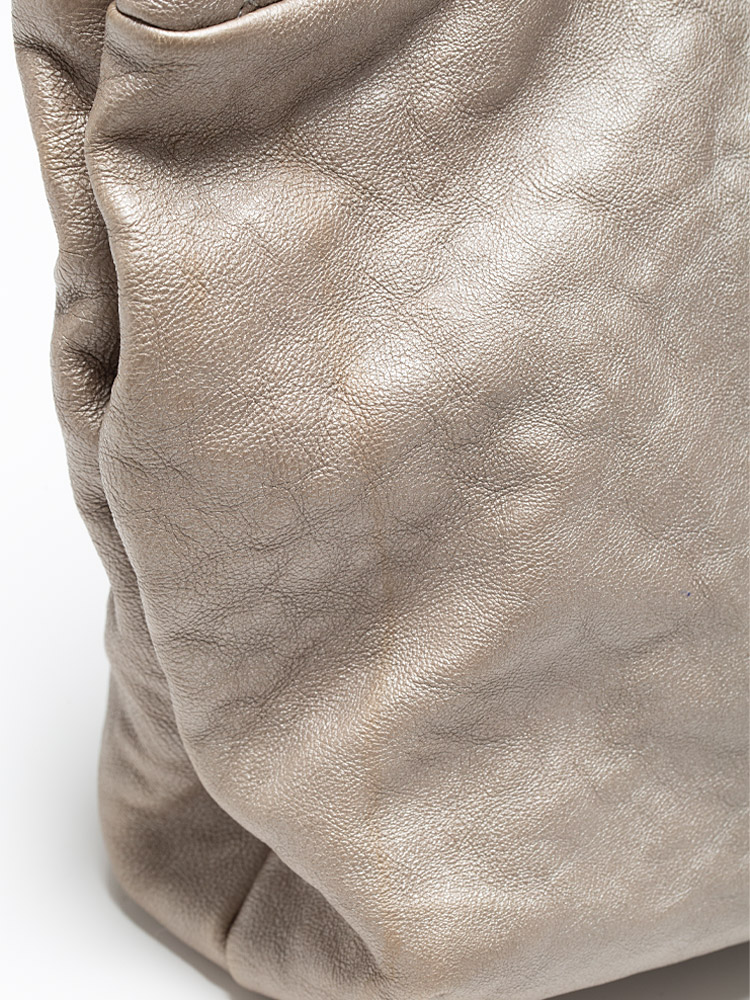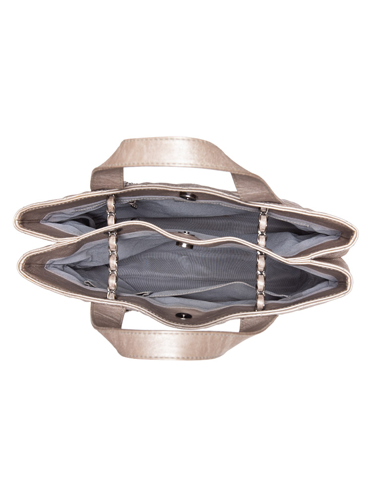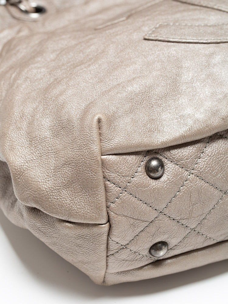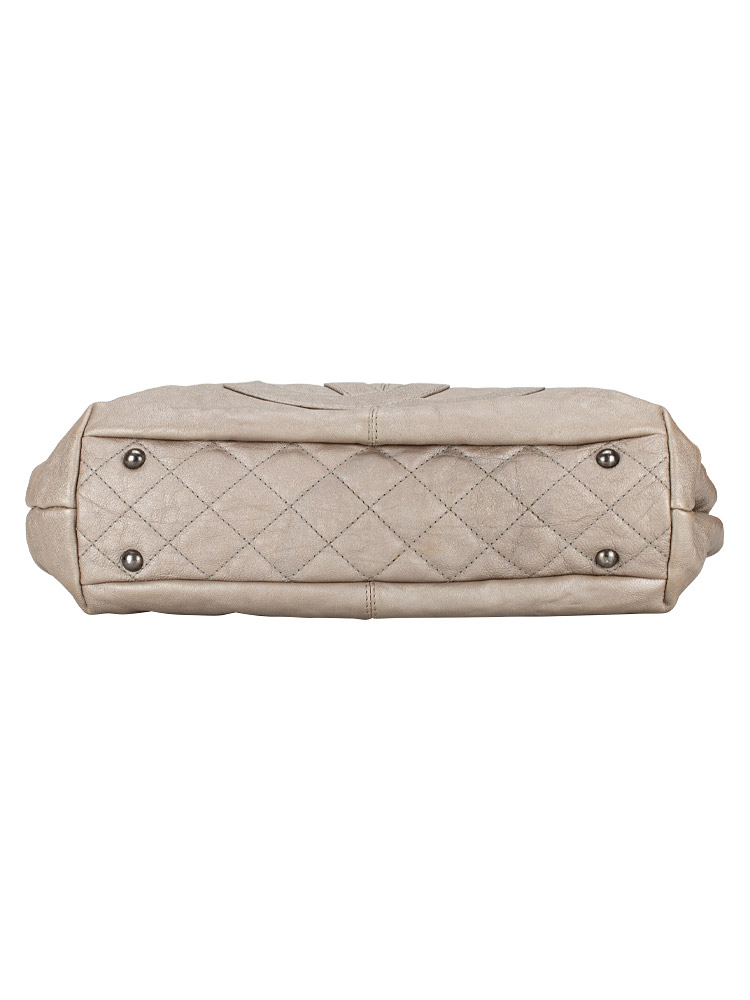 This bag is crafted of calfskin material. It features double top handles, chain shoulder strap, Chanel CC logo at front, and ruthenium hardware. The bag opens to a partitioned fabric lining with patch and zipper pockets.