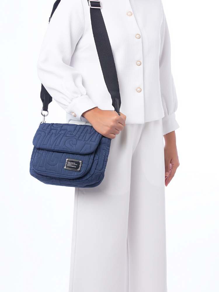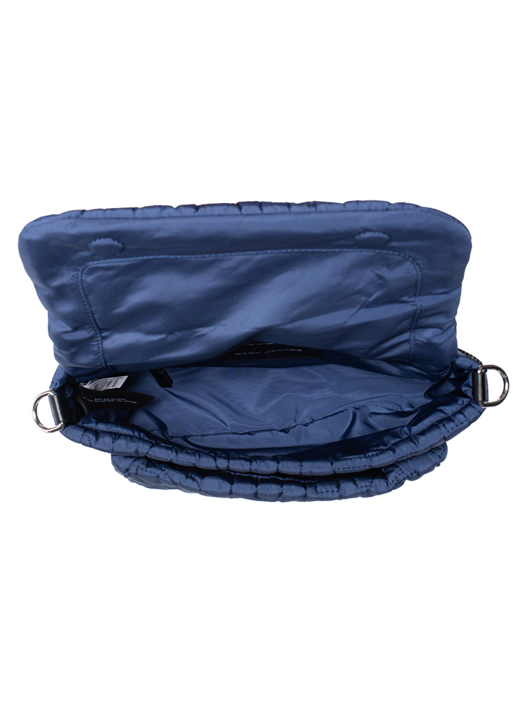 Made of embossed nylon with nylon lining. The bag features an Magnetic flap closure, silver tone hardware, one zip pocket, one front slip pocket and one rear exterior slip pocket with button magnetic closure.