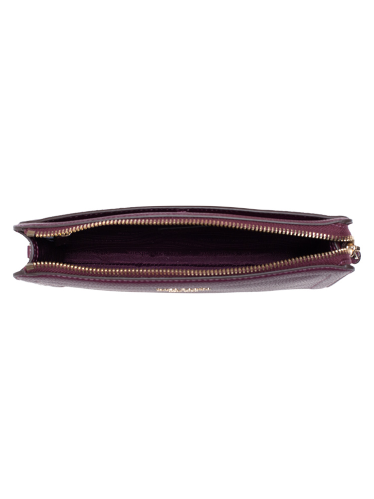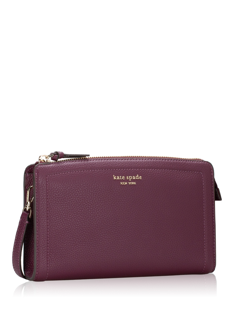 Made of pebble leather. The bag features a zip closure that opens to spade flower jacquard lining with interior one zip pocket, one slip pocket and exterior one slip pocket with magnetic snap closure at back.