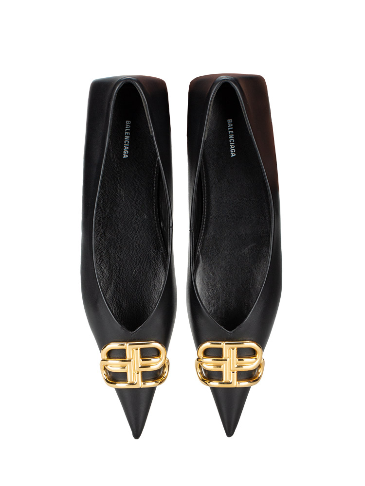 These pair of flats are crafted of black soft nappa leather. The flats feature a pointed toe and a gold BB logo.