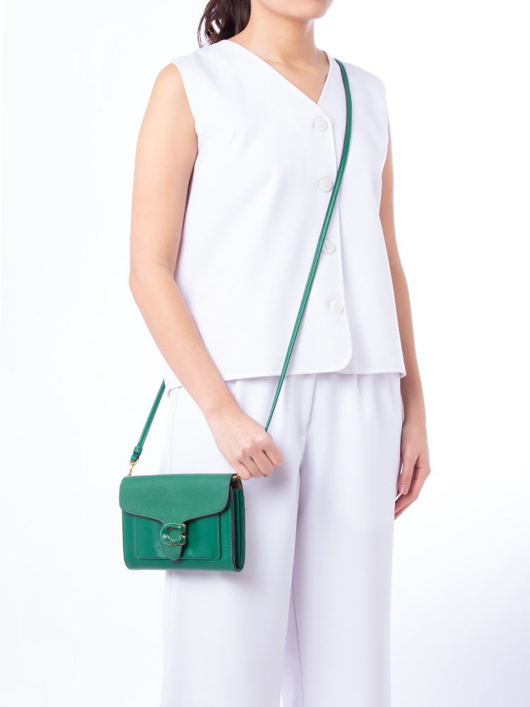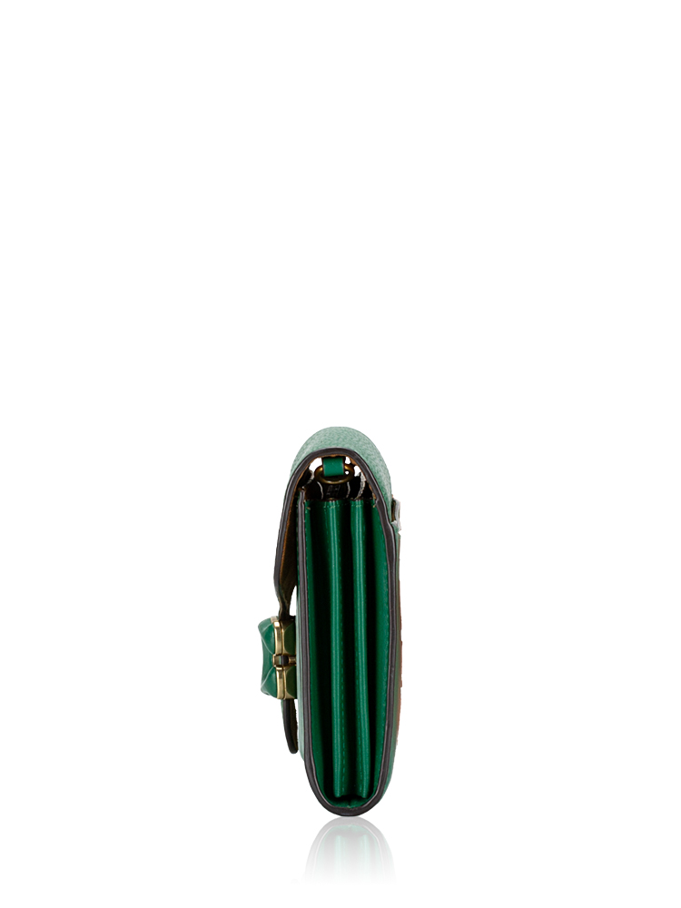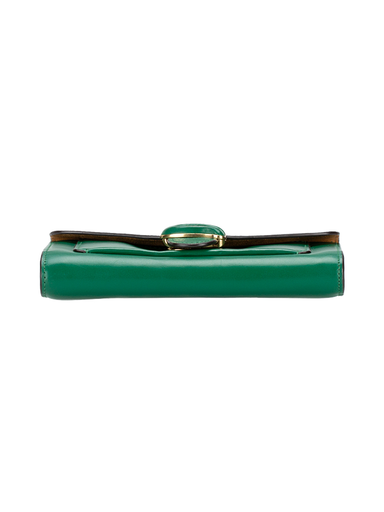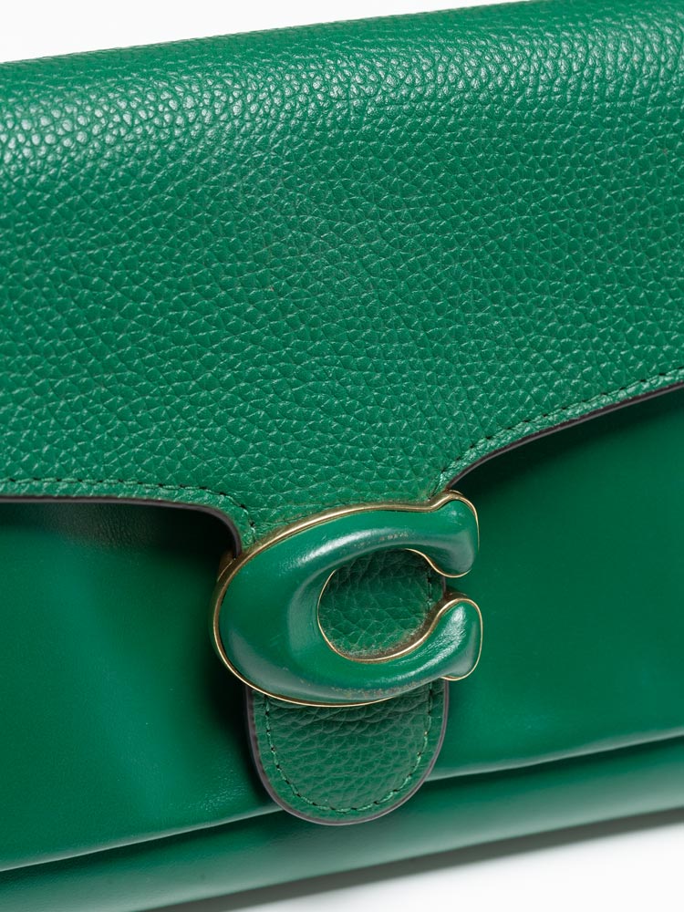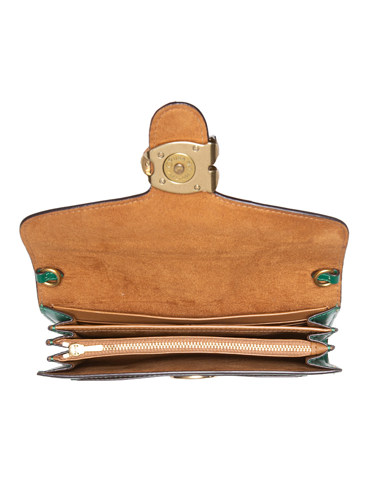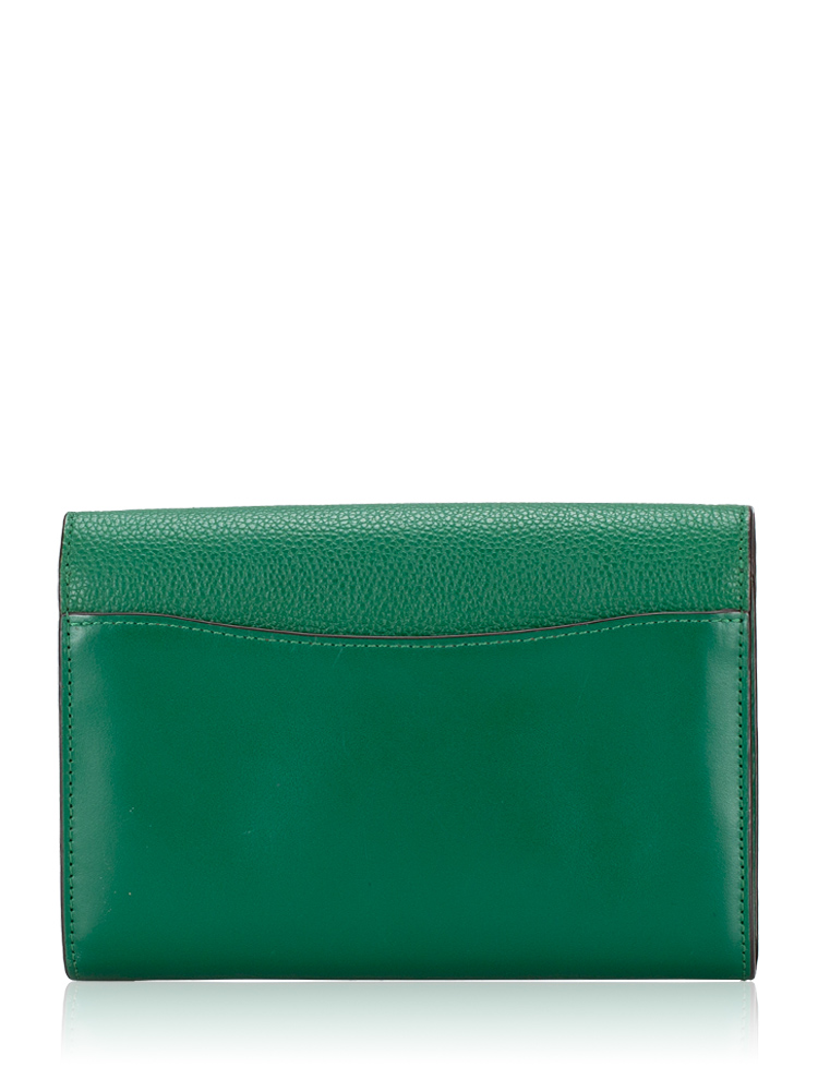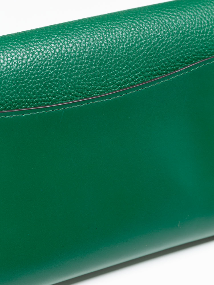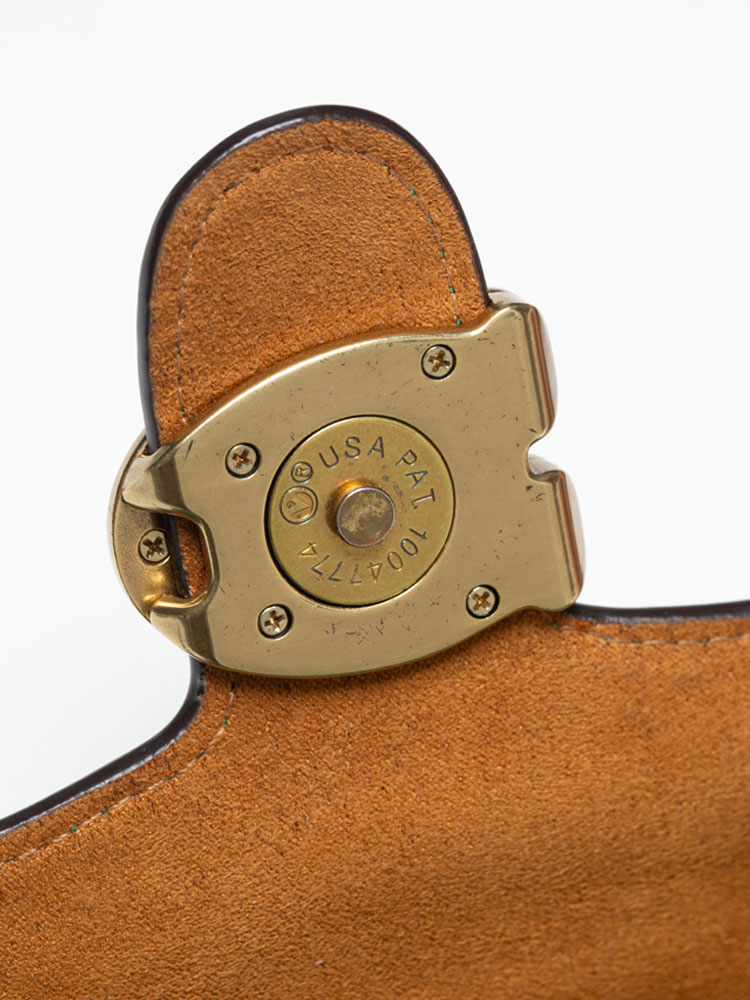 Made of pebble leather. The bag features a magnetic closure that opens to suede lining and fabric lining interior four slip pockets, eight card slots, zip pocket and exterior one slip pocket.