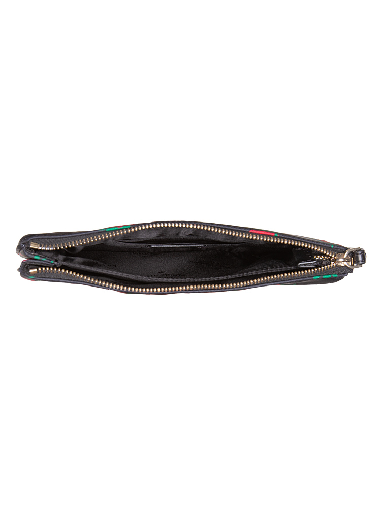 Made of nylon. The wristlet features a zip closure that opens to polyester lining with three card slots, and two compartments.
