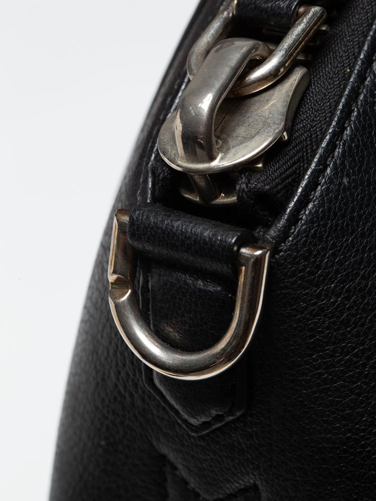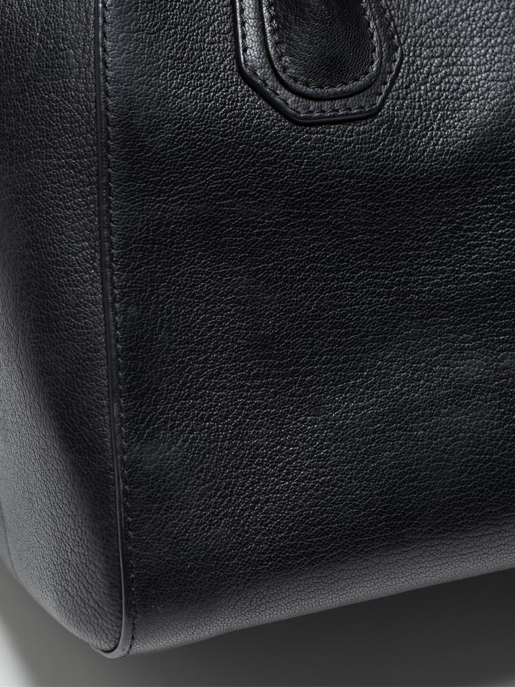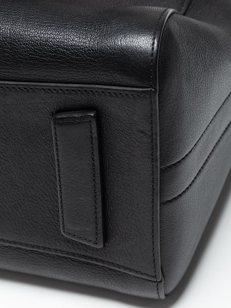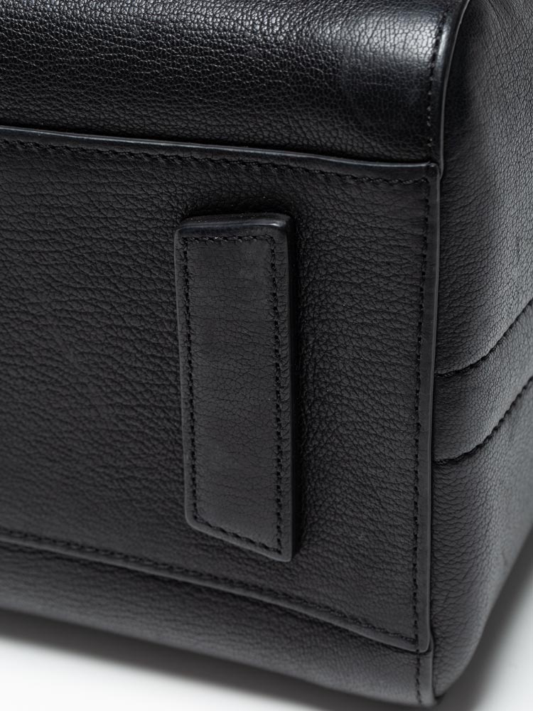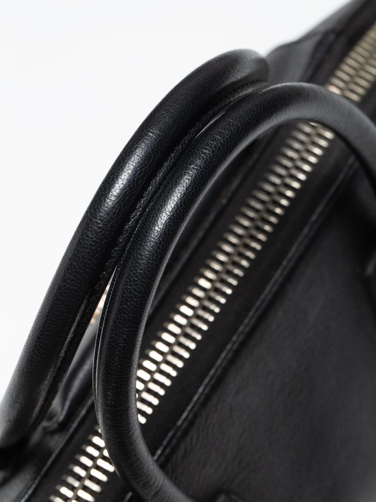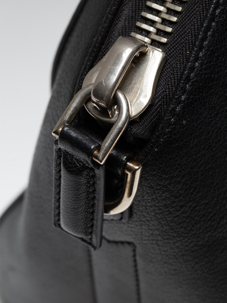 Crafted of grained goatskin leather. It features rolled-leather top handles and an optional leather shoulder strap with silver hardware. The top opens with a zipper to a fabric interior with a zipper and patched pockets.