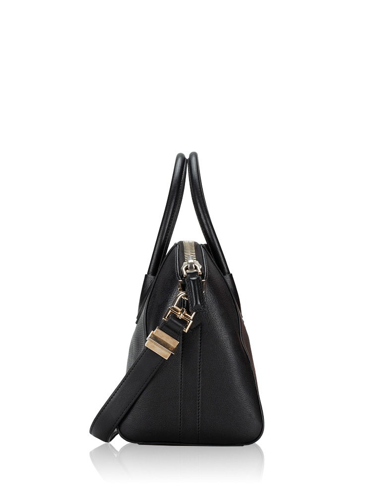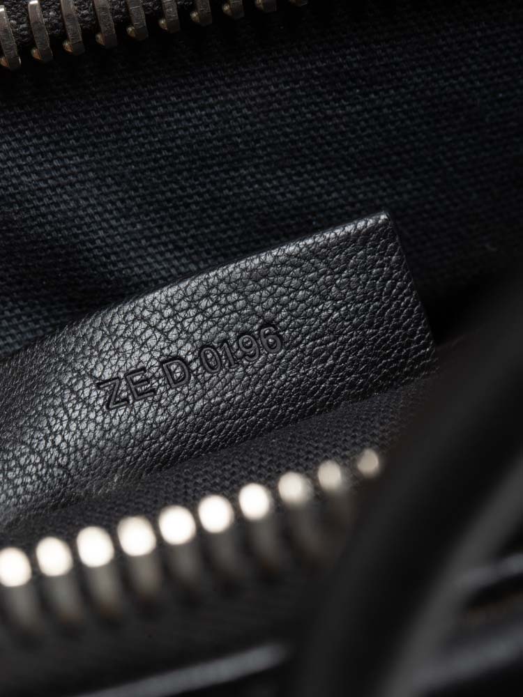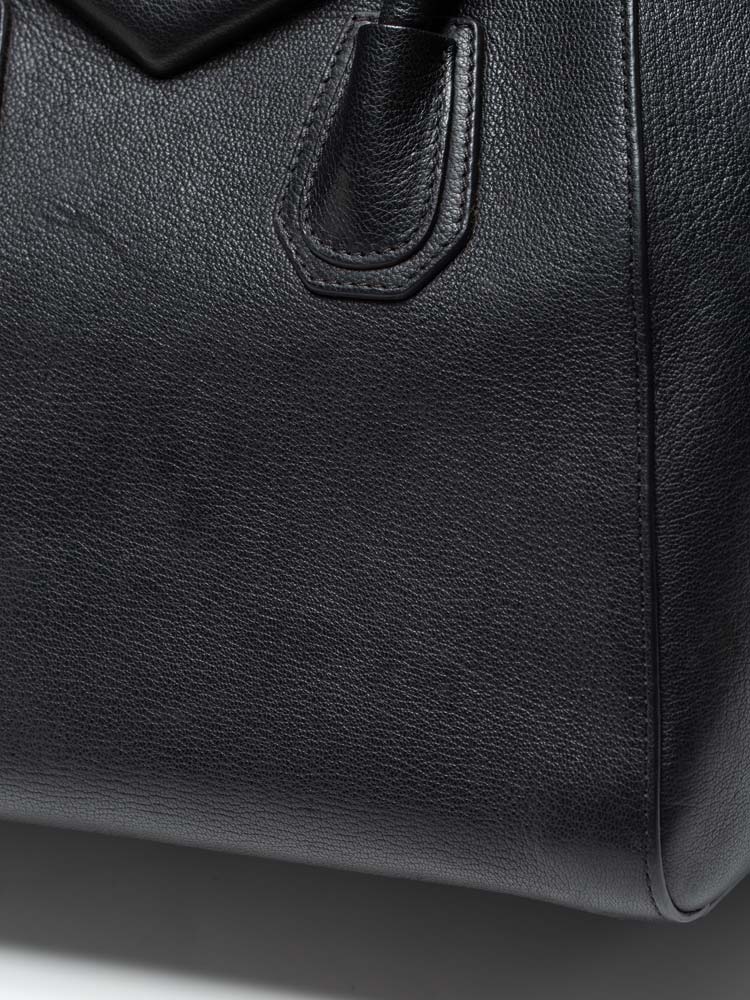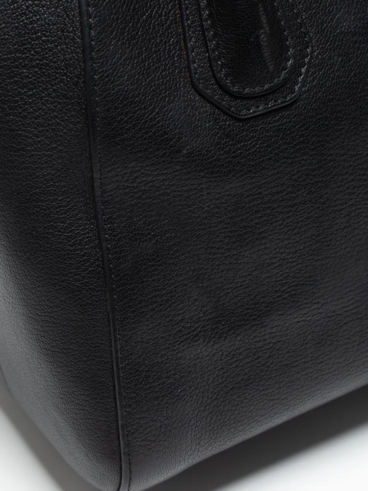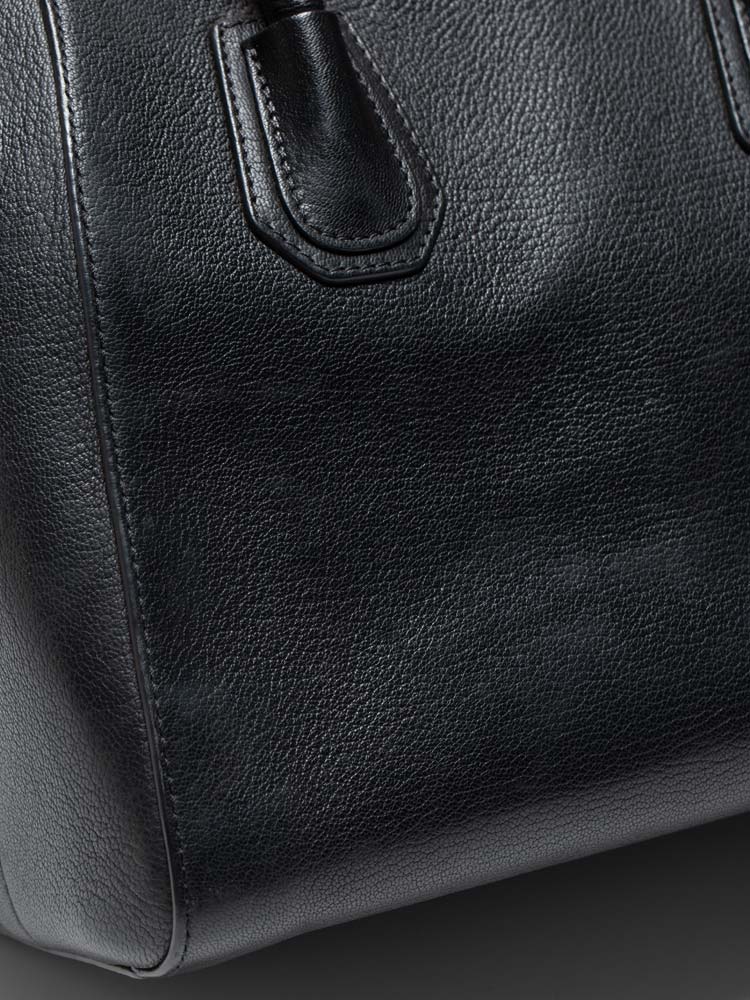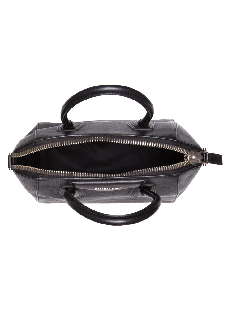 Crafted of grained goatskin leather. It features rolled-leather top handles and an optional leather shoulder strap with silver hardware. The top opens with a zipper to a fabric interior with a zipper and patched pockets.