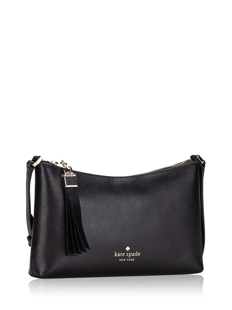 Made of saffiano leather. The bag features a zip closure that opens to two way script logo lining, gold-tone hardware, adjustable crossbody wear.