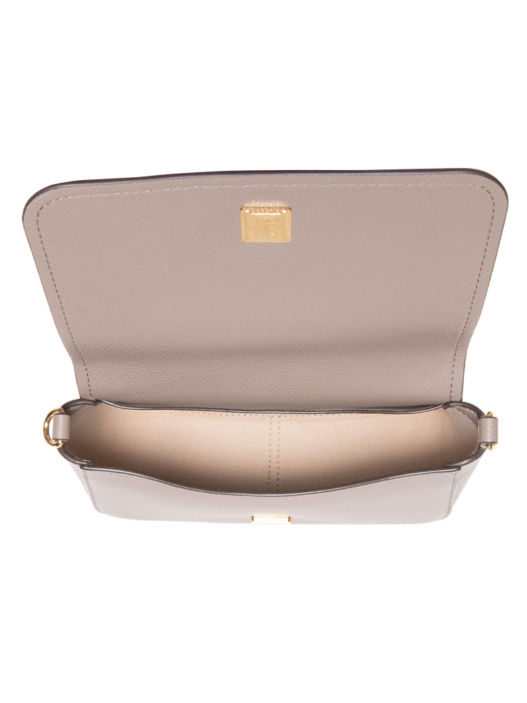 Made of pebble leather with suede lining. The bag features an open magnetic flap closure, gold tone hardware, two slip pockets, one rear eksterior slip pocket.