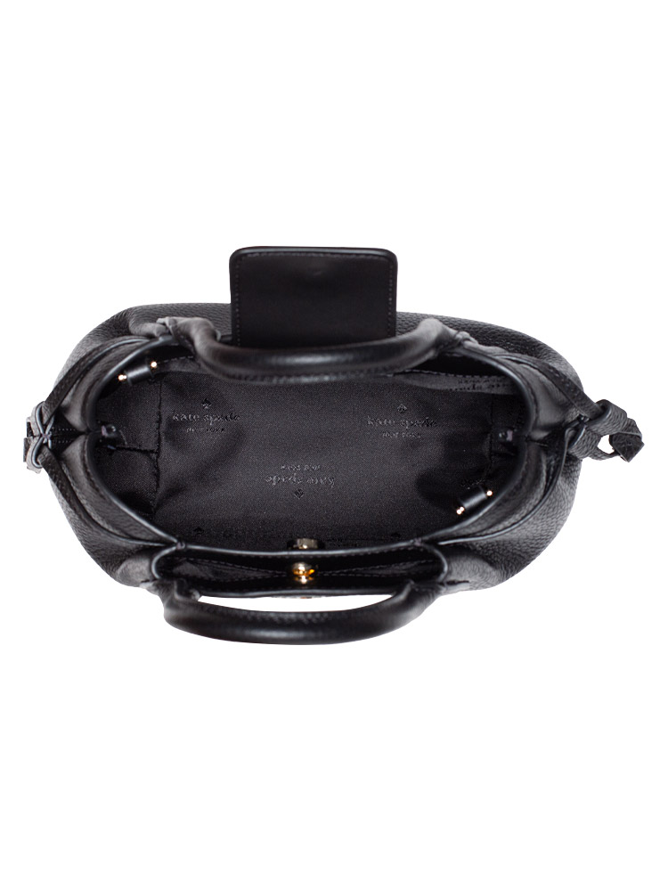 Made of pebbled leather. The bag features a magnetic closure that opens to two way spade jacquard lining with one zip pocket, exterior one slip magnetic pocket at front.