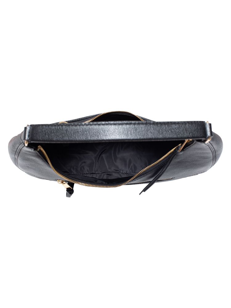 Made of pebble leather with nylon lining. The bag features an open zip closure, gold tone hardware, one zip pocket, and one eksterior front zip pocket.