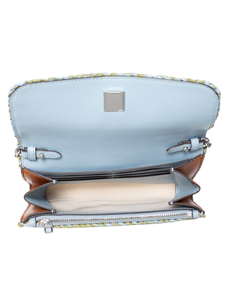Made of raffia and leather. The bag features a flap magnetic closure that opens to fabric lining with one slip pocket, one zip pocket, six card slots, removable chain strap.
