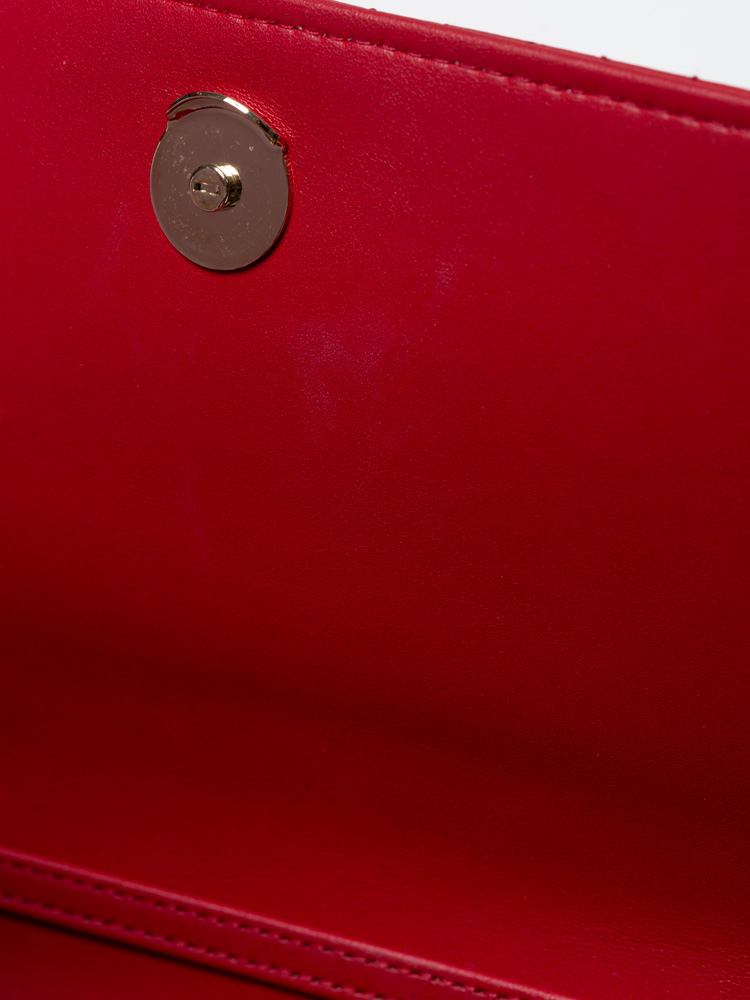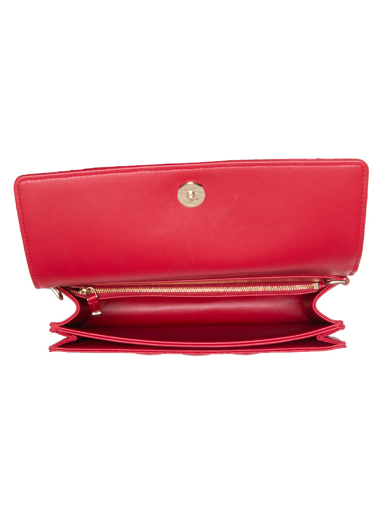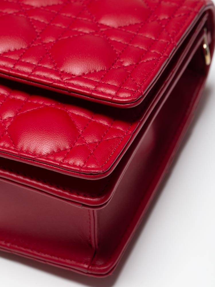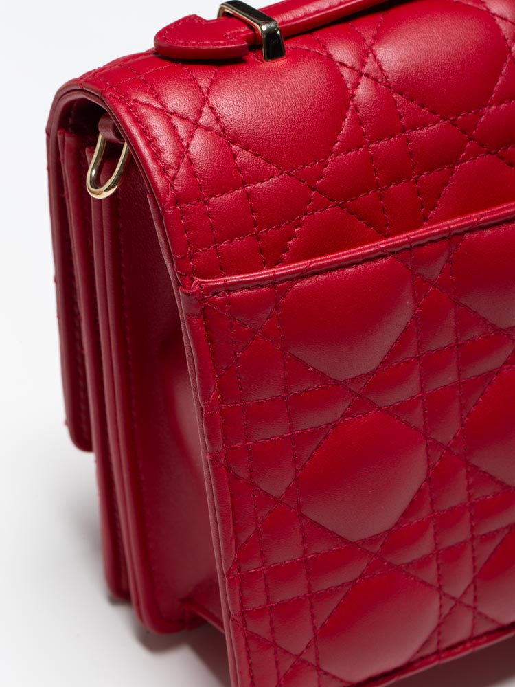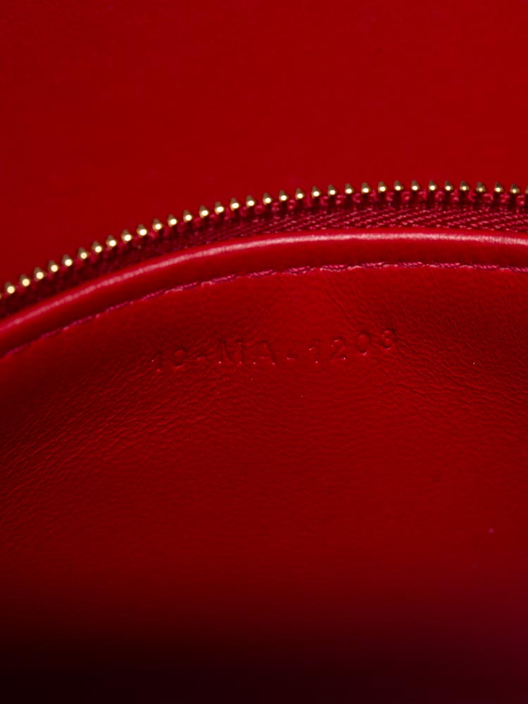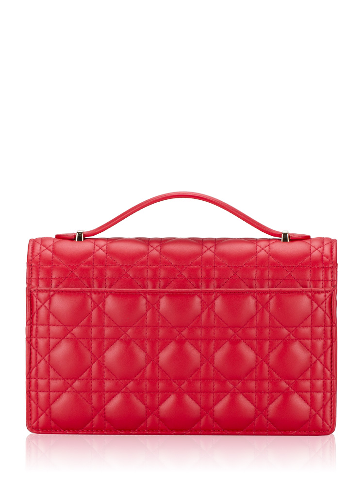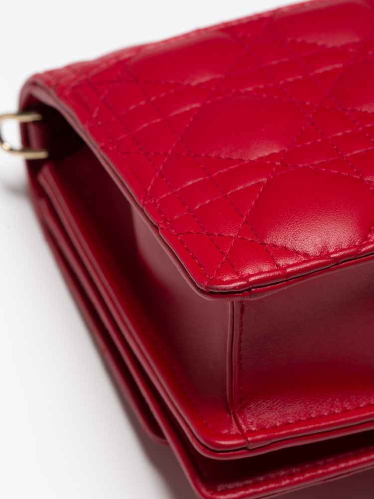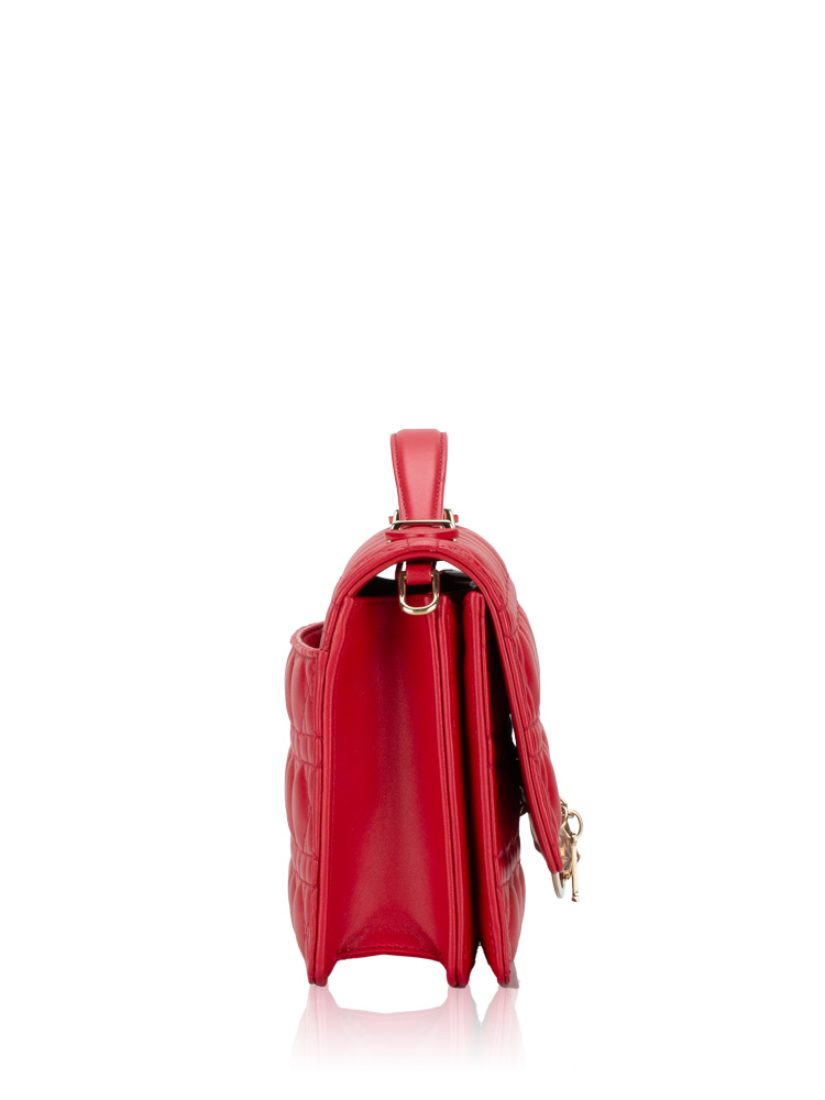Crafted of lambskin leather. The shoulder bag features a leather strap top handle and gold hardware. The facing flap opens with a magnetic clasp to a partitioned leather interior with a zipper pocket.