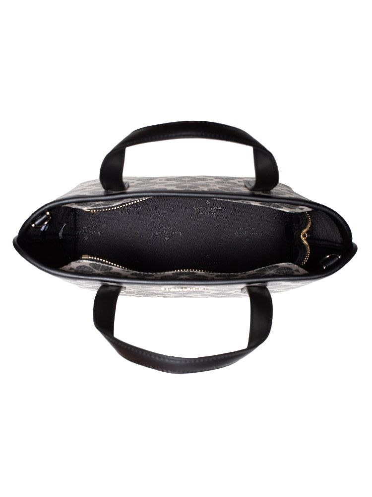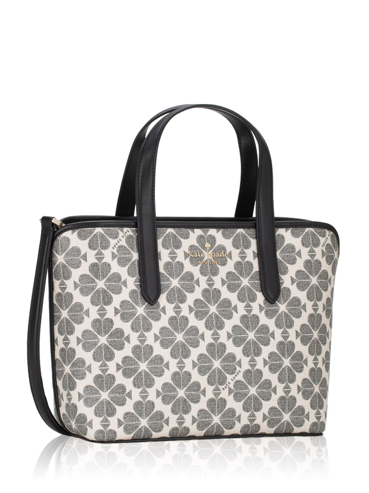 Made of spade flower pvc. The bag features a zip closure that opens to polyester lining with one slip pocket, double handles drop 13 cm, adjustable and removable long strap.