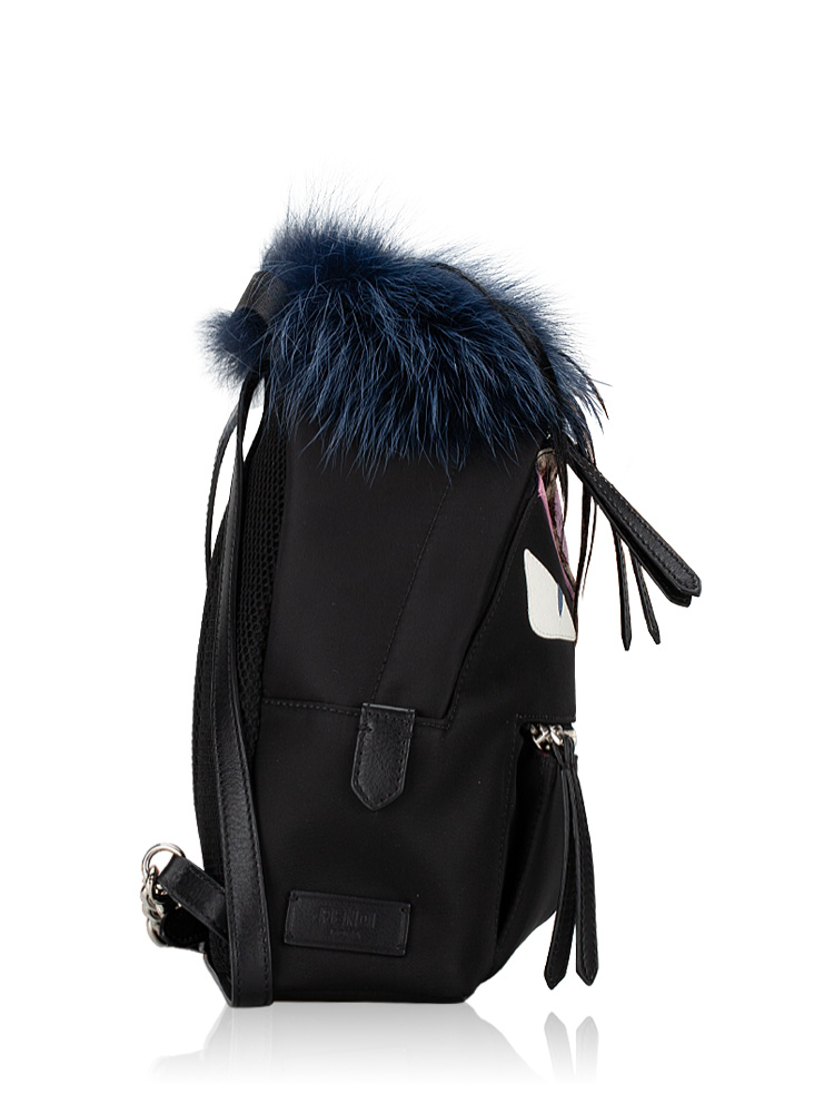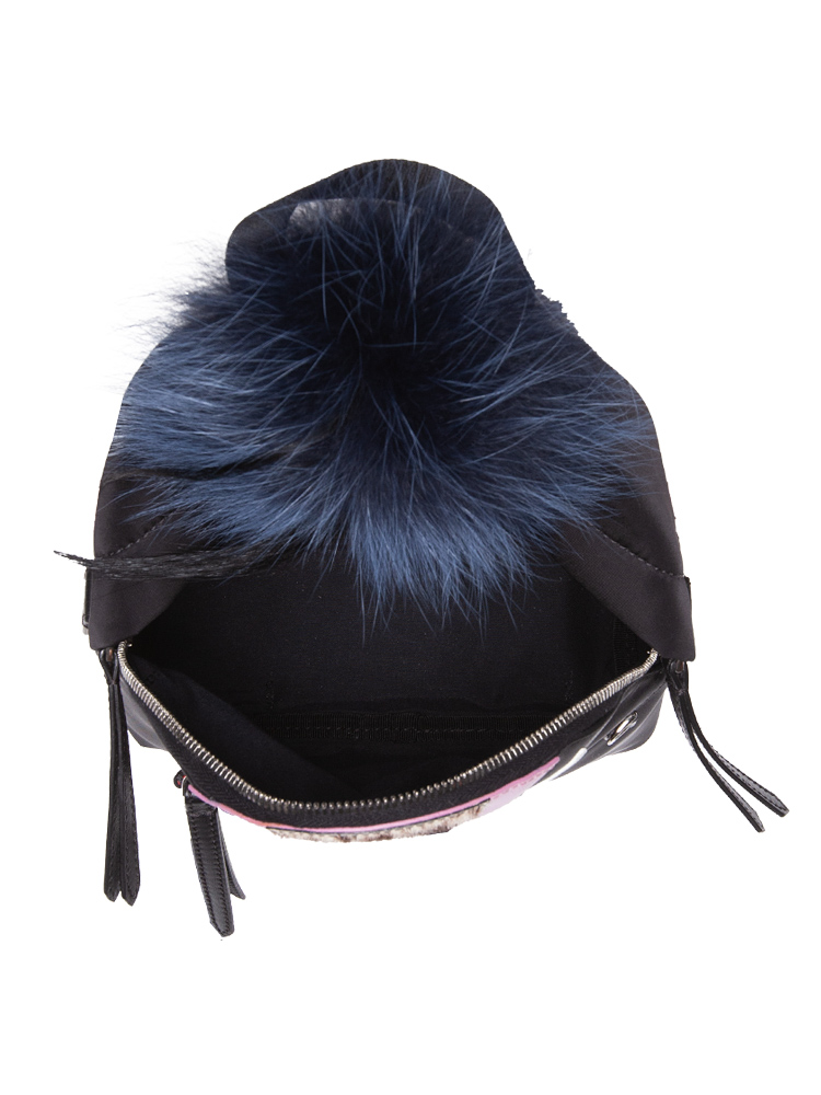 Crafted of nylon with the signature bag bugs look. It features a adjustable shoulder straps, a facing zippered pocket, white and blue eyes, a patch of leopard print fabric and goat fur at the top.