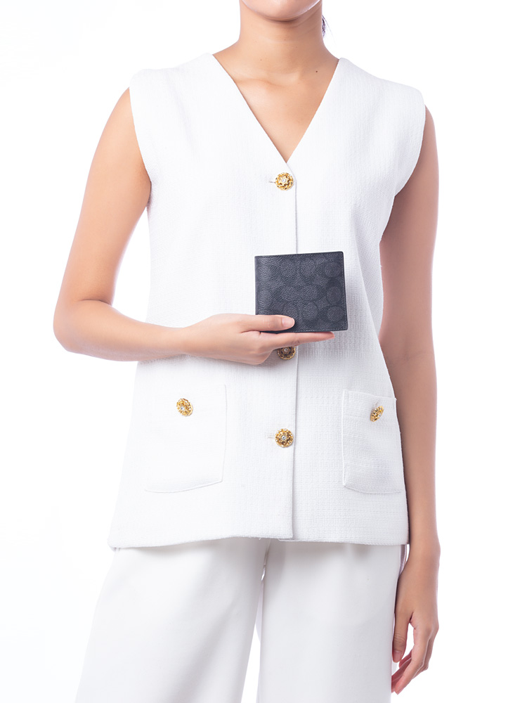 Signature coated canvas with smooth leather and fabric lining. The bifold waalet features four card slots, two side card slots, one coin pocket and two bill compartments