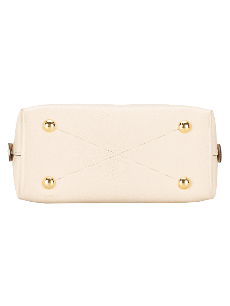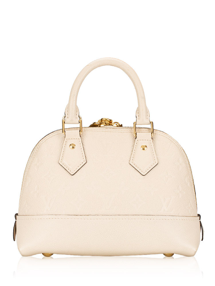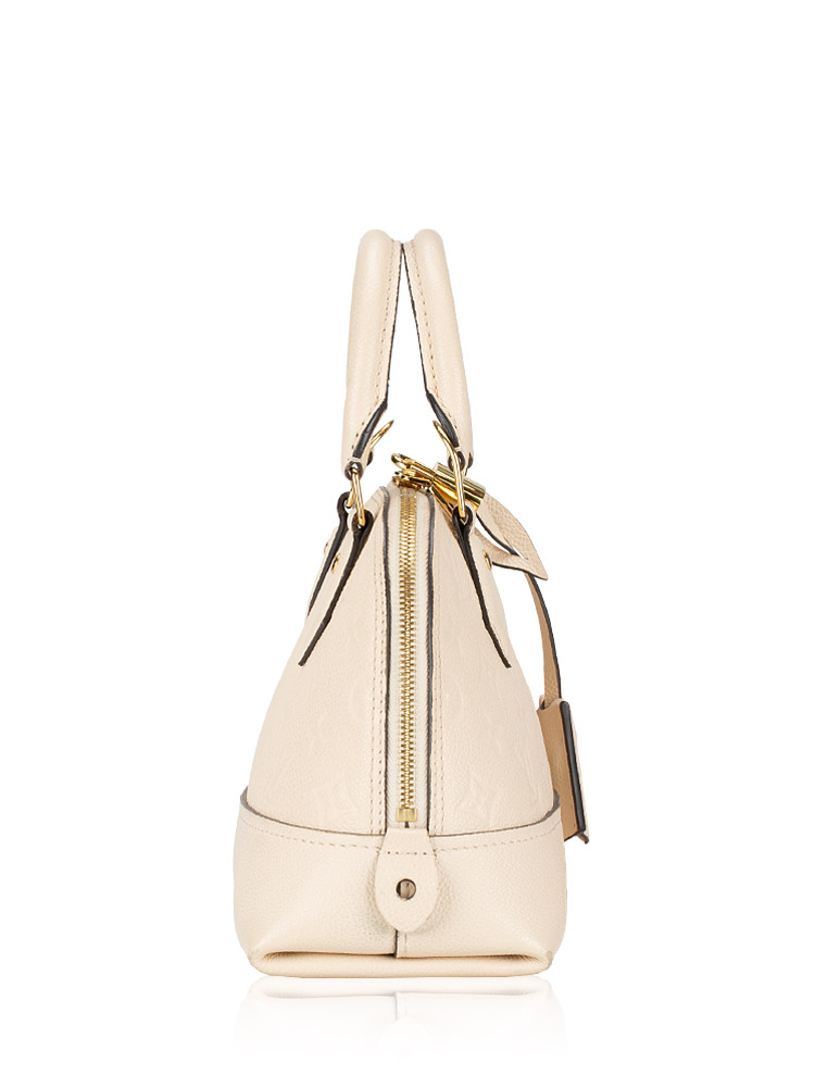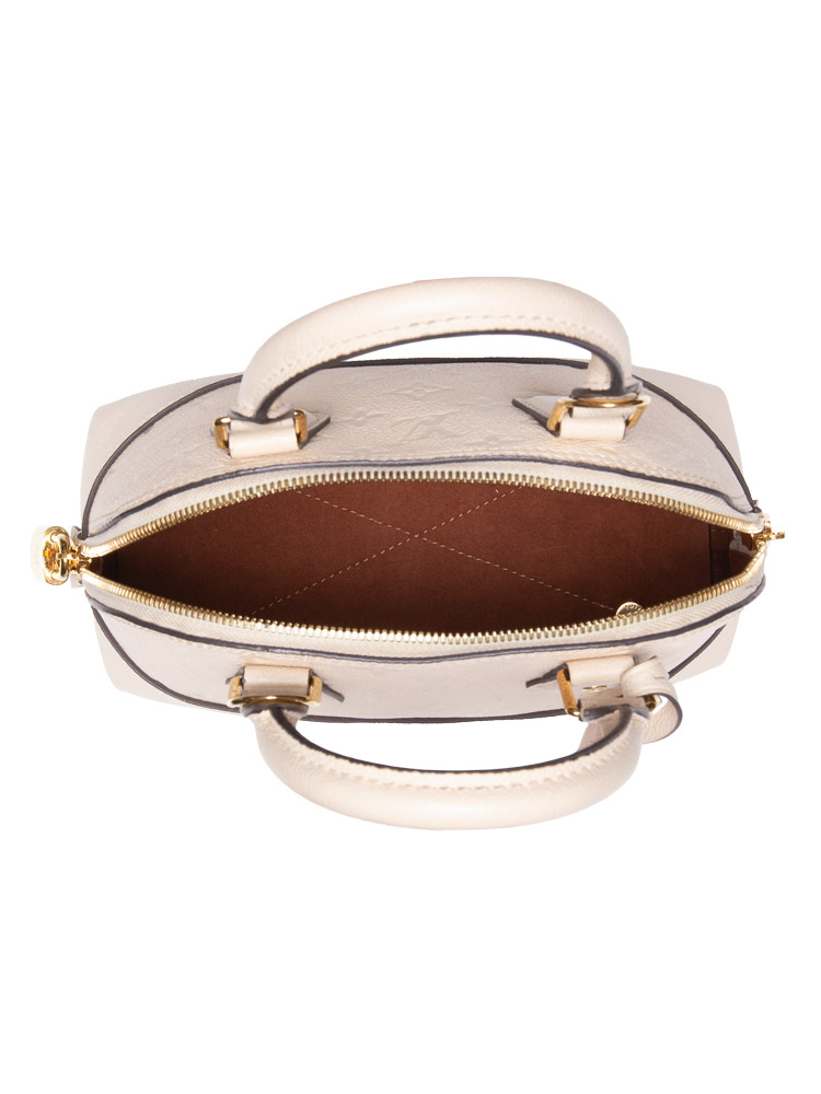 Crafted of embossed calfskin leather. It features rolled leather top handles, an optional strap, and polished gold hardware. The top zipper opens to a microfiber interior with a patch pocket.