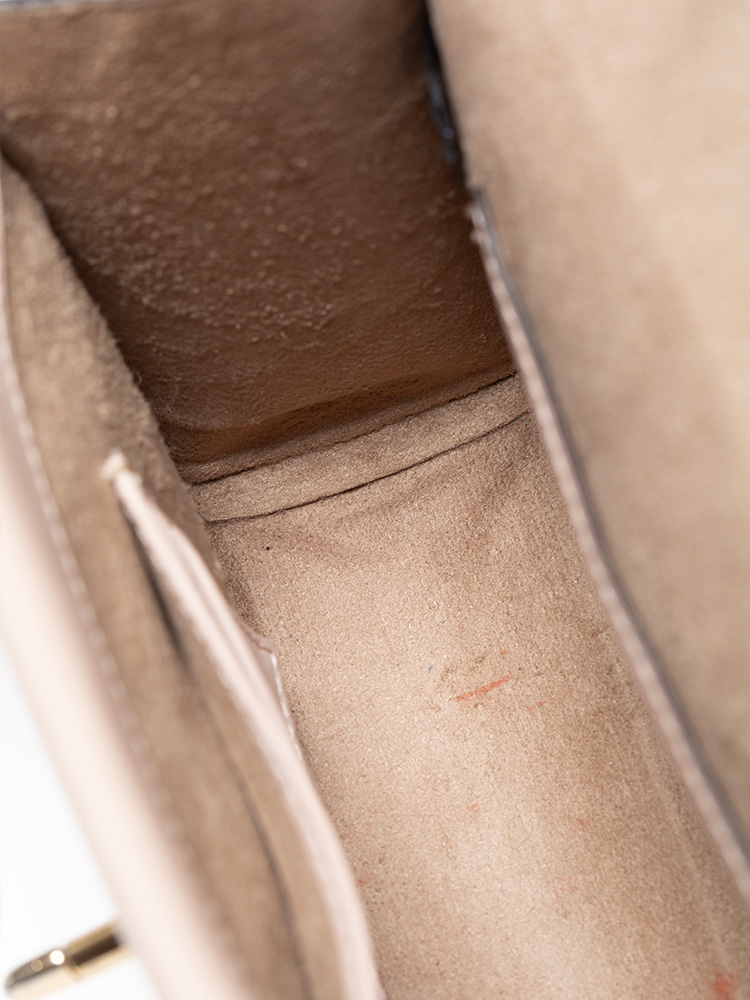 Made of saffiano leather with smooth leather and suede lining. The bag features an open turn lock closure, gold tone hardware, three card slots, one slip pocket, one hidden slip pocket with flap, and one rear eksterior slip pocket