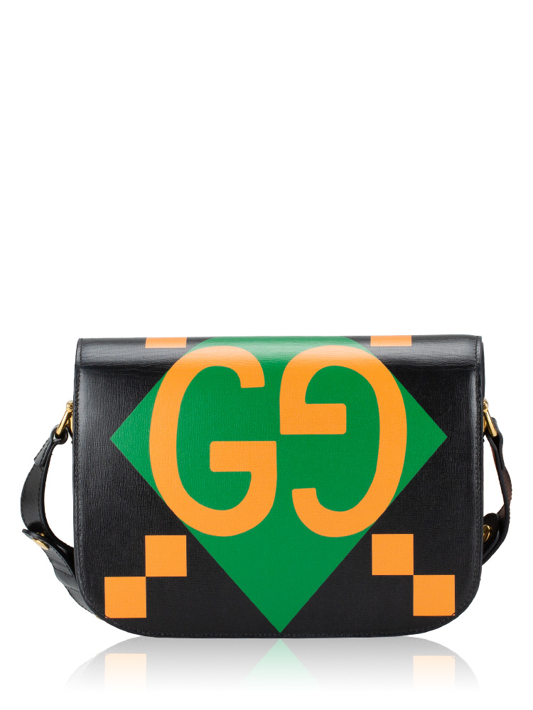 This bag is crafted of calfskin leather with geometric printed on it. It features adjustable long strap, and the flap opens to fabric lining with zipper pocket .