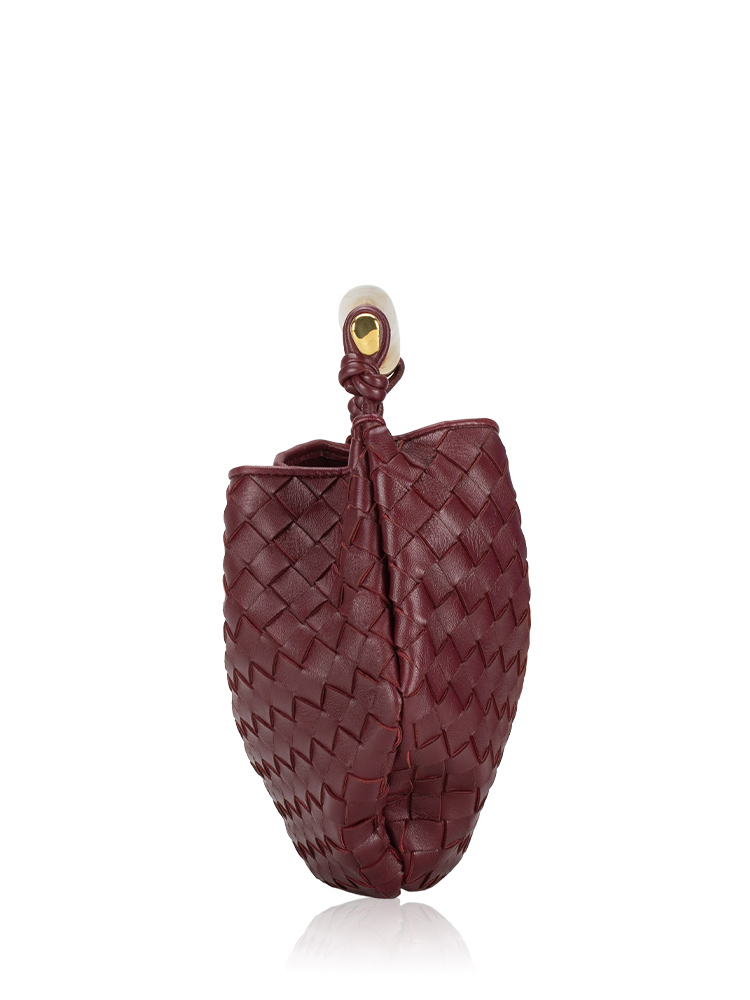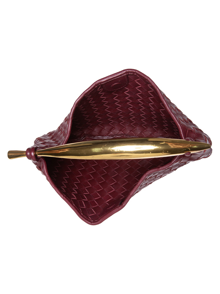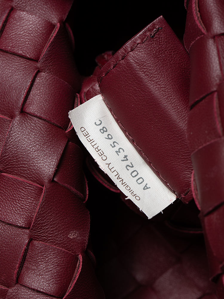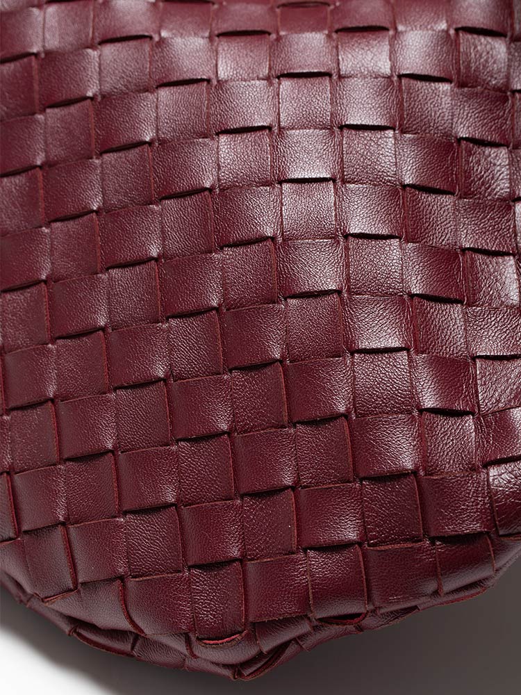 Crafted of intrecciato tightly woven lambskin leather. The bag features a gold top handle and opens to a matching leather interior.
