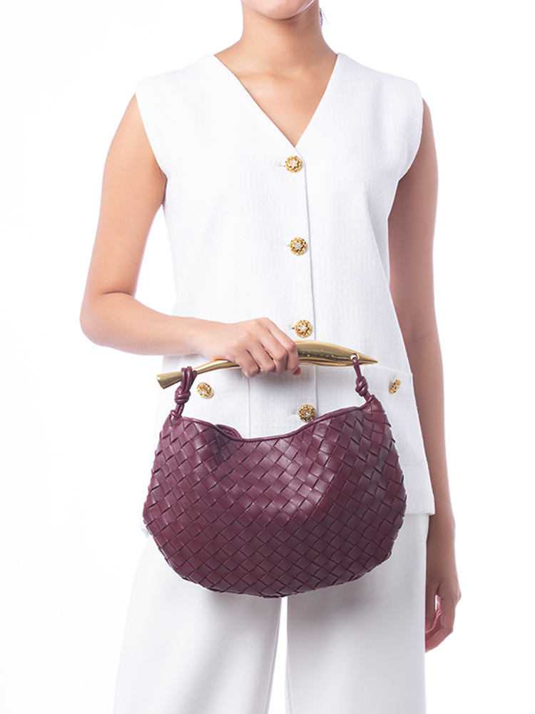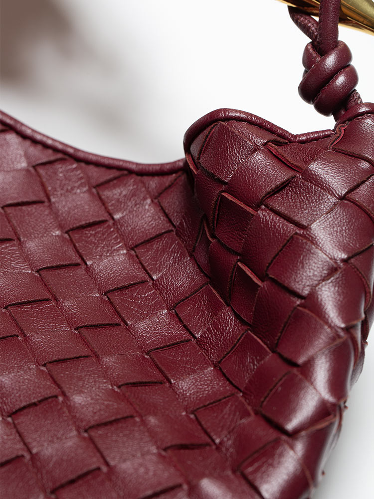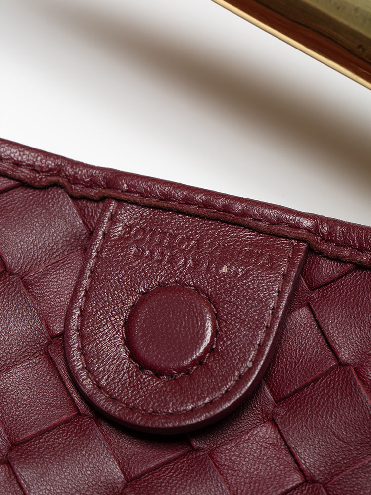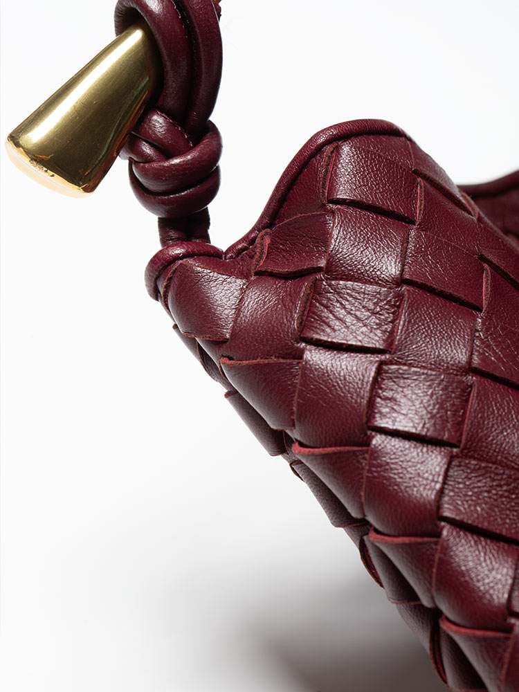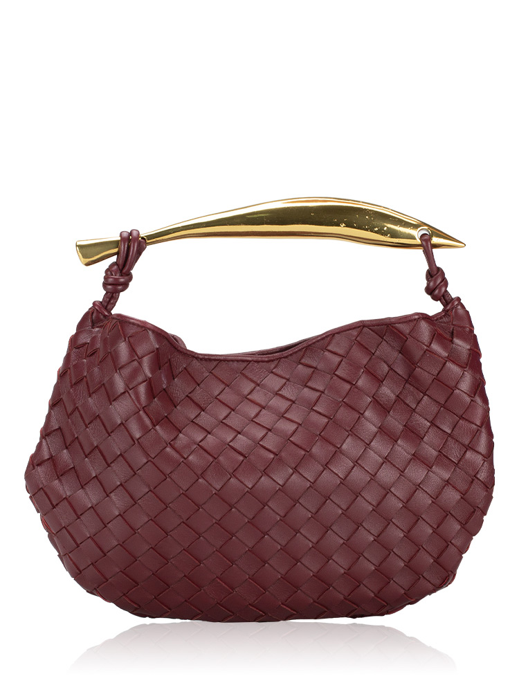 Crafted of intrecciato tightly woven lambskin leather. The bag features a gold top handle and opens to a matching leather interior.