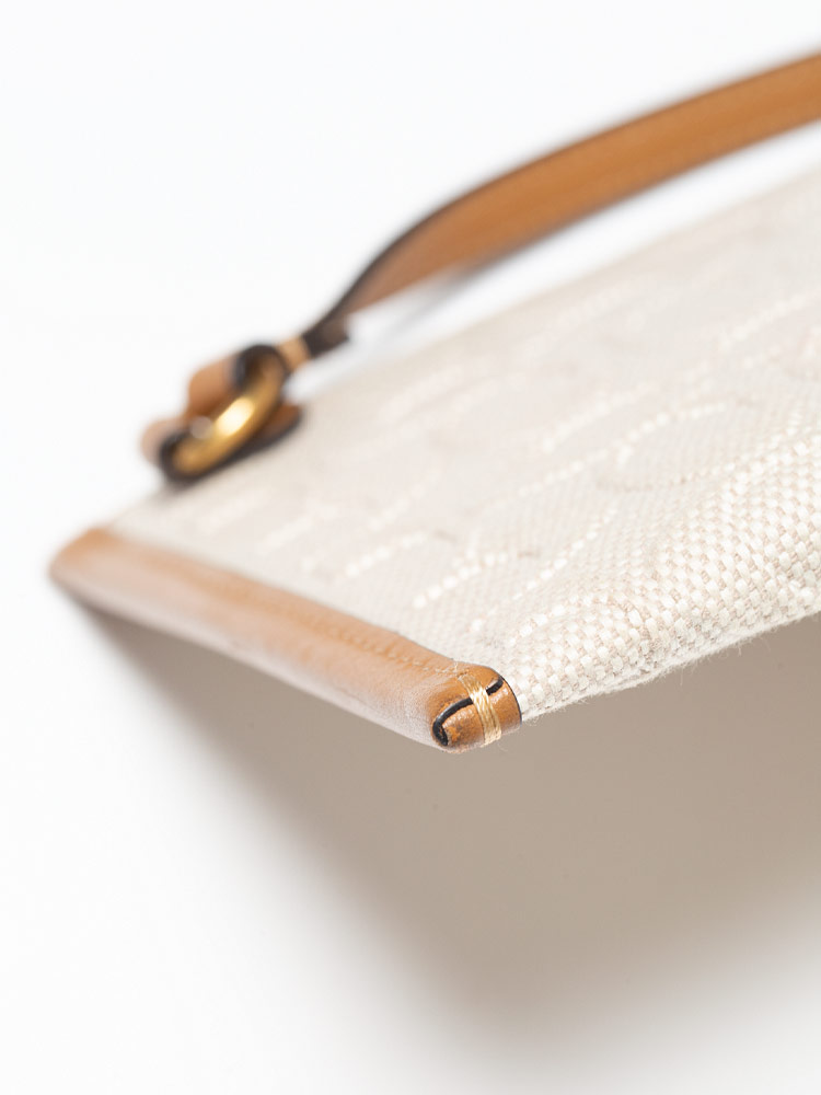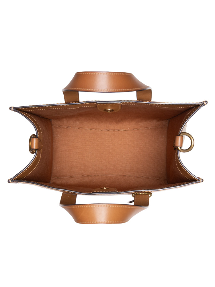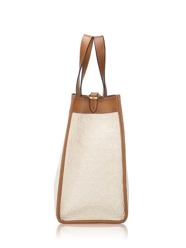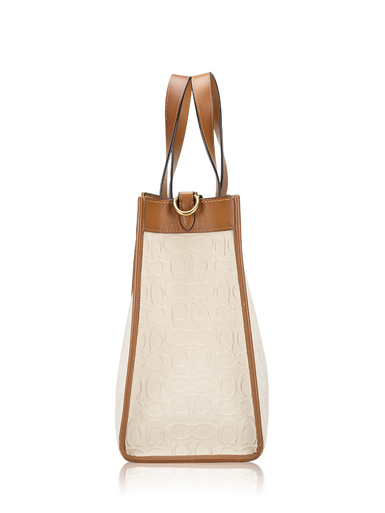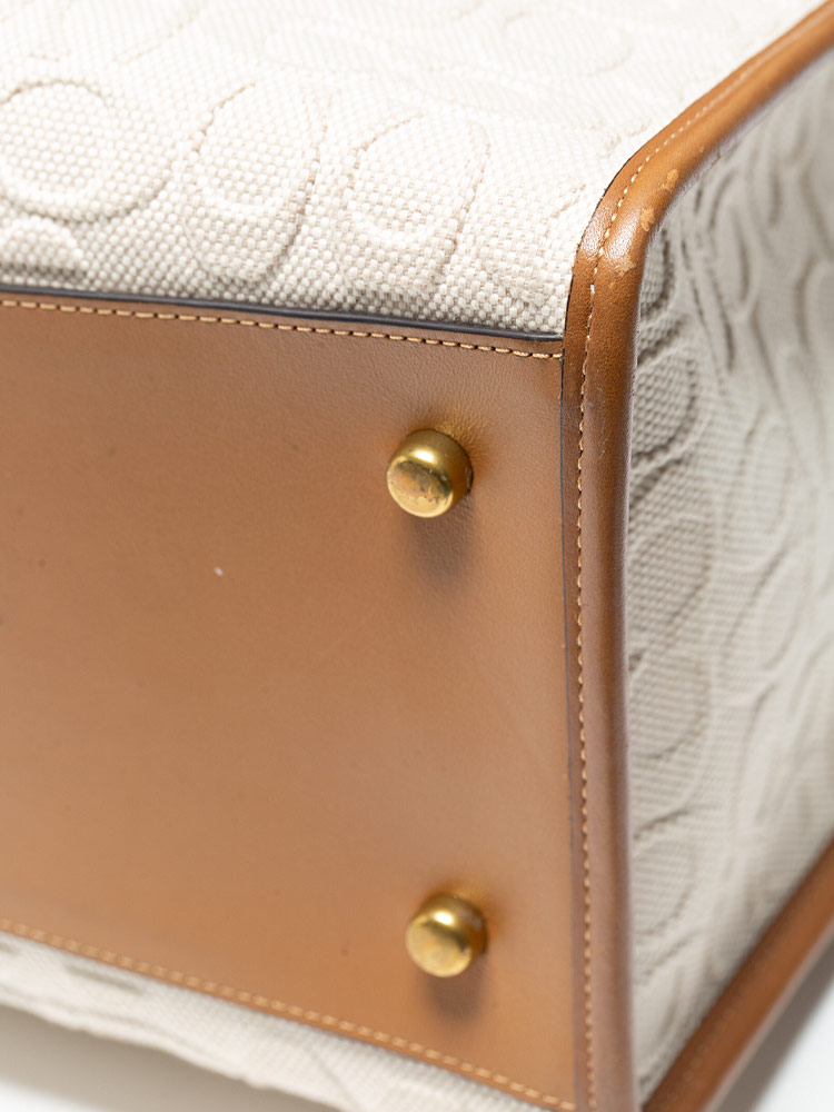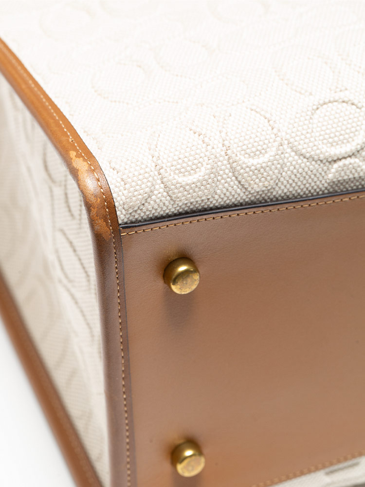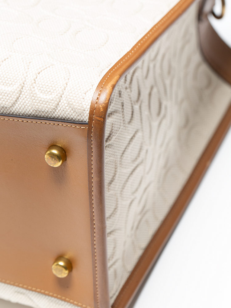 Made of canvas and leather. The bag features a open magnetic closure that opens to fabric lining with removable Pochette, adjustable and removable long strap, double handles drop 18 cm.