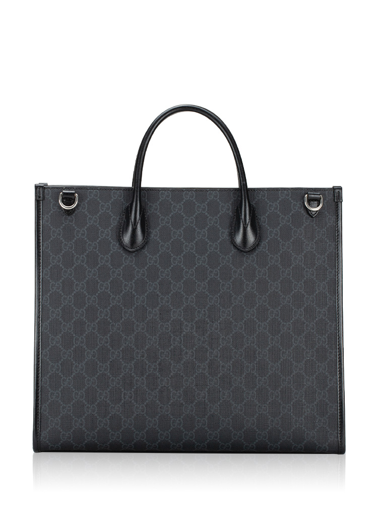 This tote is crafted of classic Gucci GG supreme monogram-coated canvas. Features leather handles, an optional adjustable shoulder strap, and silver hardware. The bag has an open top with a fabric interior and a zipper pocket.