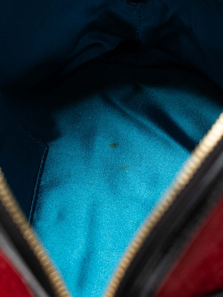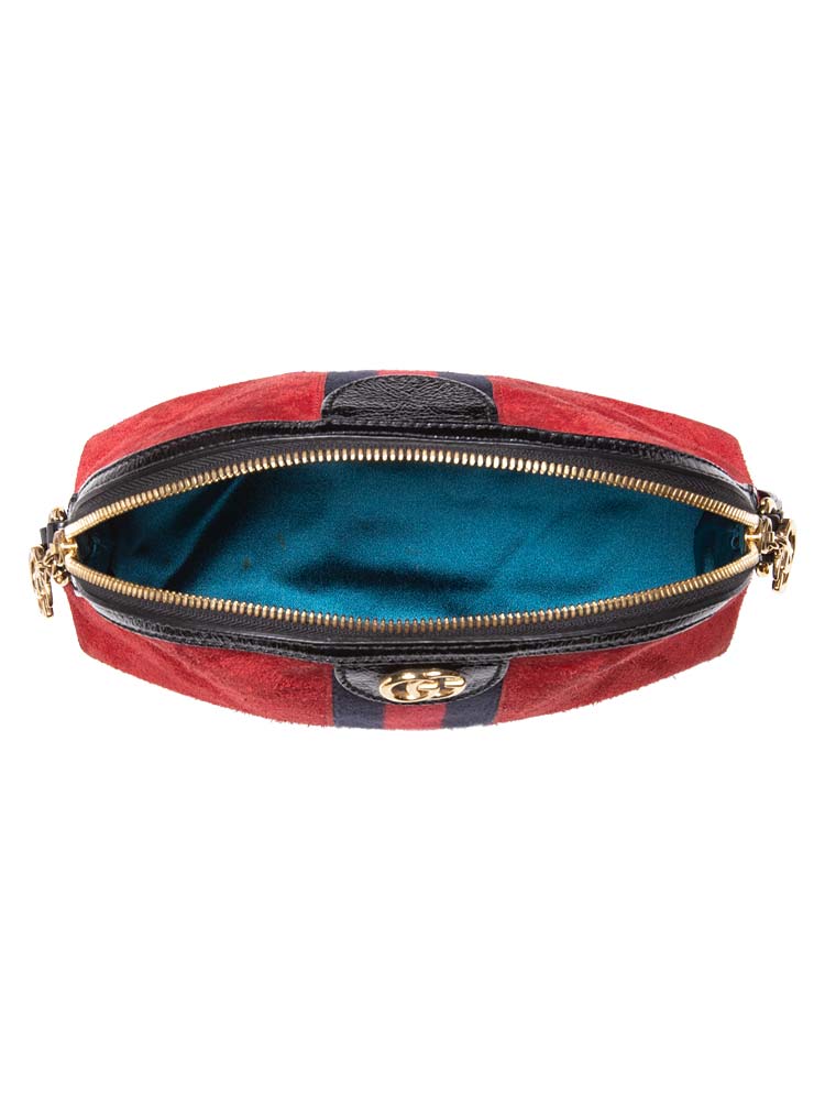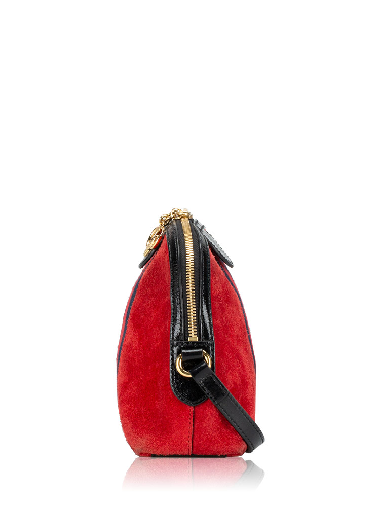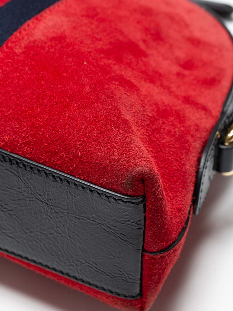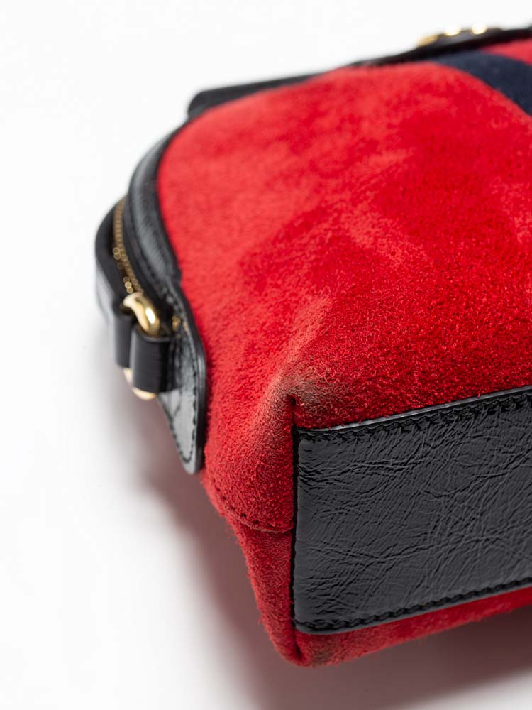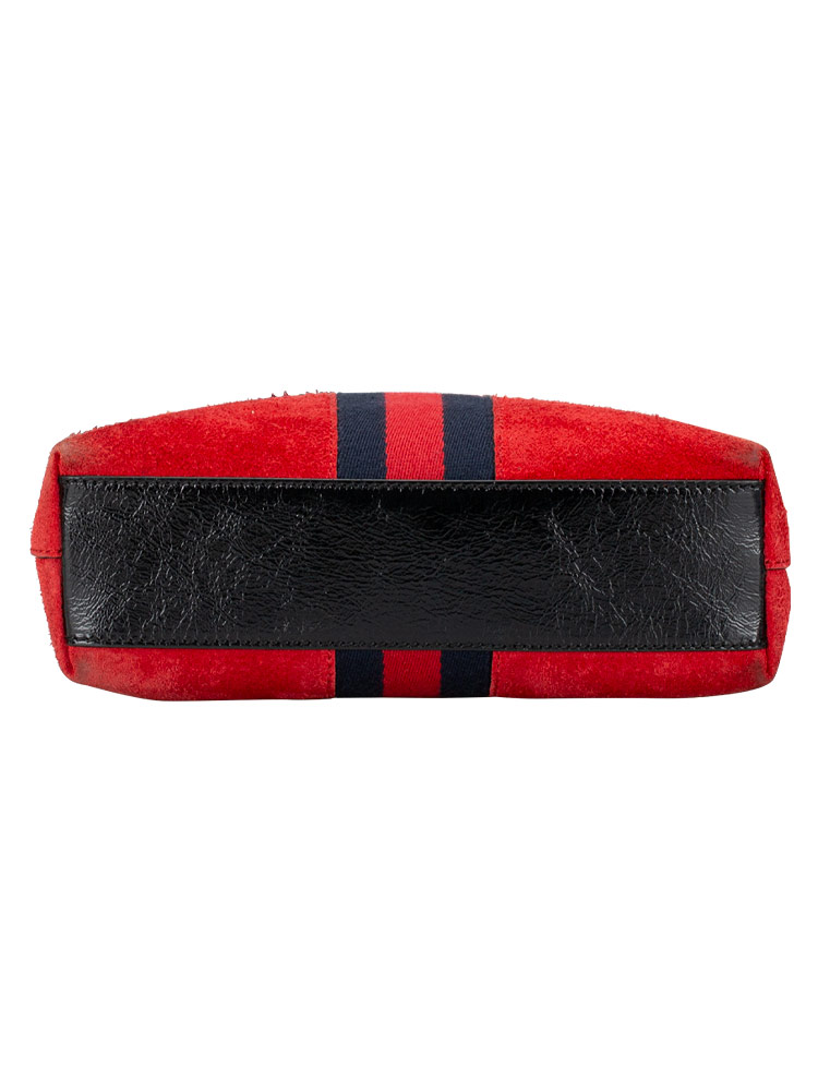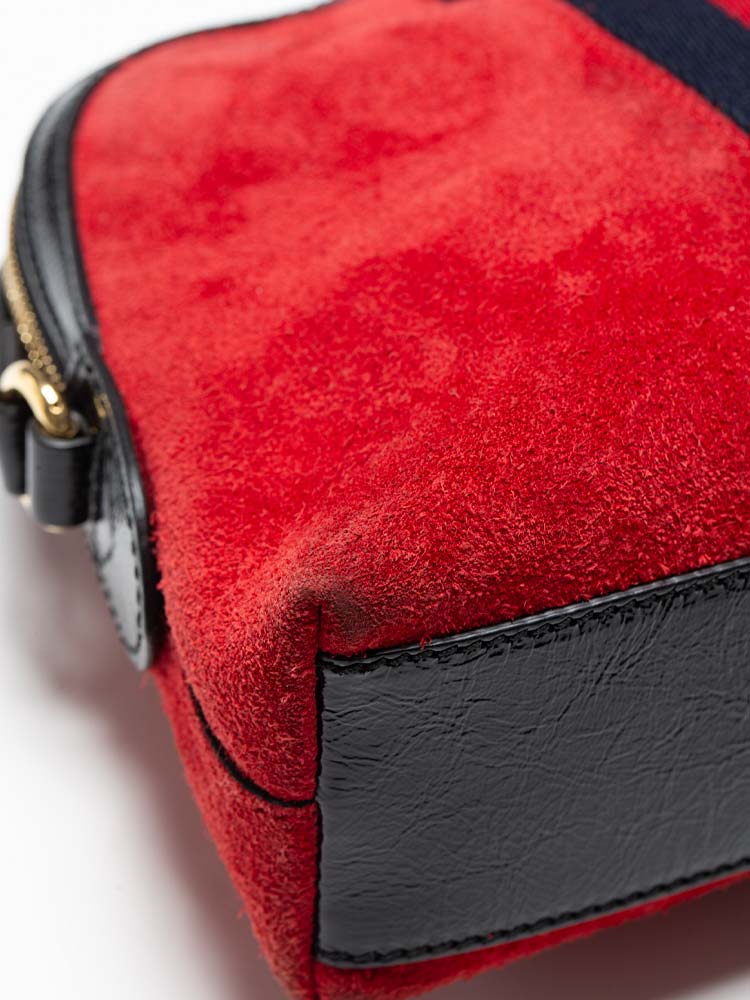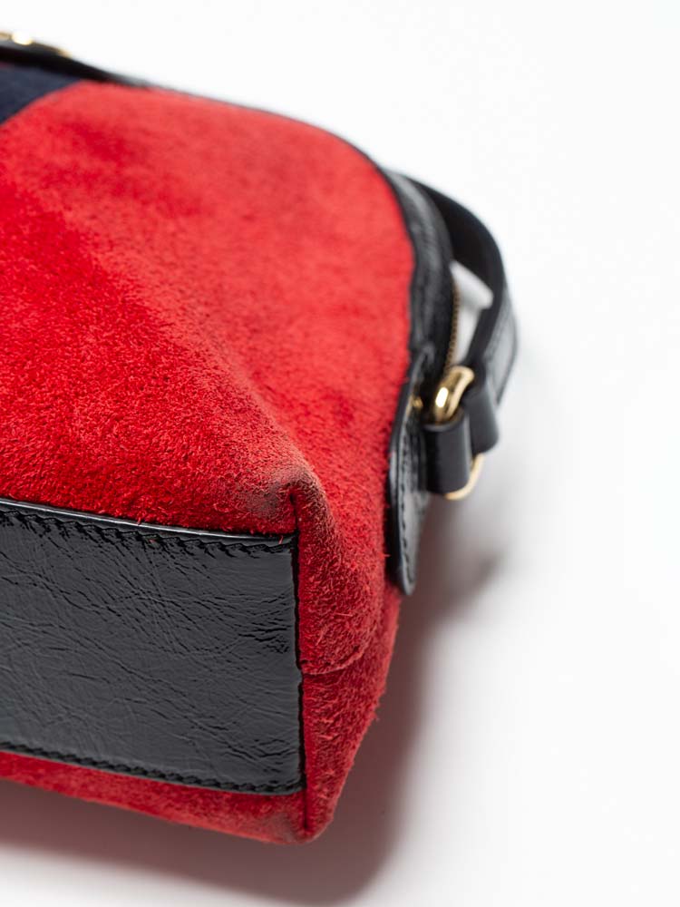 Crafted of red suede with black leather trim and a navy blue and red Gucci web detail. The bag features an adjustable patent leather shoulder strap and gold hardware. This opens to a satin interior and multiple patch pockets.