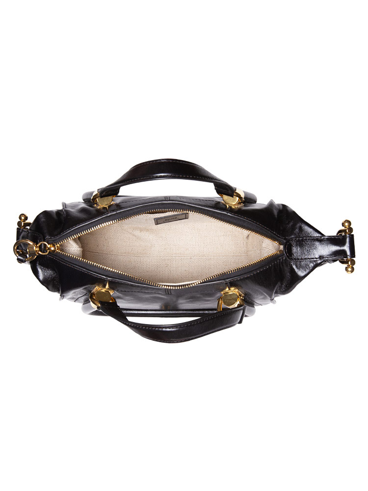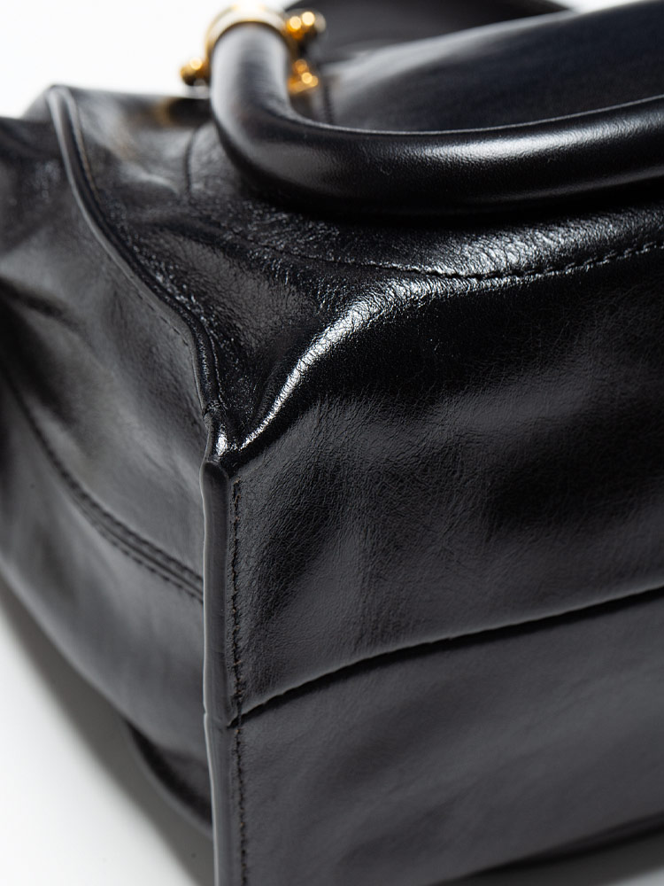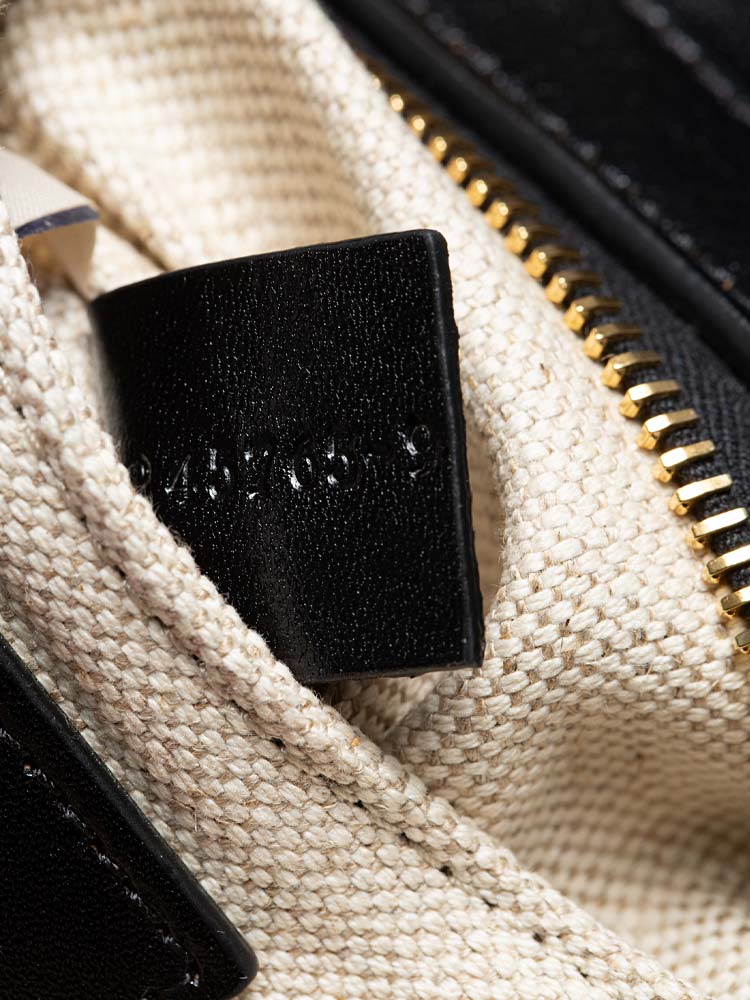This tote is crafted of black shiny calfskin leather and gold hardware. This bag features two sturdy leather top handles and an optional adjustable shoulder strap. The top zipper opens to a beige fabric interior with a patch pocket.
