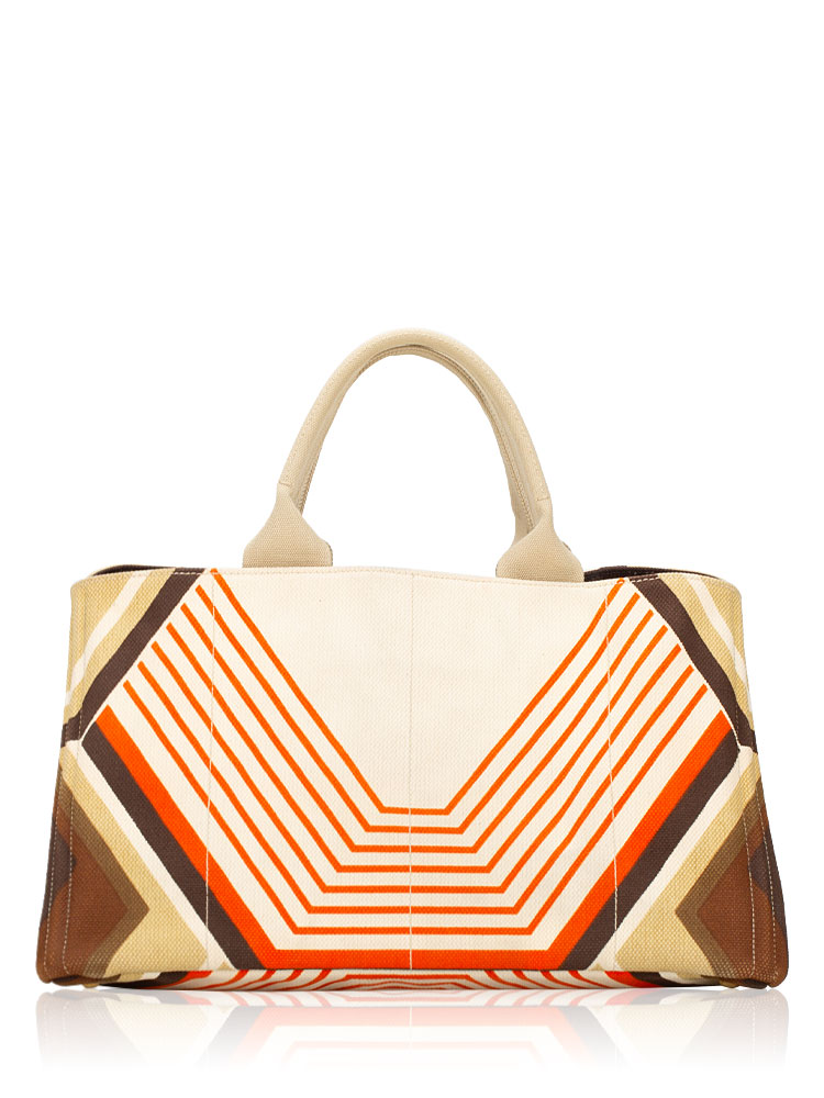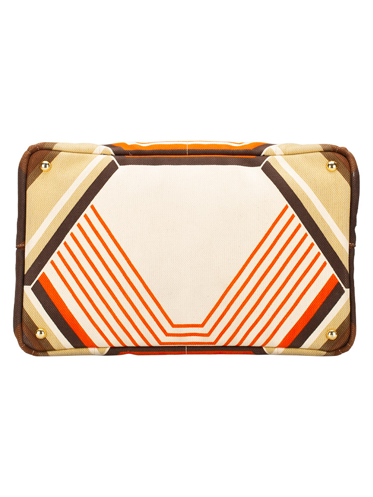 This tote is crafted of decorative multicolor canvas. The bag features canvas top handles and a base with studs. The top is open to a brown fabric interior with a zipper pocket.