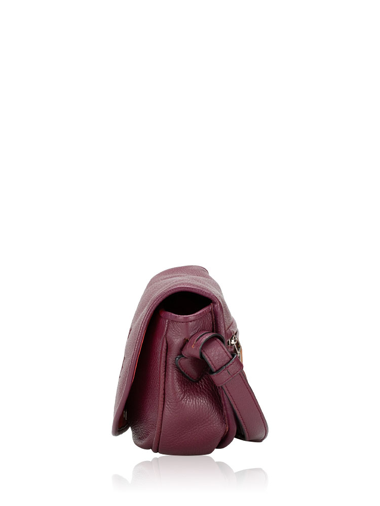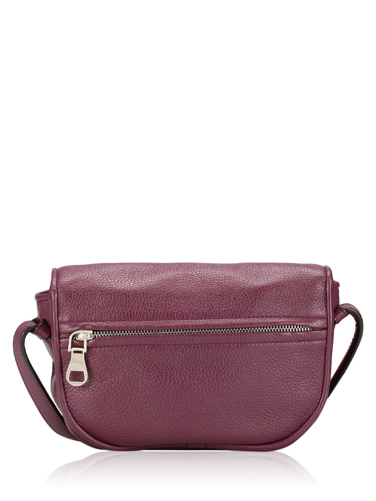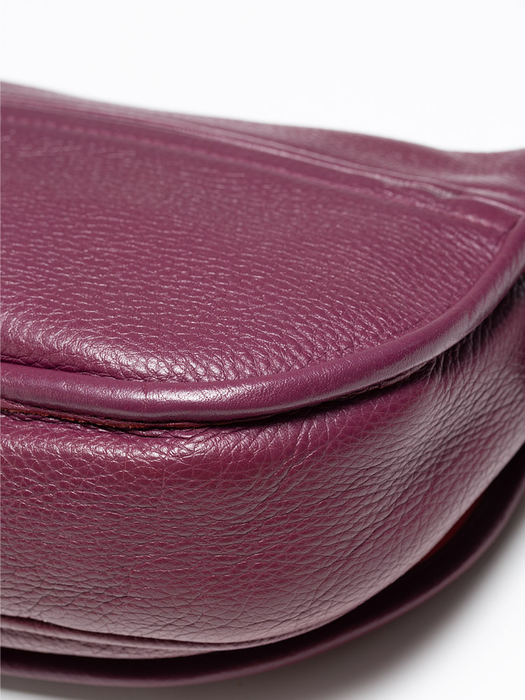 This bag is crafted of calfskin leather in a curved silhouette. Features with an adjustable leather shoulder strap with polished silver hardware, a hangtag and an exterior zipper pocket.