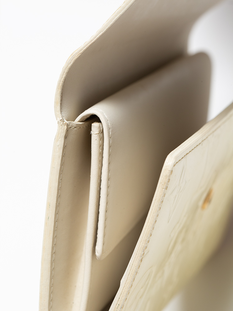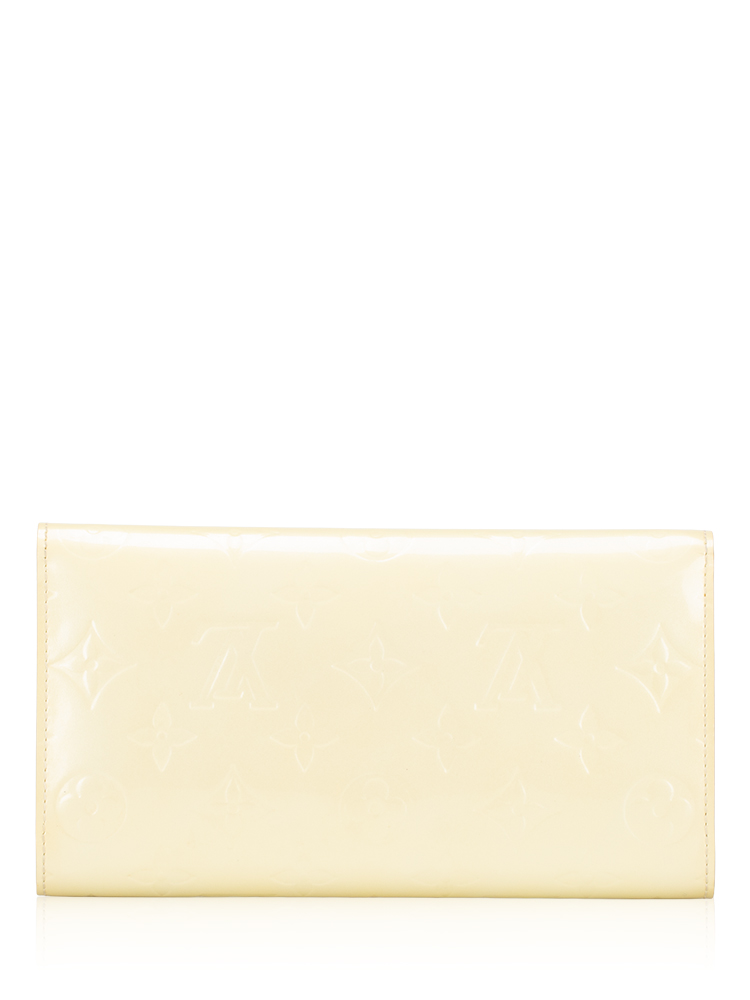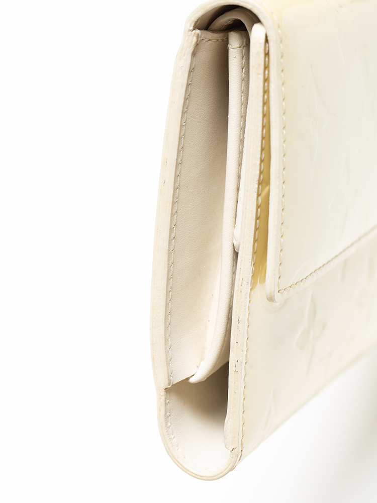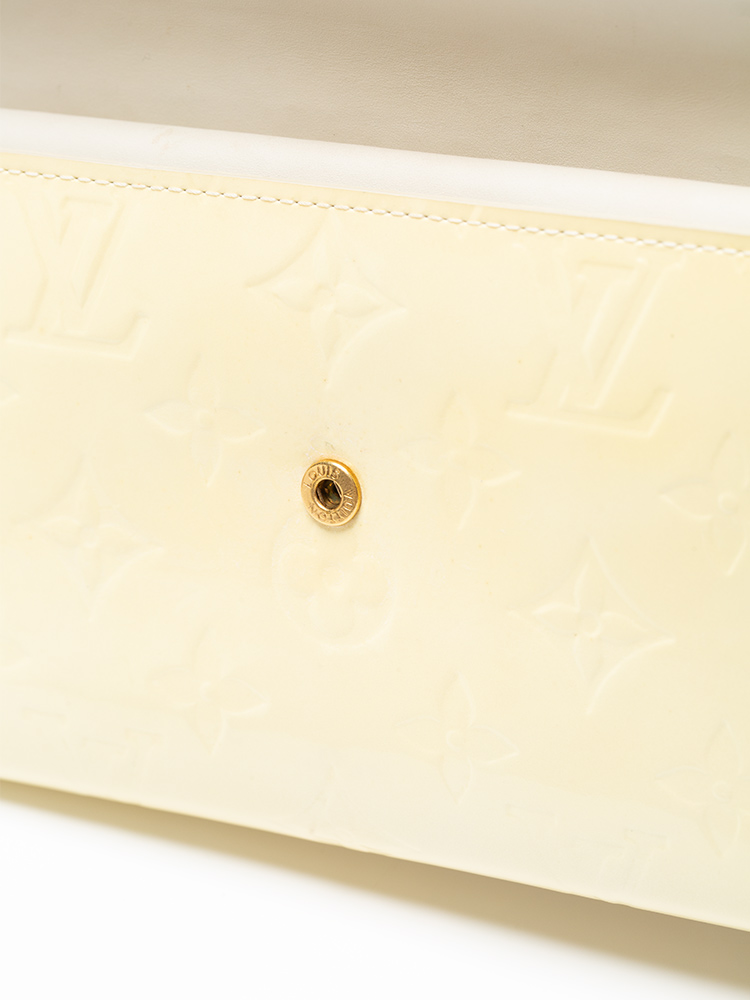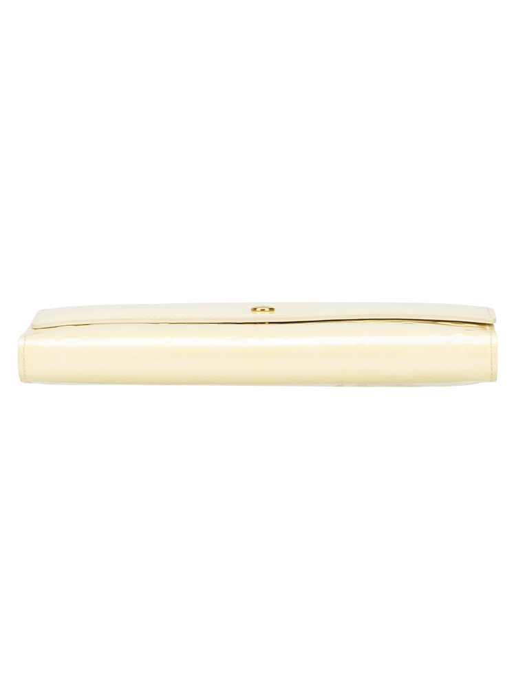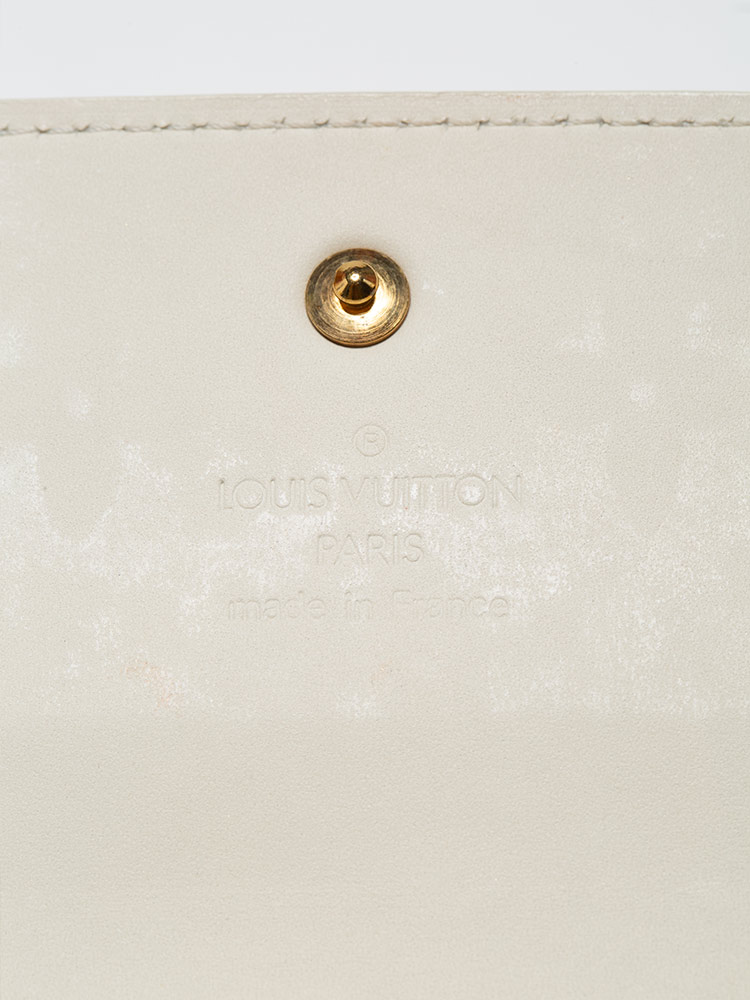 Crafted of Louis Vuitton monogram embossed vernis patent leather. The flap opens to a matching matte leather partitioned interior with a card slot panel, a flap compartment and open compartments.