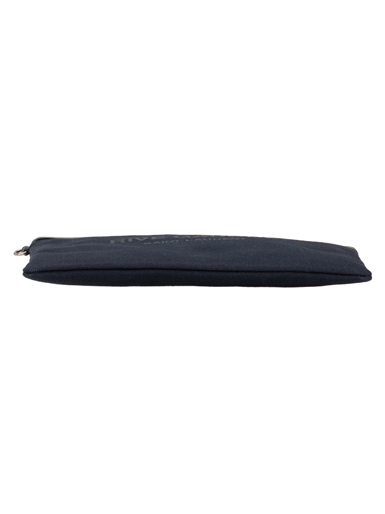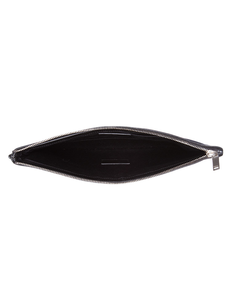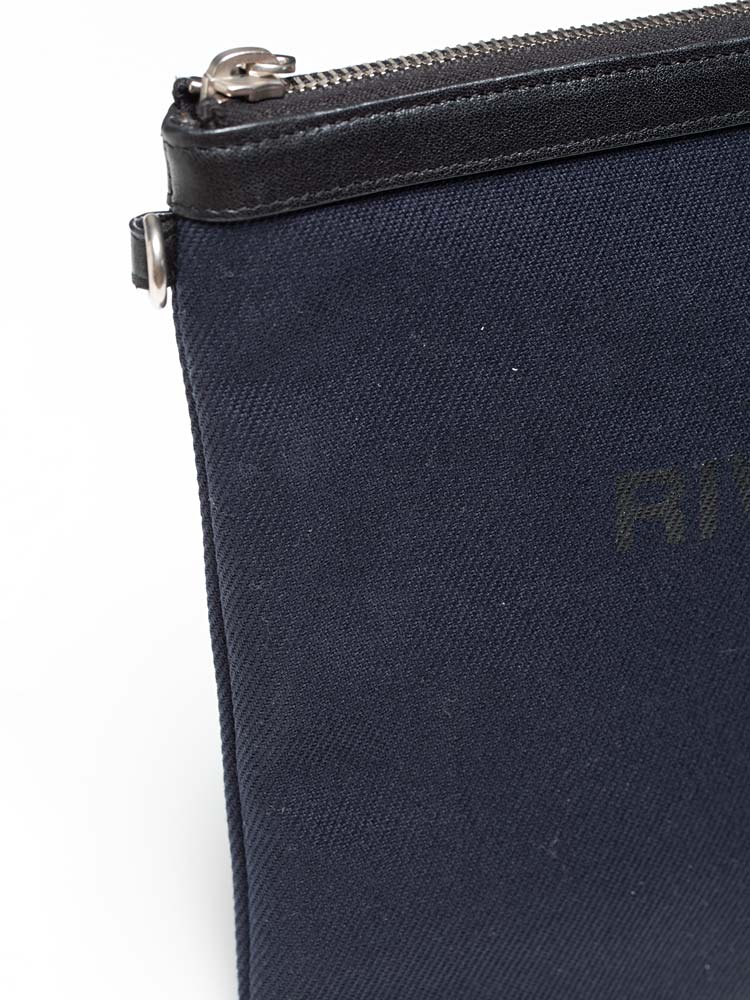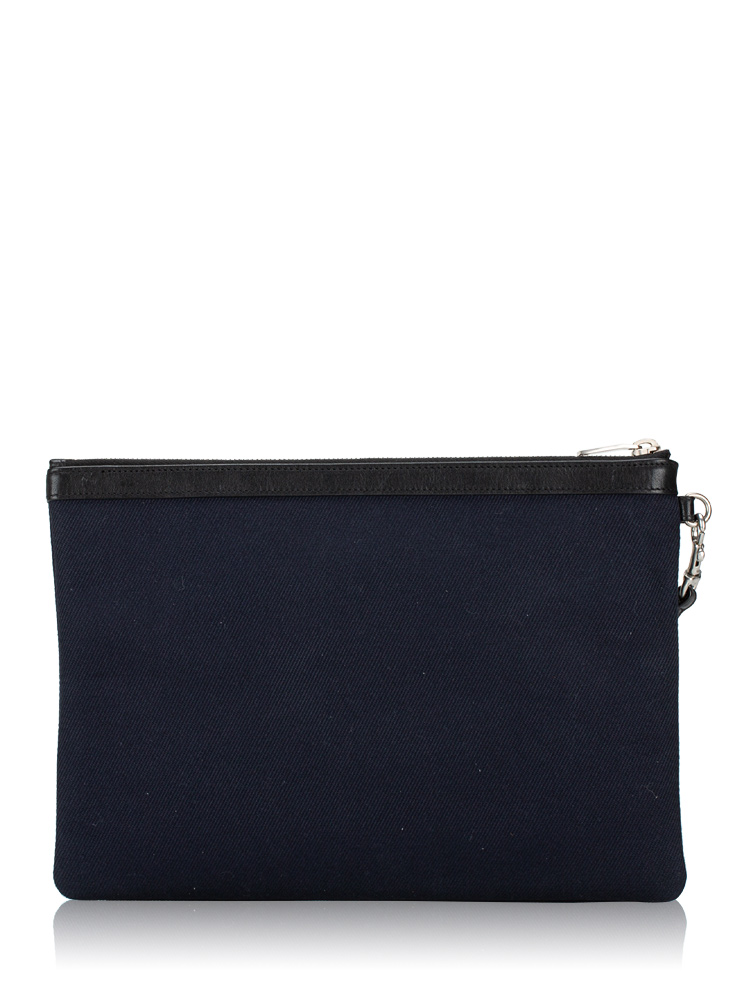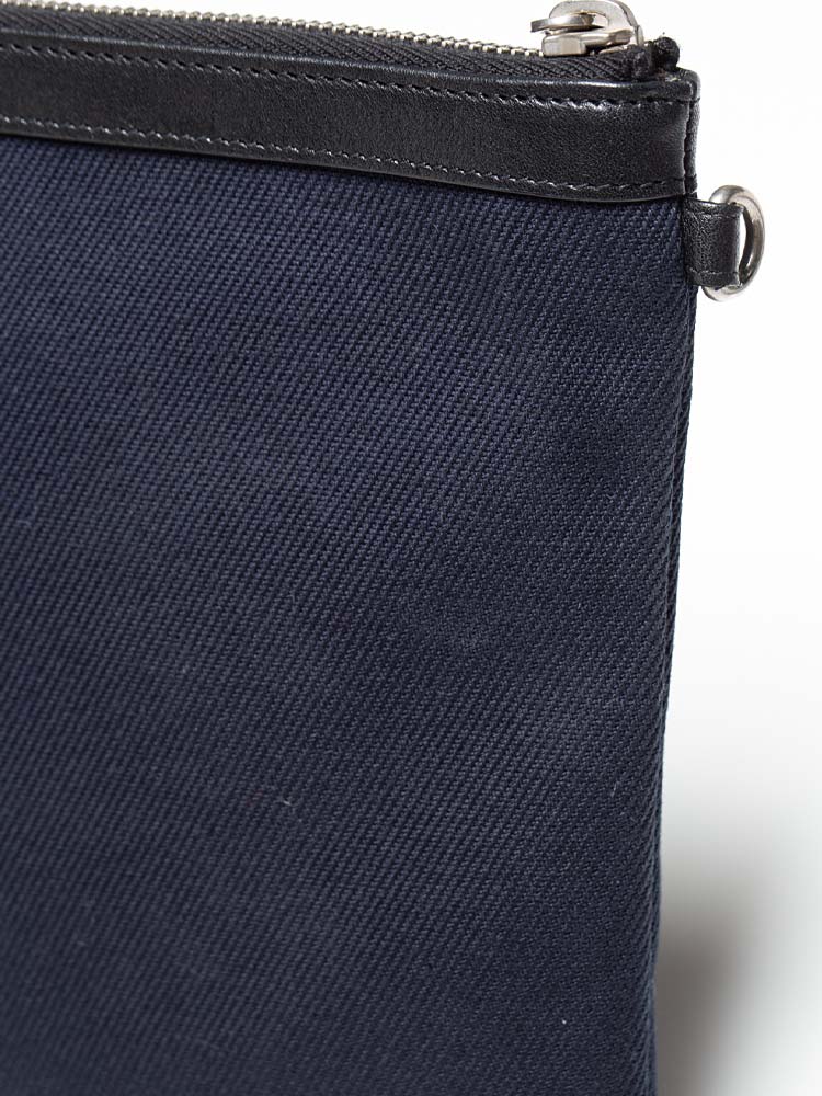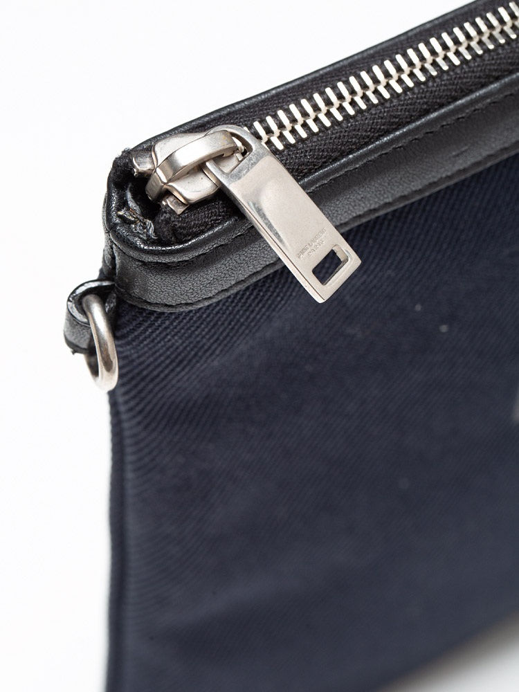 This pouch crafted of natural canvas with black calfskin leather. The top zipper opens to a black fabric interior with patch pocket.
