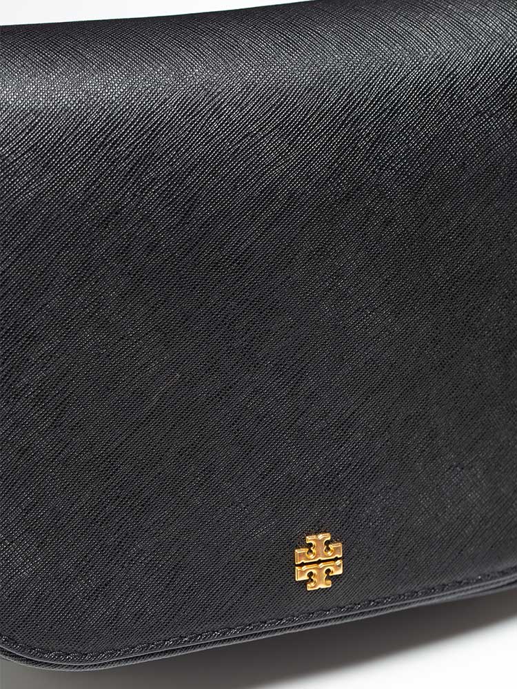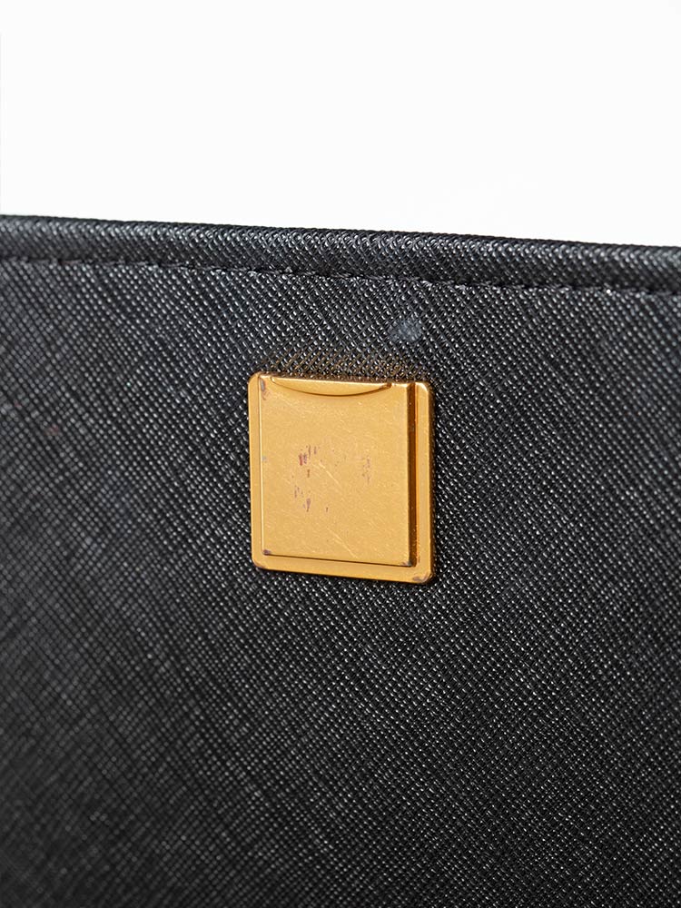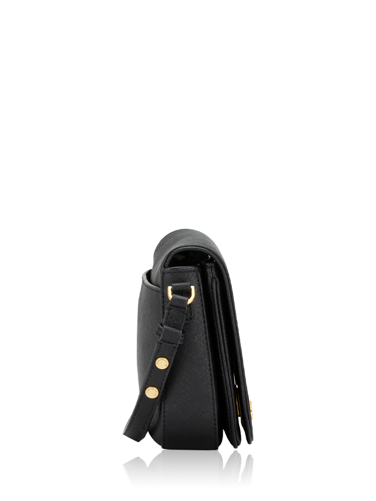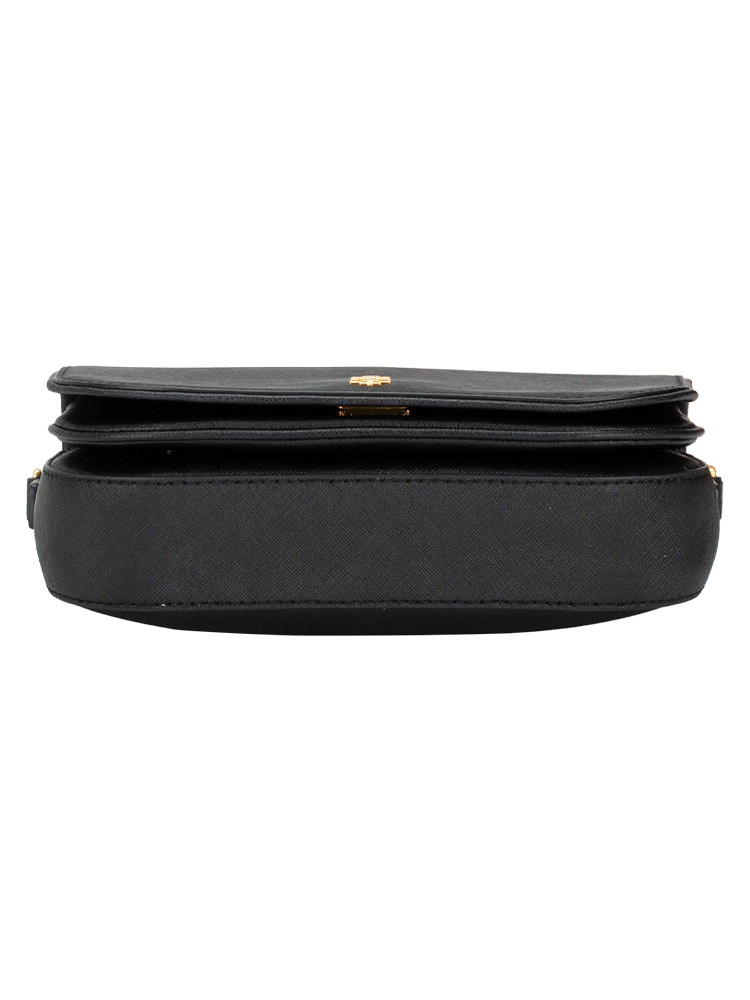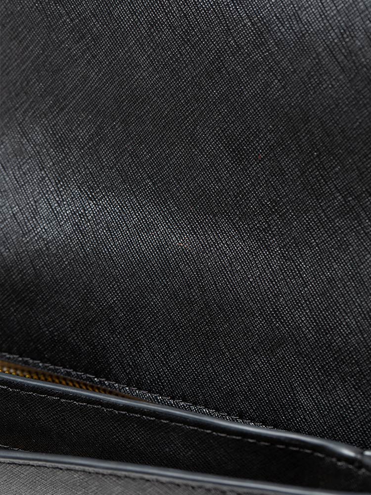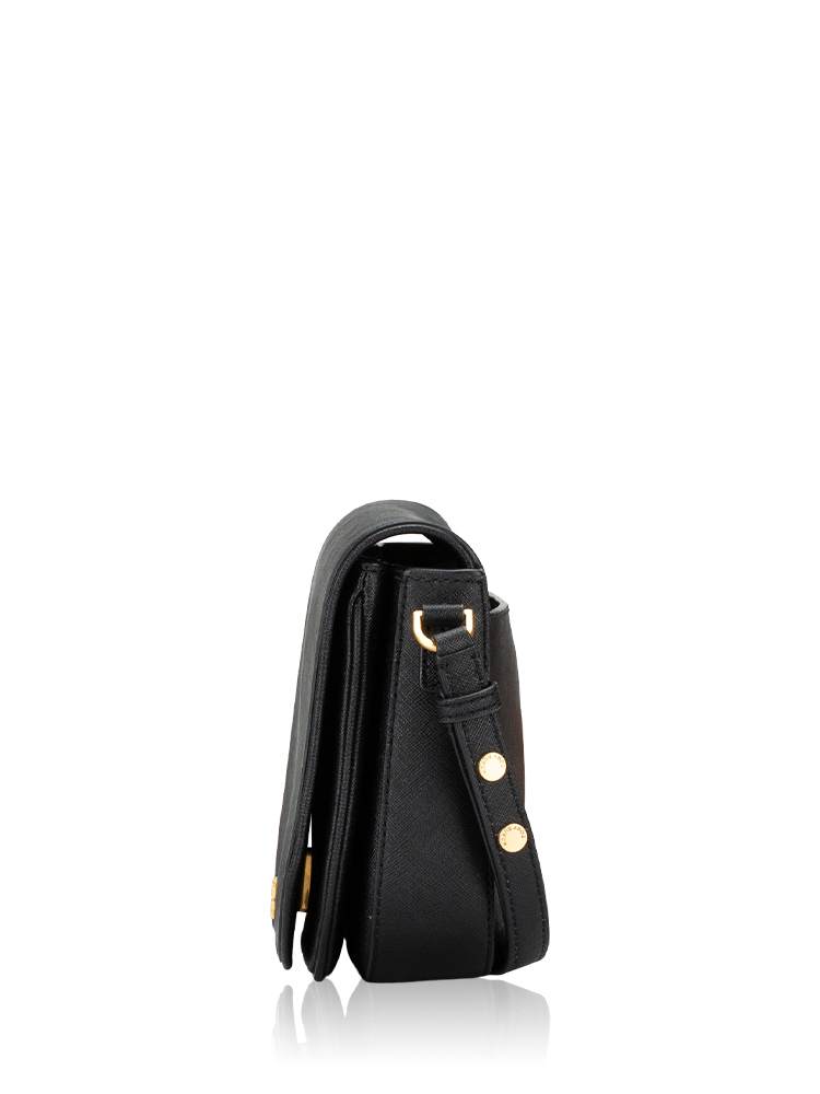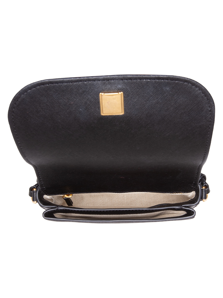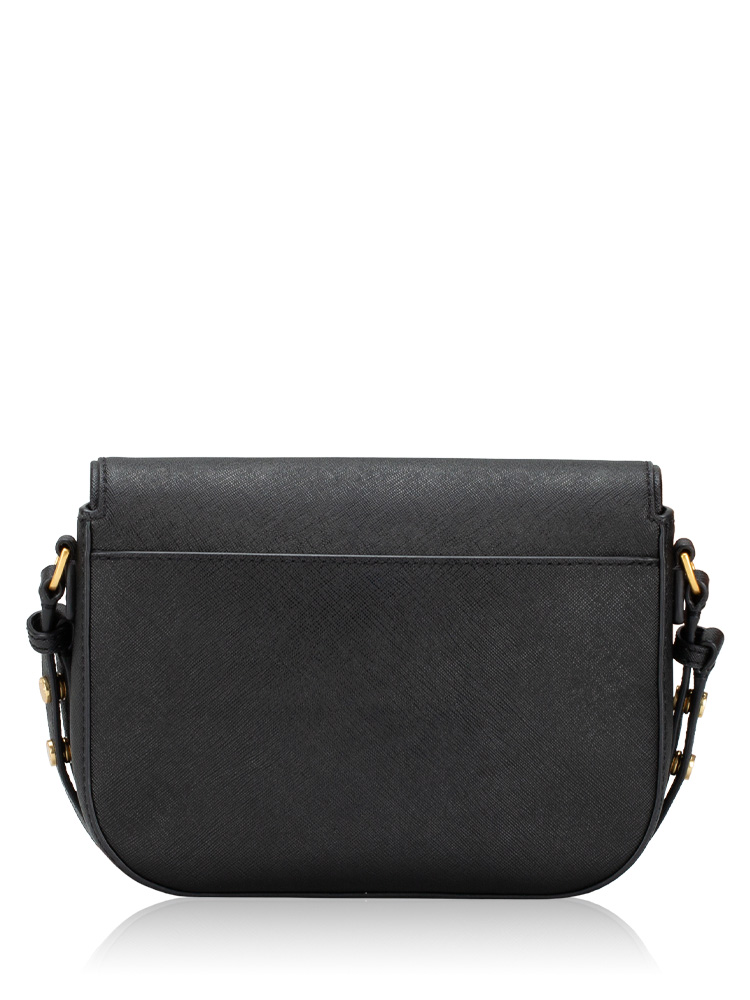 Made of saffiano leather. The bag features a magnetic closure that opens to canvas lining with one slip pocket, one zip, pocket, exterior one slip pocket at back, adjustable strap.